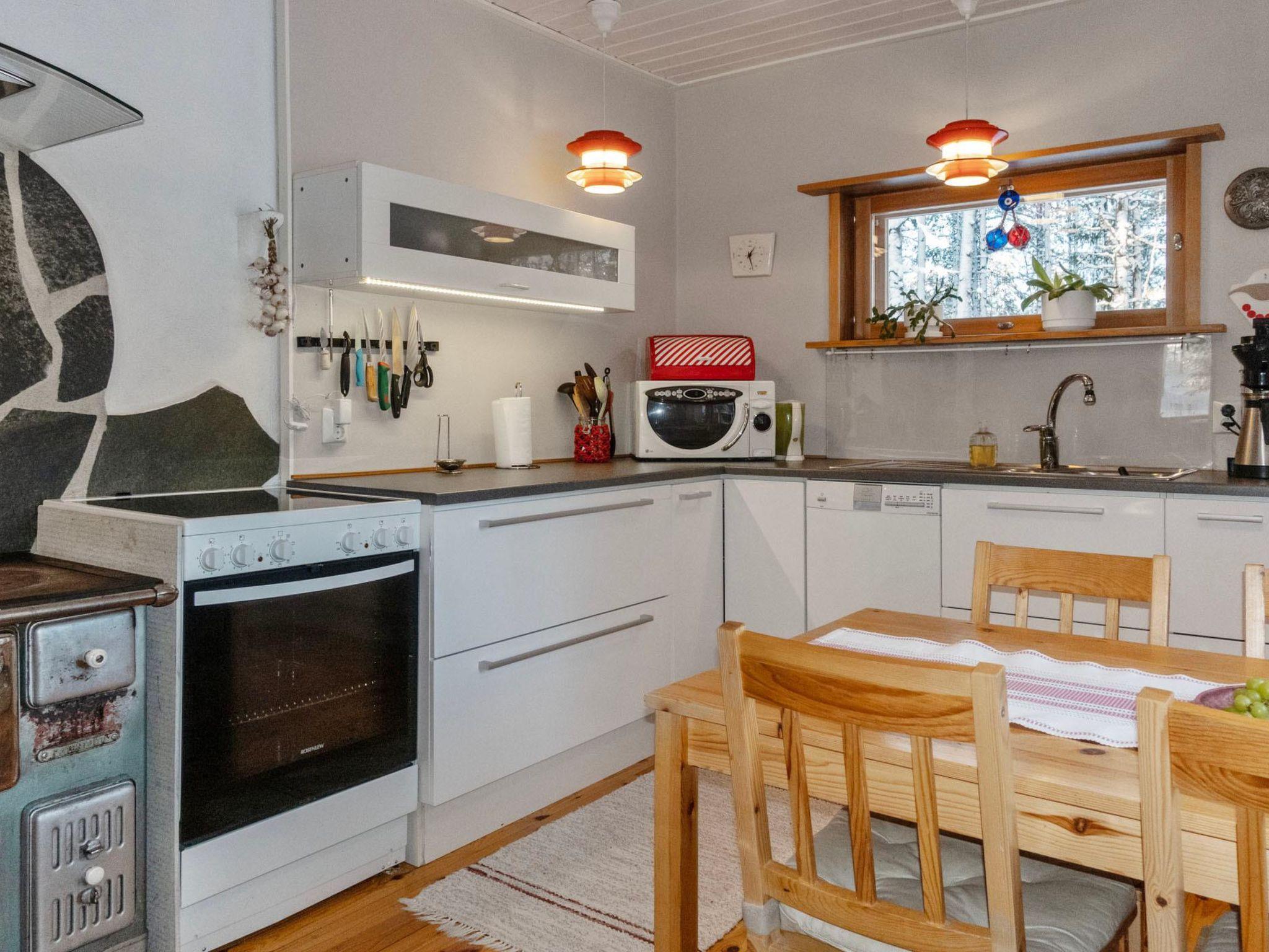 The cabin is heated primarily with electric radiators and an air source heat pump. A wood-burning baking oven and a wood stove are secondary and mainly sources of heat that bring comfort.