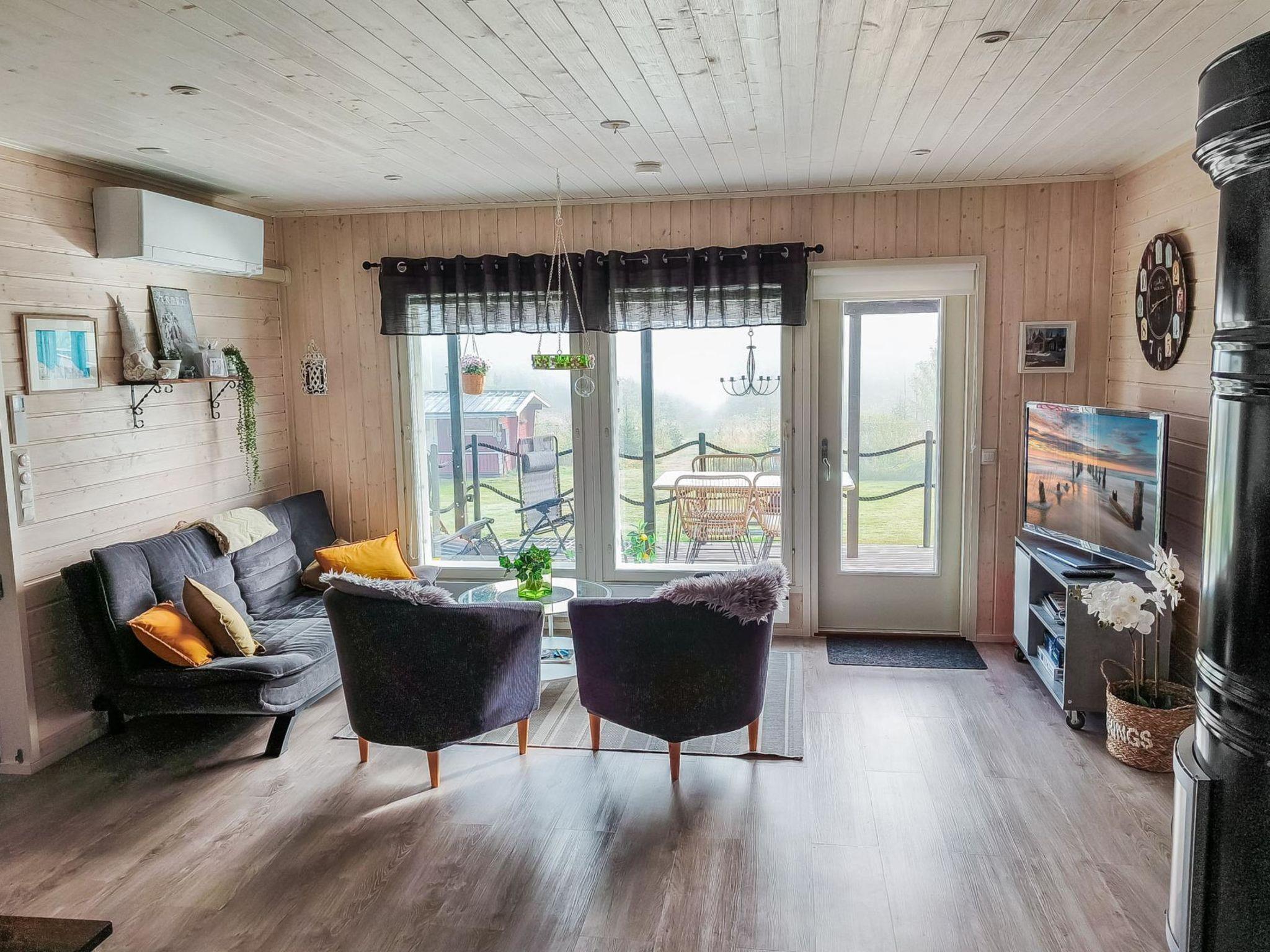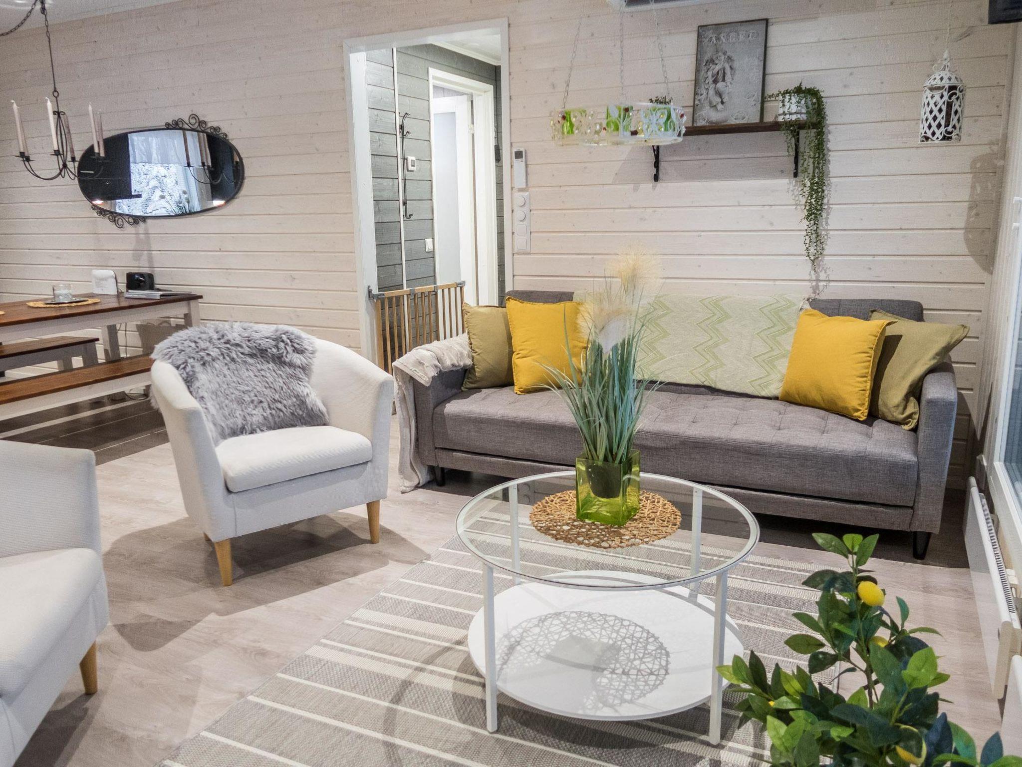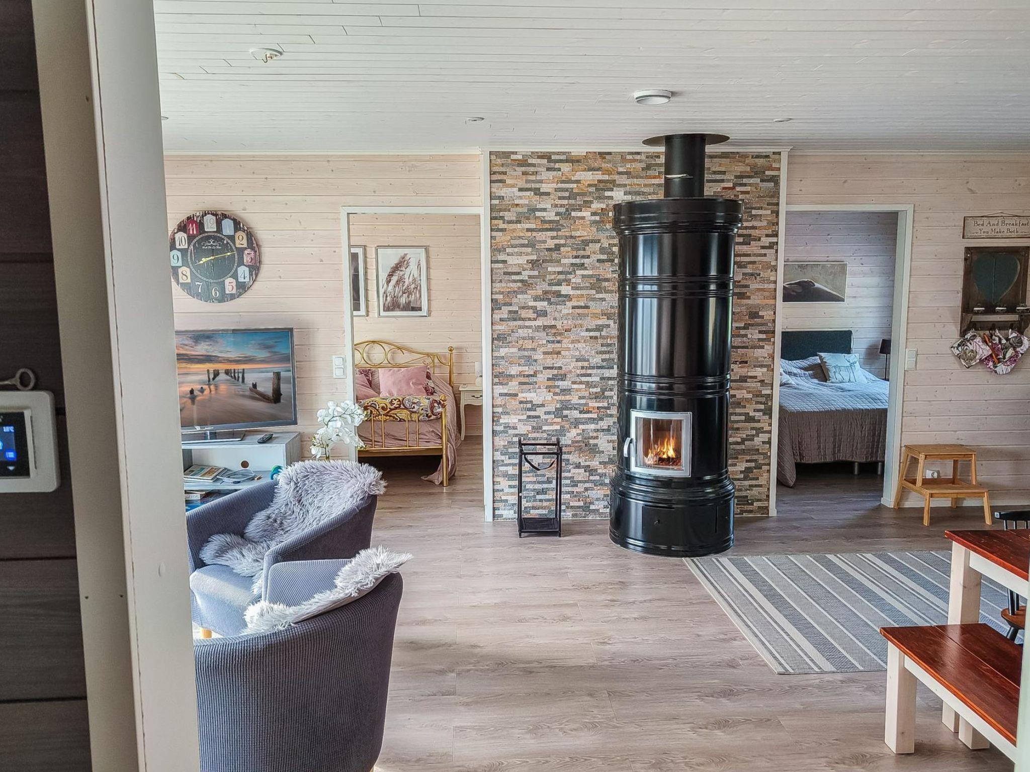 The total area of the villa is 70 m², on one floor. Spacious and bright living room/kitchen, dining set for 6-7 people. Two bedrooms with sliding doors, with double beds and wardrobes. Access from the living room to a spacious covered terrace with furniture and gas grill in the summer. In the living room there are one sofa bed (120 cm) and a folding extra bed (80 x 200 cm). A separate WC, shower and sauna with a twinkling starlight and a Harvia-brand pilar-style electric sauna stove provide atmospheric baths. Fireplace in the living room, kitchen equipment: airfryer, coffee maker, toaster, kettle, etc.