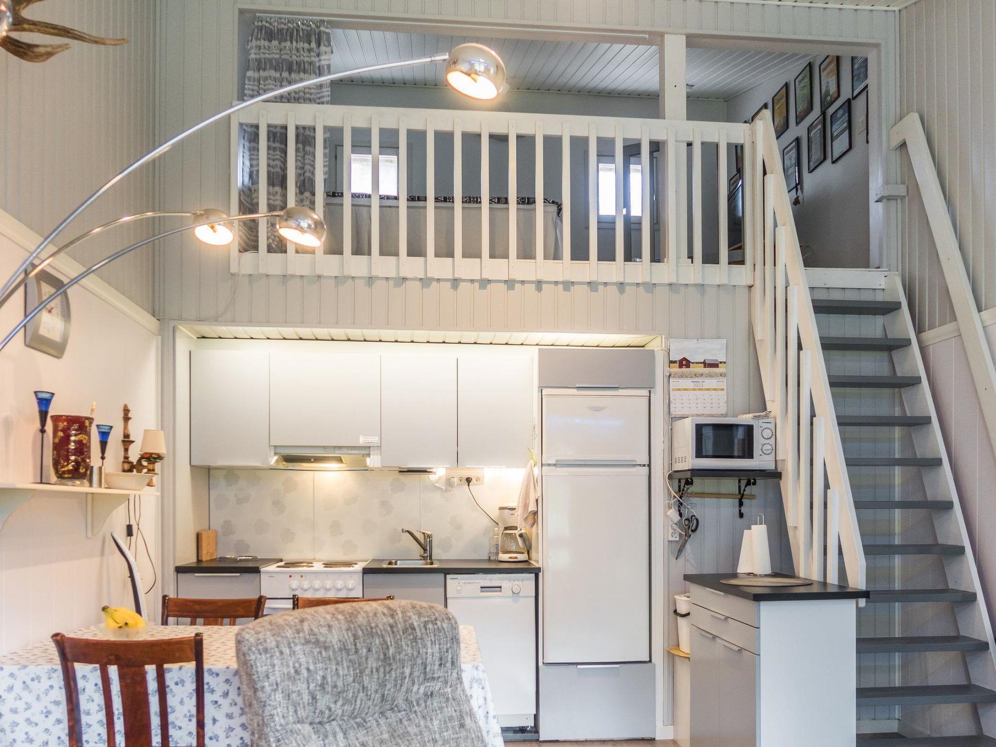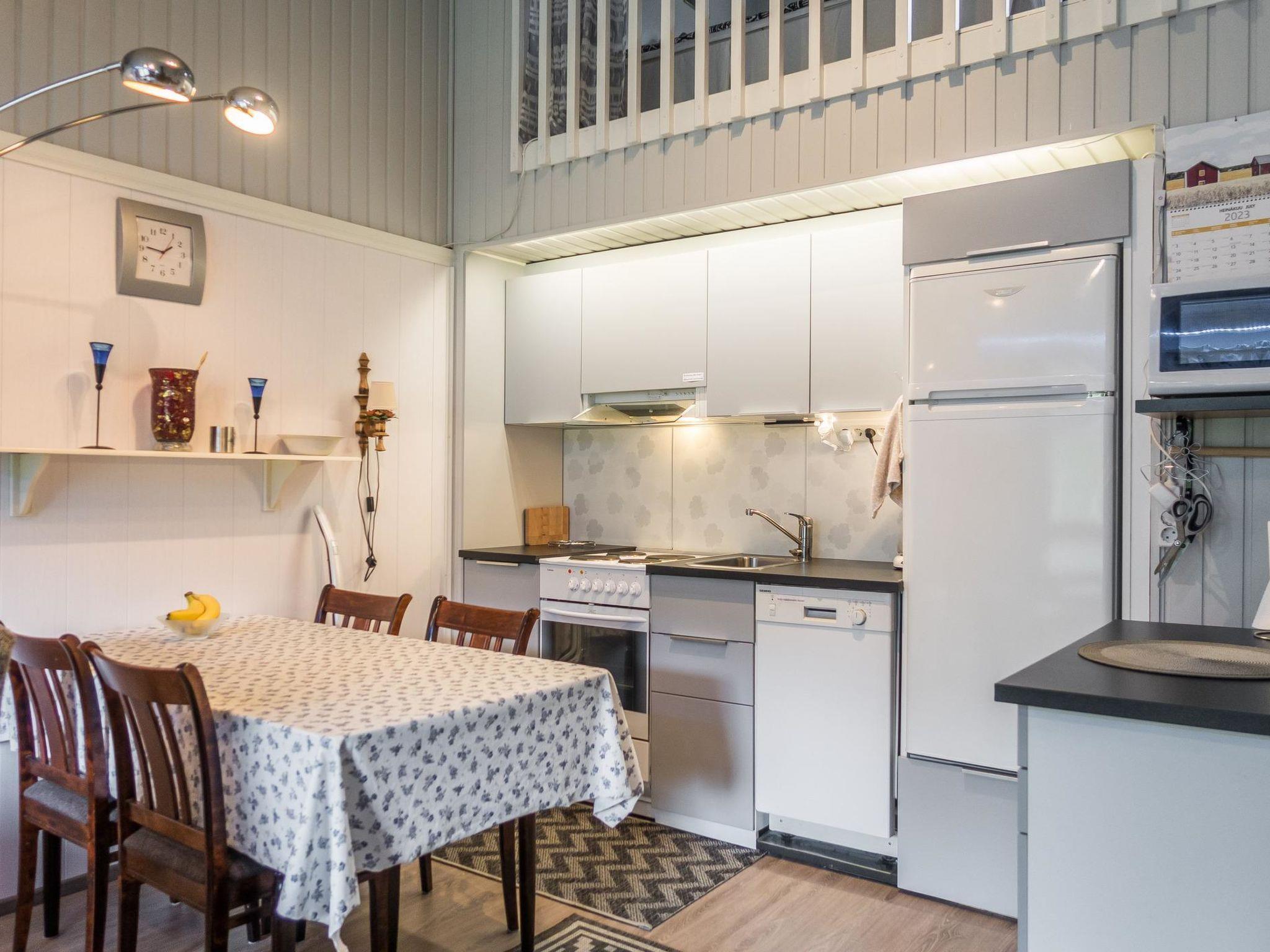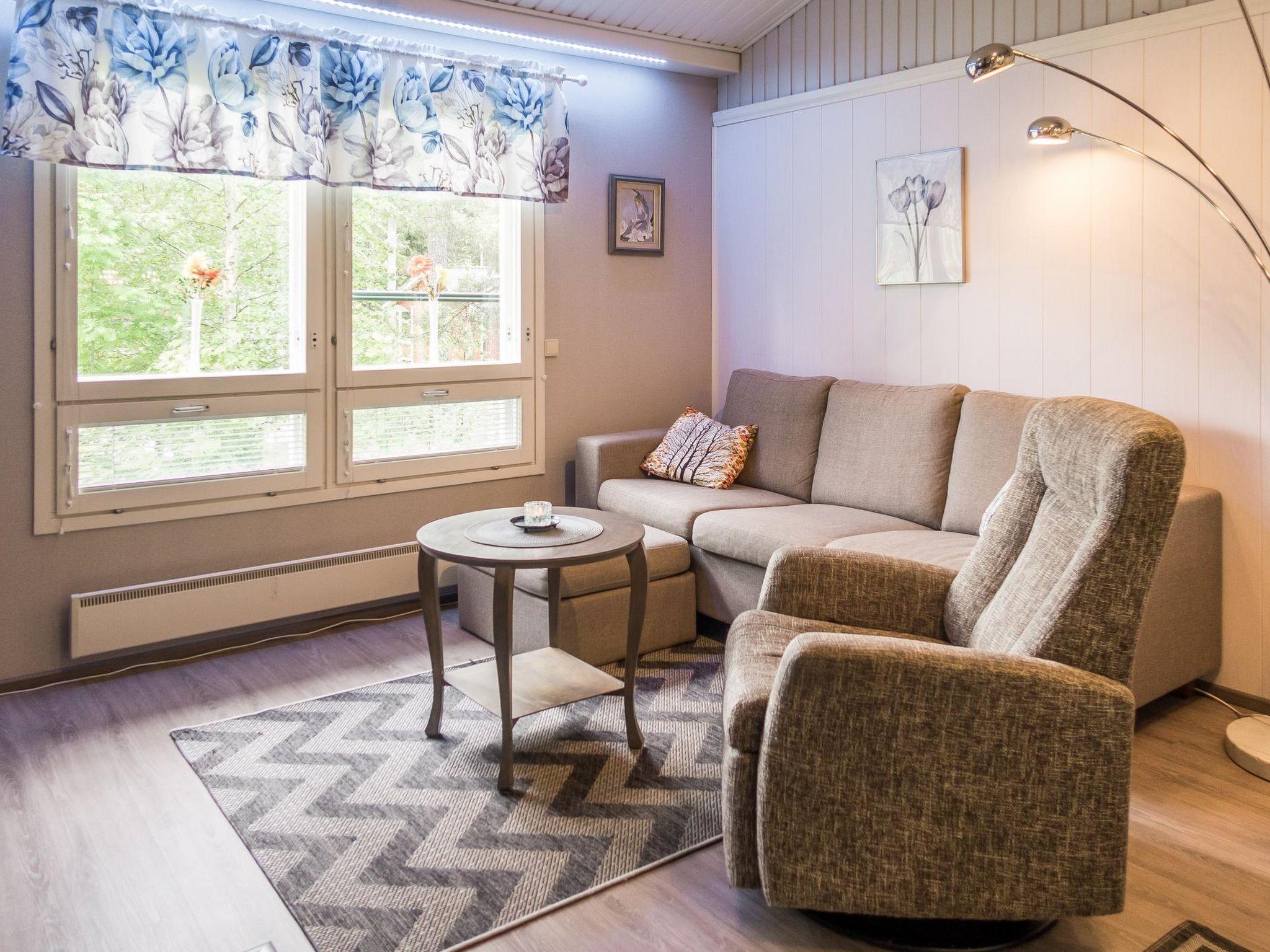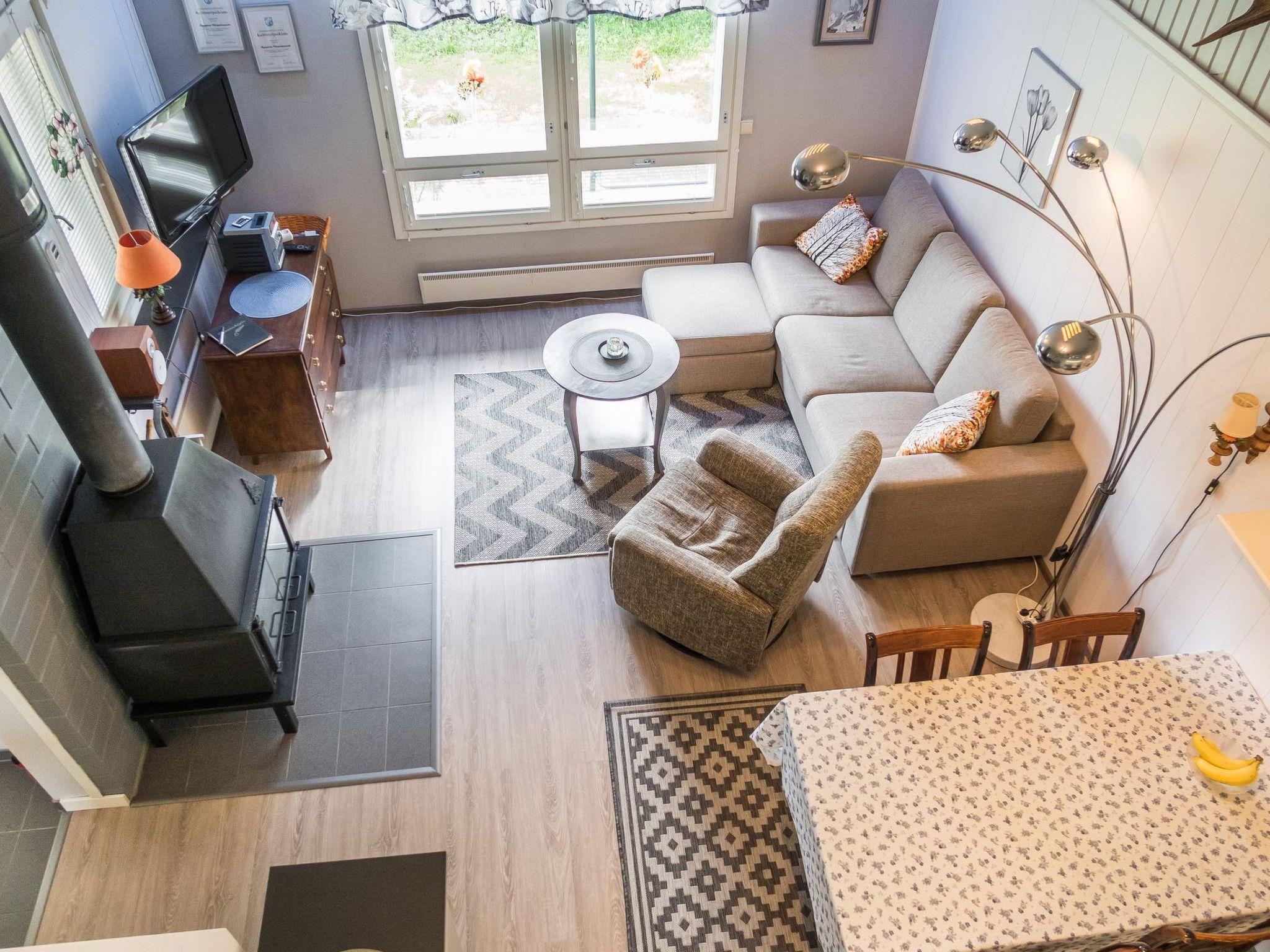A wooden semi-detached apartment built in 1989 is located in nice location in Vuokatti's slope center. Living space 58 m², includes loft 9 m². Downstairs with a living room / kitchen with a dining set for 4 and a wood-burning fireplace creating atmosphere and warmth. Double bed in the bedroom, sauna (electric stove), washroom/toilet. Steep stairs to the loft, with separate beds for two. Covered terrace and garden furniture, grill available in summer.