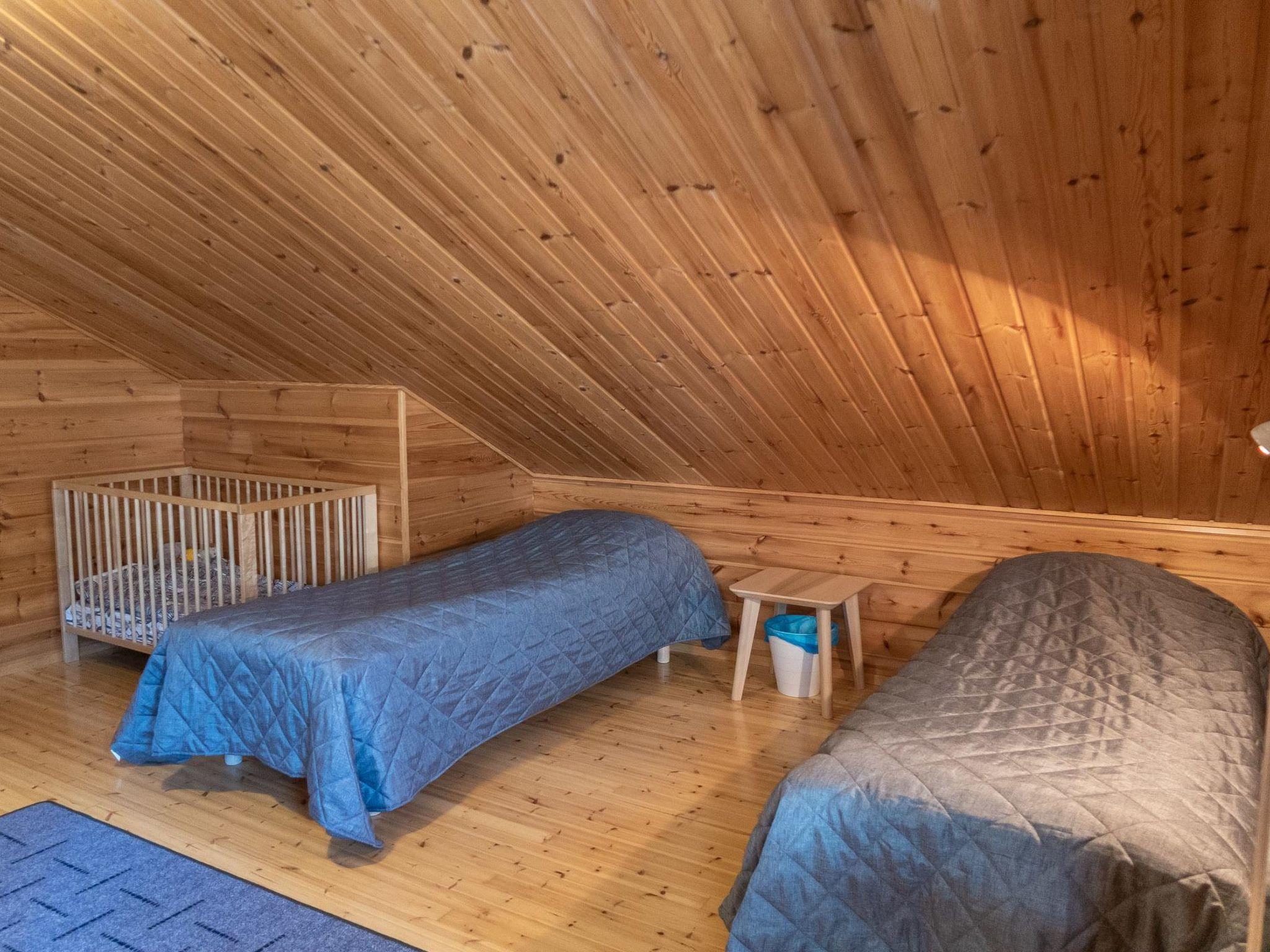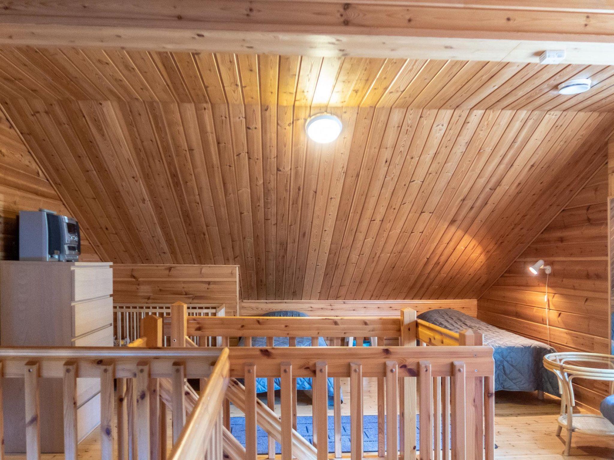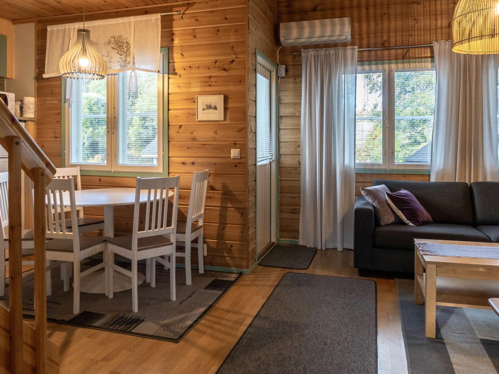 Floor area 60m², loft 35 m². On the ground floor there is combined living room & kitchen, one bedroom with twin bed, sauna (electric heating), washroom/toilet. Upstairs there is loft vestibule with separate beds for four and alcove with 120cm bed. Terrace with furniture.