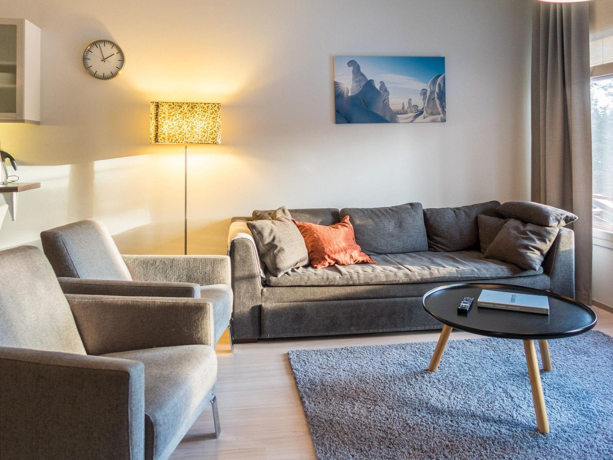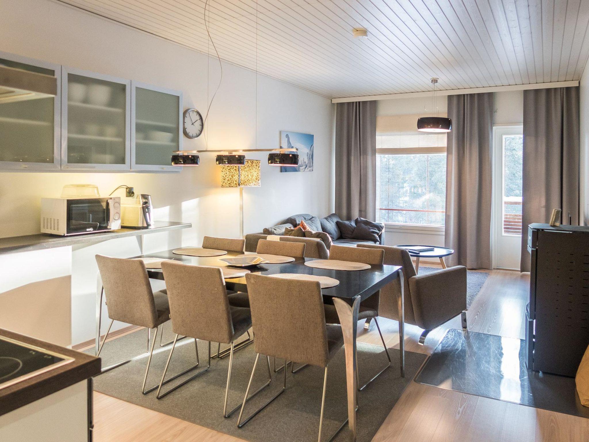 A cozy holiday apartment built in -08 in a two-story cabin house located in the center of Vuokatti. The apartment is located on the lower floor (balcony at ground level). The area of ??the apartment is 62 m² on one level - a kitchen-living room with a sofa bed for 1-2 guests, a dining area for 6 and a light fireplace. Sleeping areas in two bedrooms, one with a double bed (180cm), and the other with separate beds for two (90cm). Sauna (electric stove), shower/toilet and separate toilet. Access to the balcony from the living room, with patio furniture for 4. The apartment has a view of the slopes of Vuokatti, facing the forest.