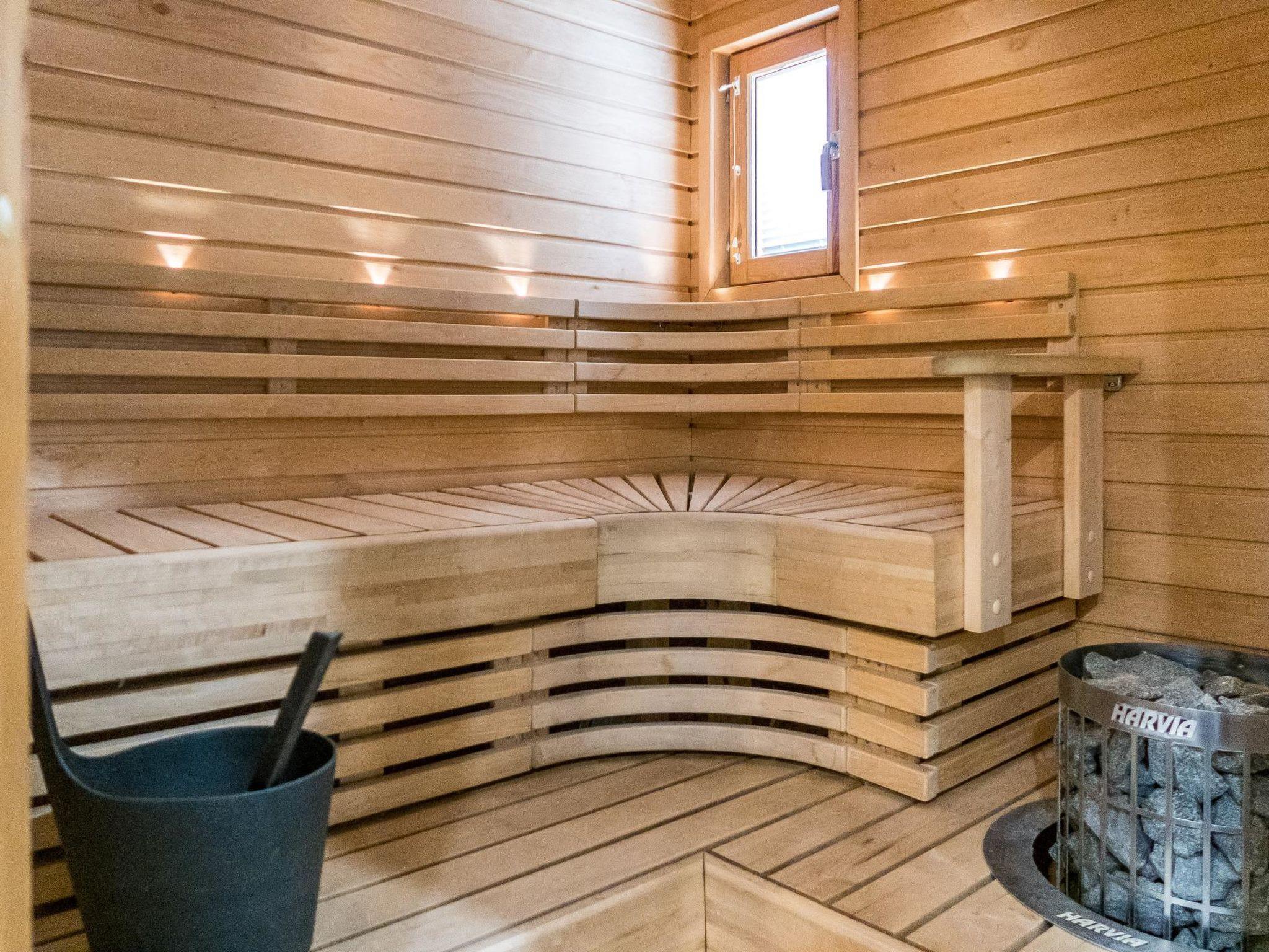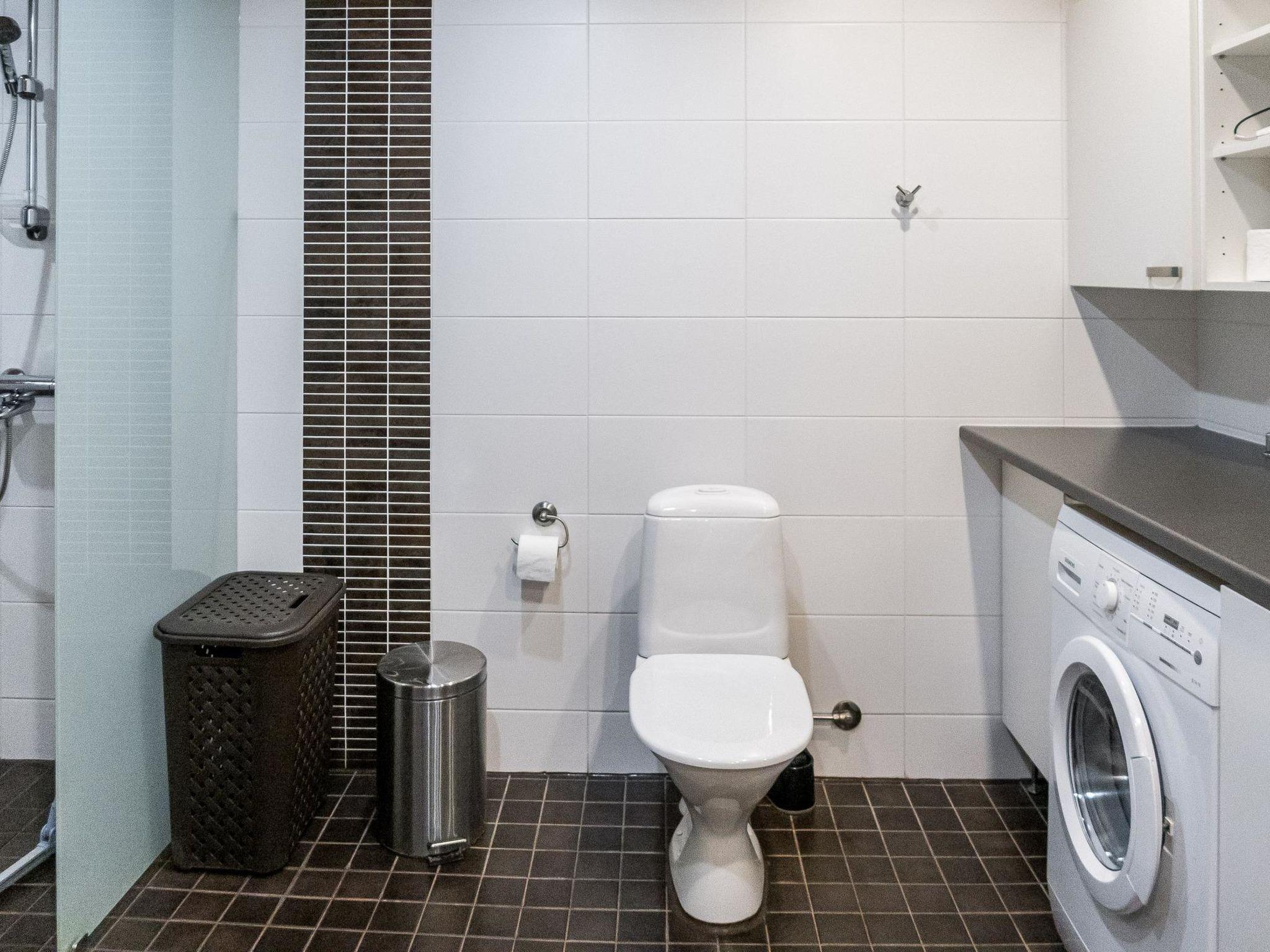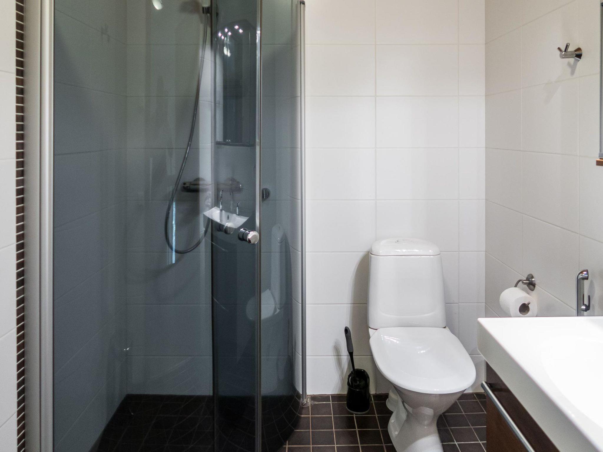 Living area 114 m², on two floors. Downstairs, kitchen-dining room and lounge, bedroom (double bed), washroom with toilet and two showers, sauna (electric heater).