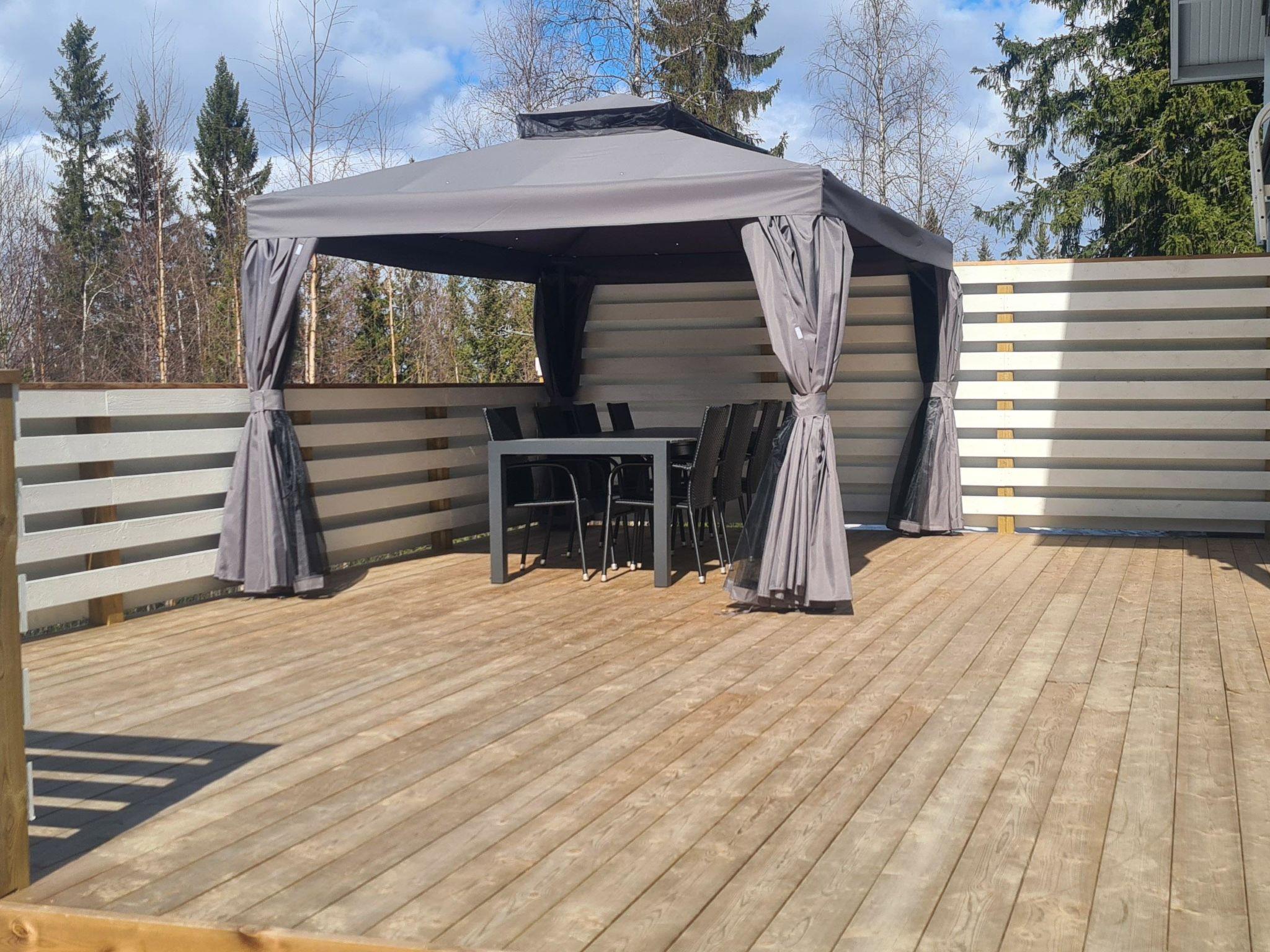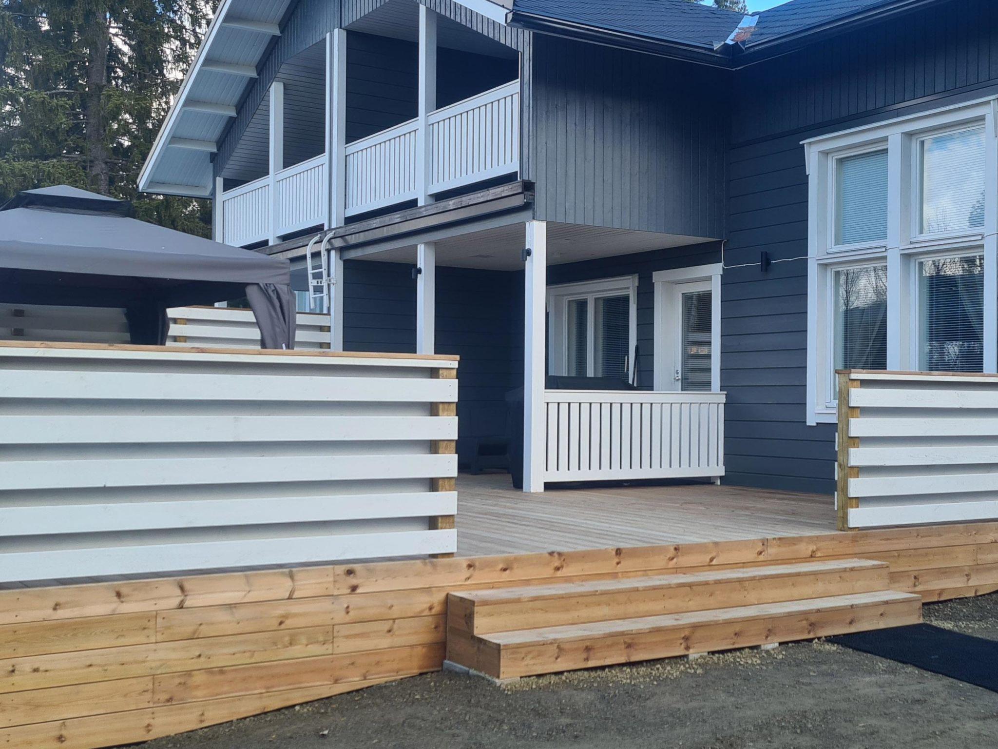 This semidetached house located in a silent place in Vuokatti. Completed in 2010. Living area 114 m²; combined living room & kitchen, sauna (electric heating), washroom with two showers and toilet. 4 bedrooms: three bedrooms with twinbed and one bedrooms with separate beds. Two extra beds in bedrooms and one sofabed (140 cm) for 1-2 pers, total bed places for 10+2. Shower/toilet also on the 2nd floor.