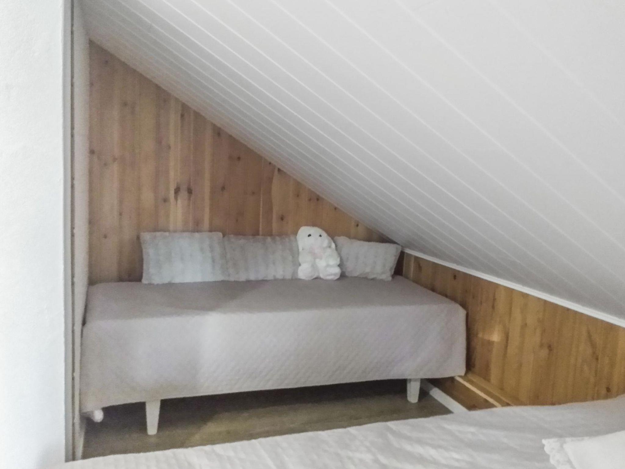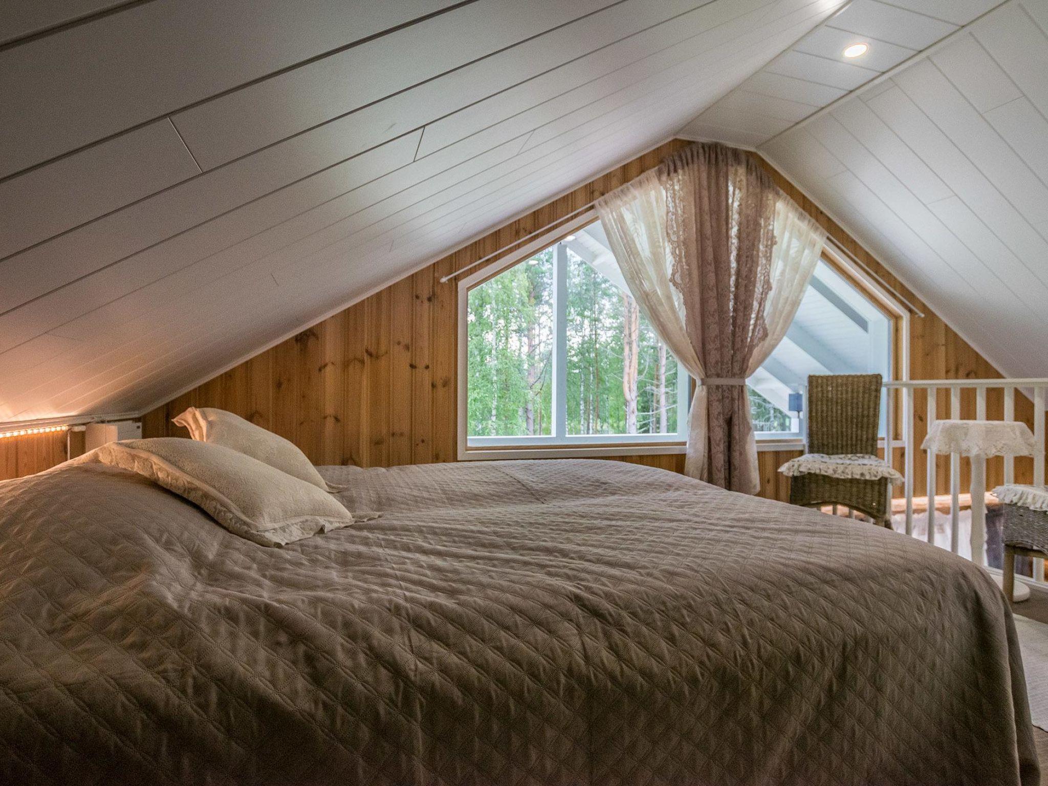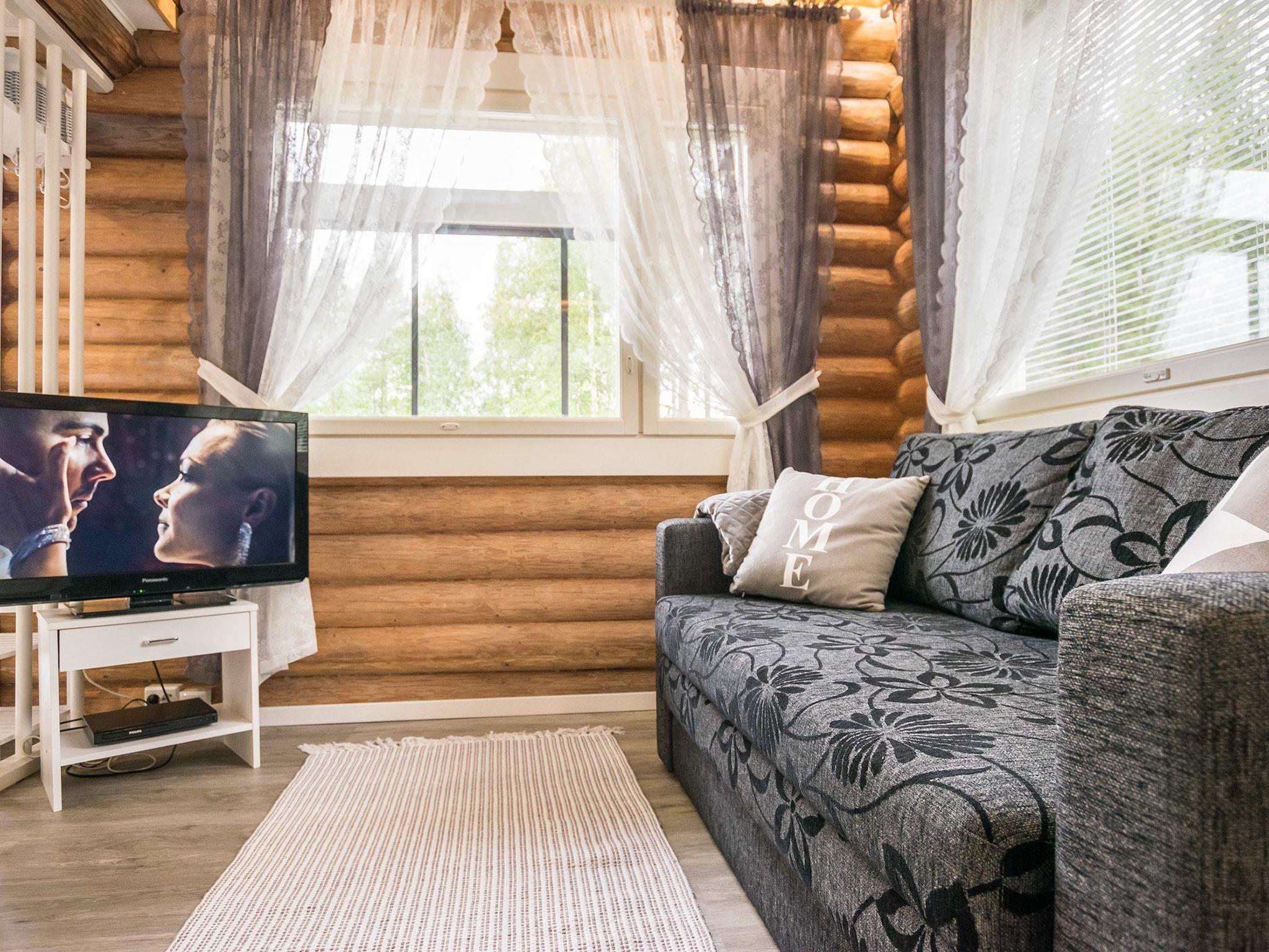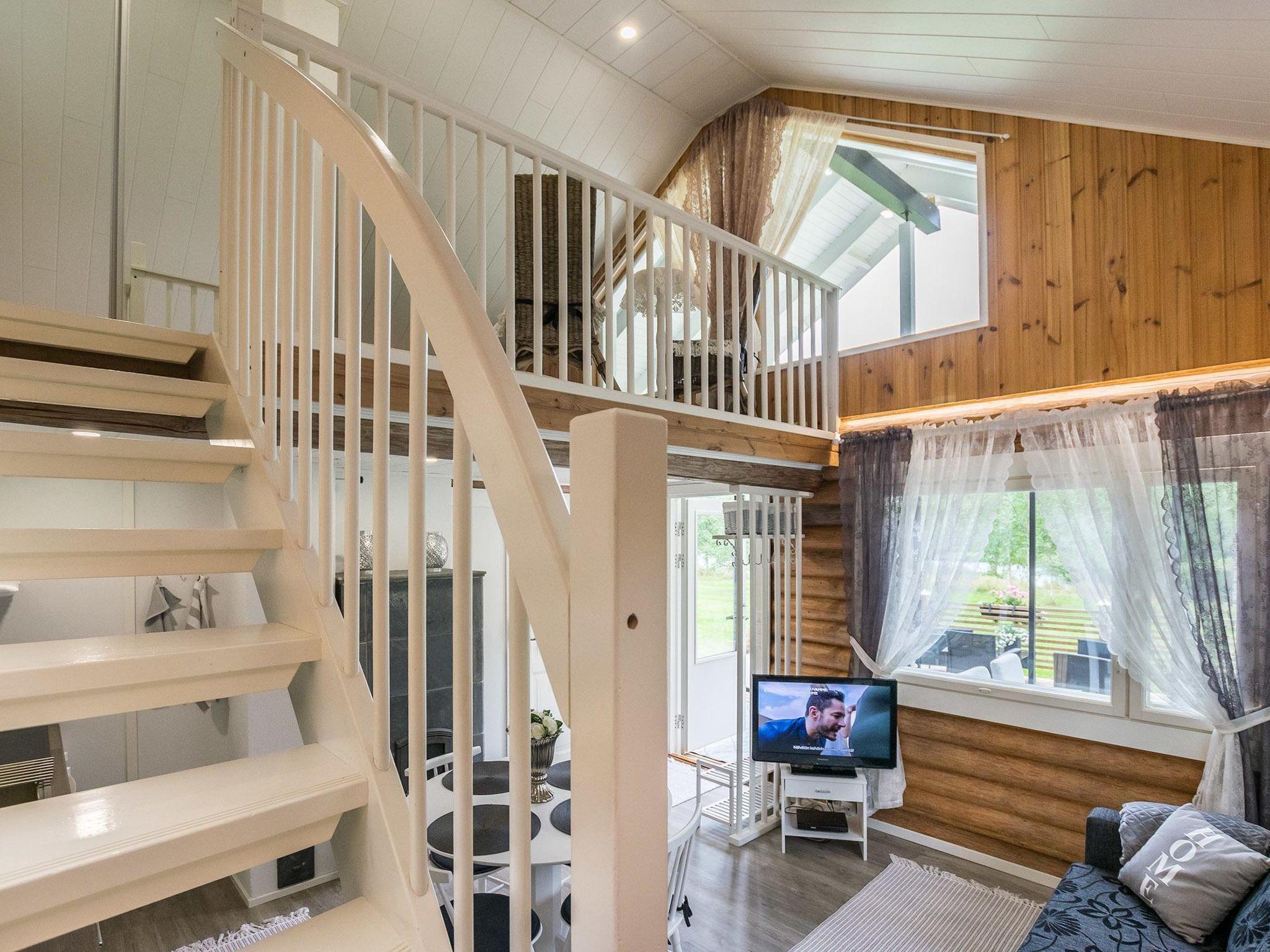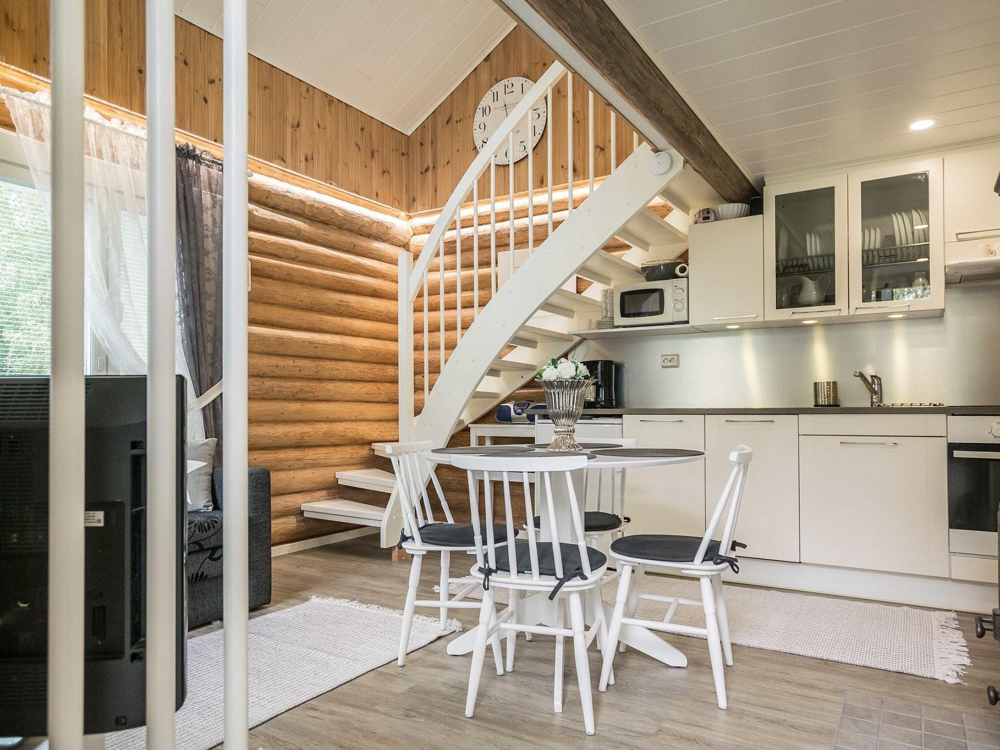 Log-built cabin 2021, living room with kitchen, dining group, TV and sofa bed (135x200 cm bed). Double bed and extra bed (140 x 196 cm) for one in the loft.