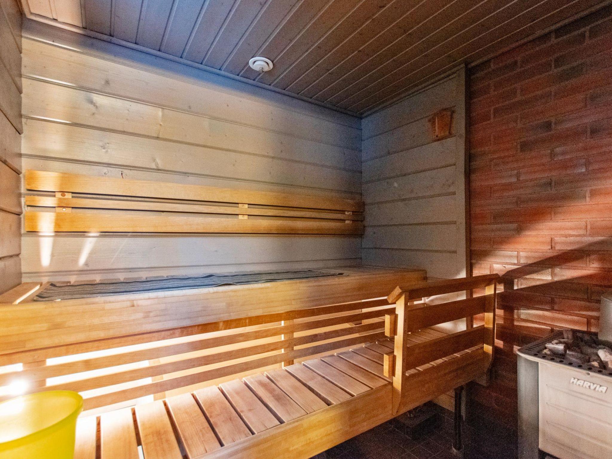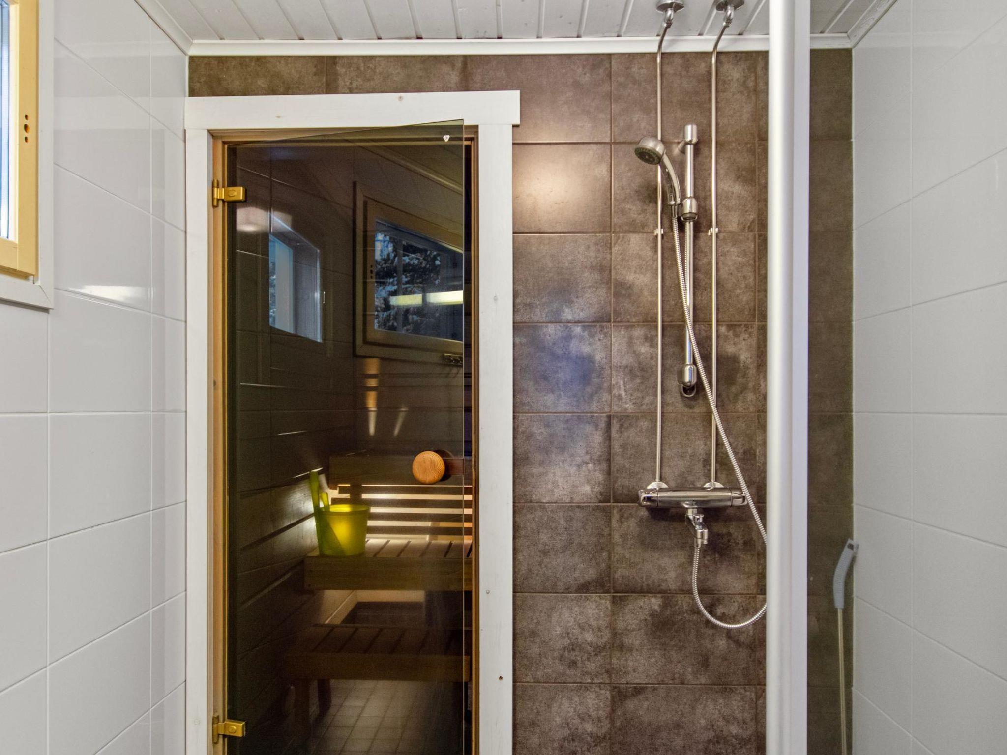 The sauna is equipped with a wood-burning stove, and the washroom includes a shower and a WC. In the yard, there is an atmospheric grill hut, and the terrace also has a gas grill. Steep stairs lead from the cabin down to the shore. The shallow shoreline has a sandy bottom. There is about 1 meter of water depth at the end of the pier.