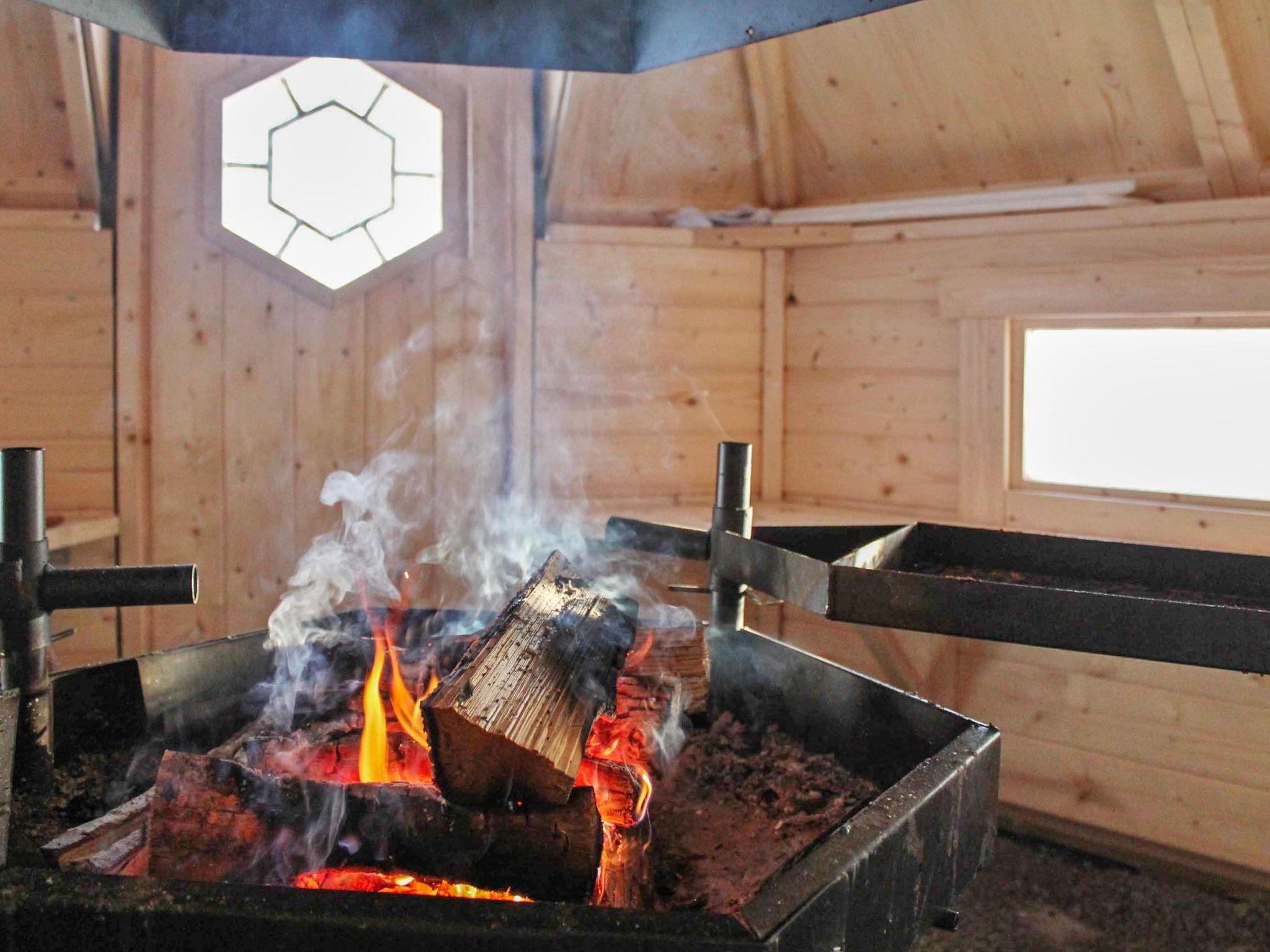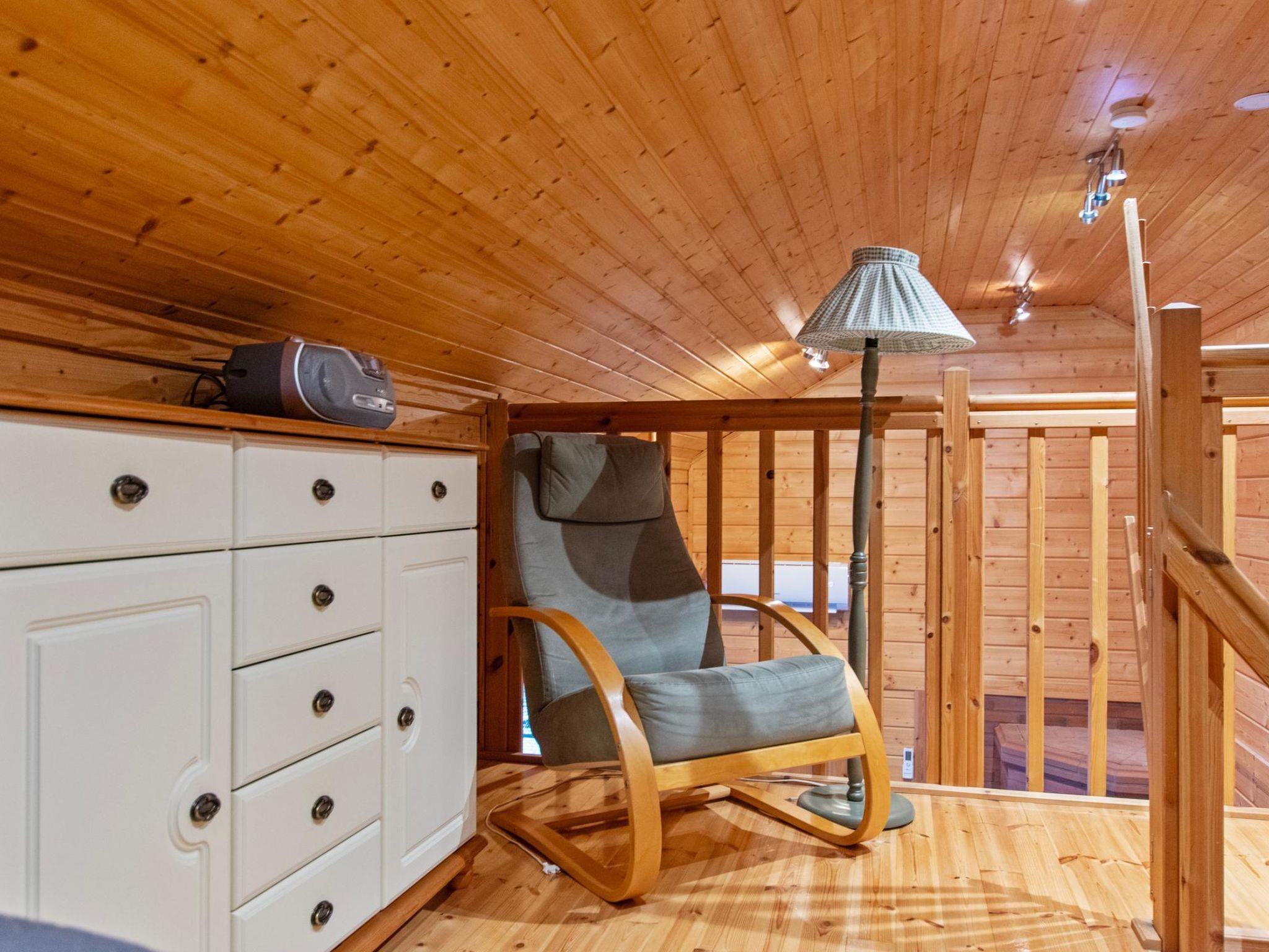 This planed log cabin (built in 2007) features a kitchen with a dining table for four, a living room with a sofa set, a heat-storing fireplace, a TV, and an air-source heat pump. The ground floor has two bedrooms, each with two beds. The loft has three beds.