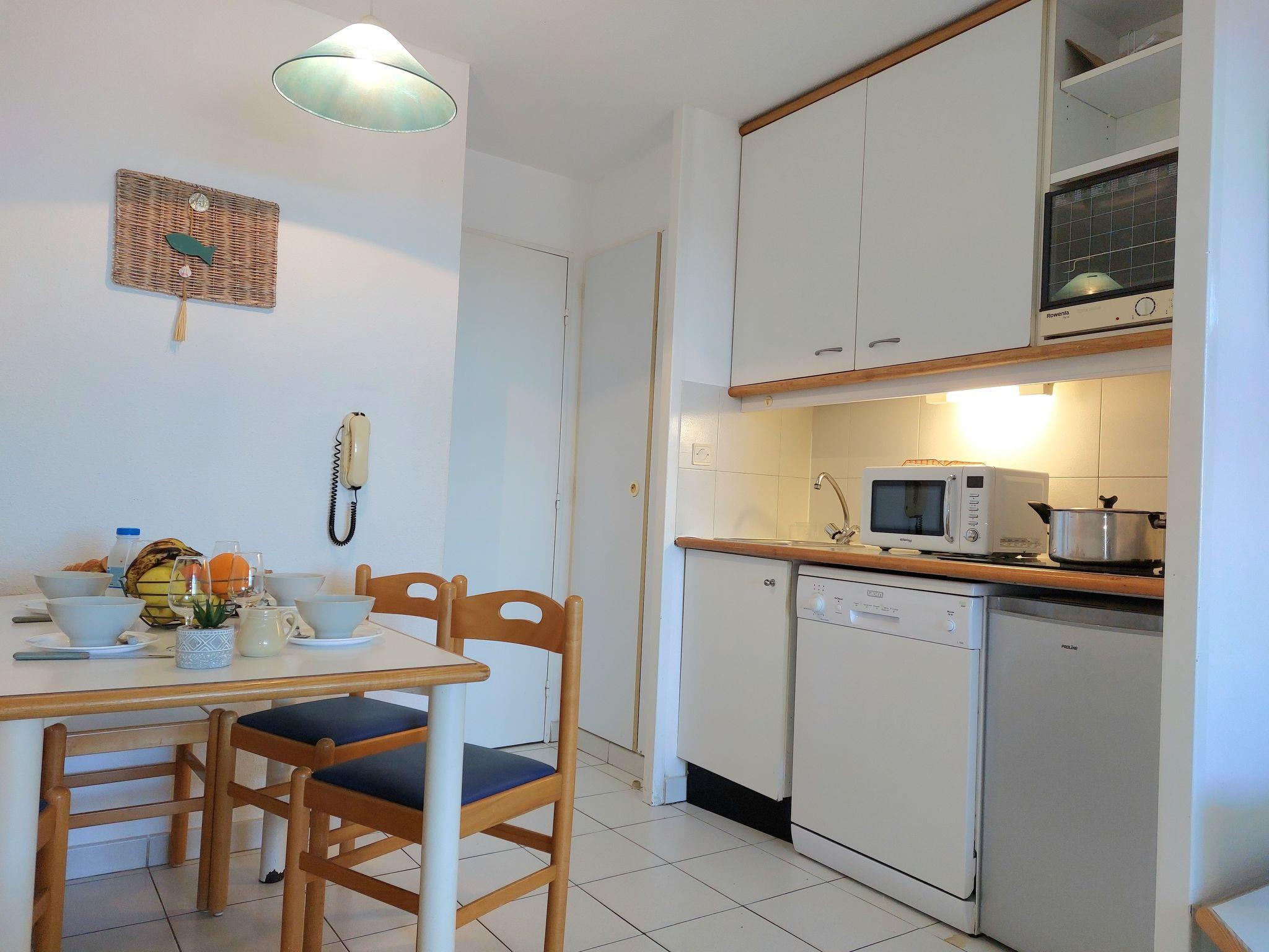 "Le Village (B1 331)", 1-room studio 28 m2 on 1st floor. Object suitable for 2 adults + 2 children. Living room with 2 sofabeds (80 cm, length 190 cm), TV (flat screen). Exit to the terrace. Sleeping alcove with 1 x 2 bunk beds (80 cm, length 190 cm). Kitchenette (4 hot plates, oven, dishwasher, toaster, kettle, microwave, electric coffee machine, Capsules for coffee machine (Dolce Gusto) extra). Bath/WC. Electric heating. Terrace 8 m2. Terrace furniture. Facilities: Internet (WiFi, extra). Parking (1 car). Please note: non-smokers only. Maximum 1 small pet/ dog allowed. Smoke alarm. Instead of an enclosed bedroom, some sleeping areas are located in an open-plan area (gallery, alcove, etc.). Offer by a private individual according to Art. 155, IV of CGI.