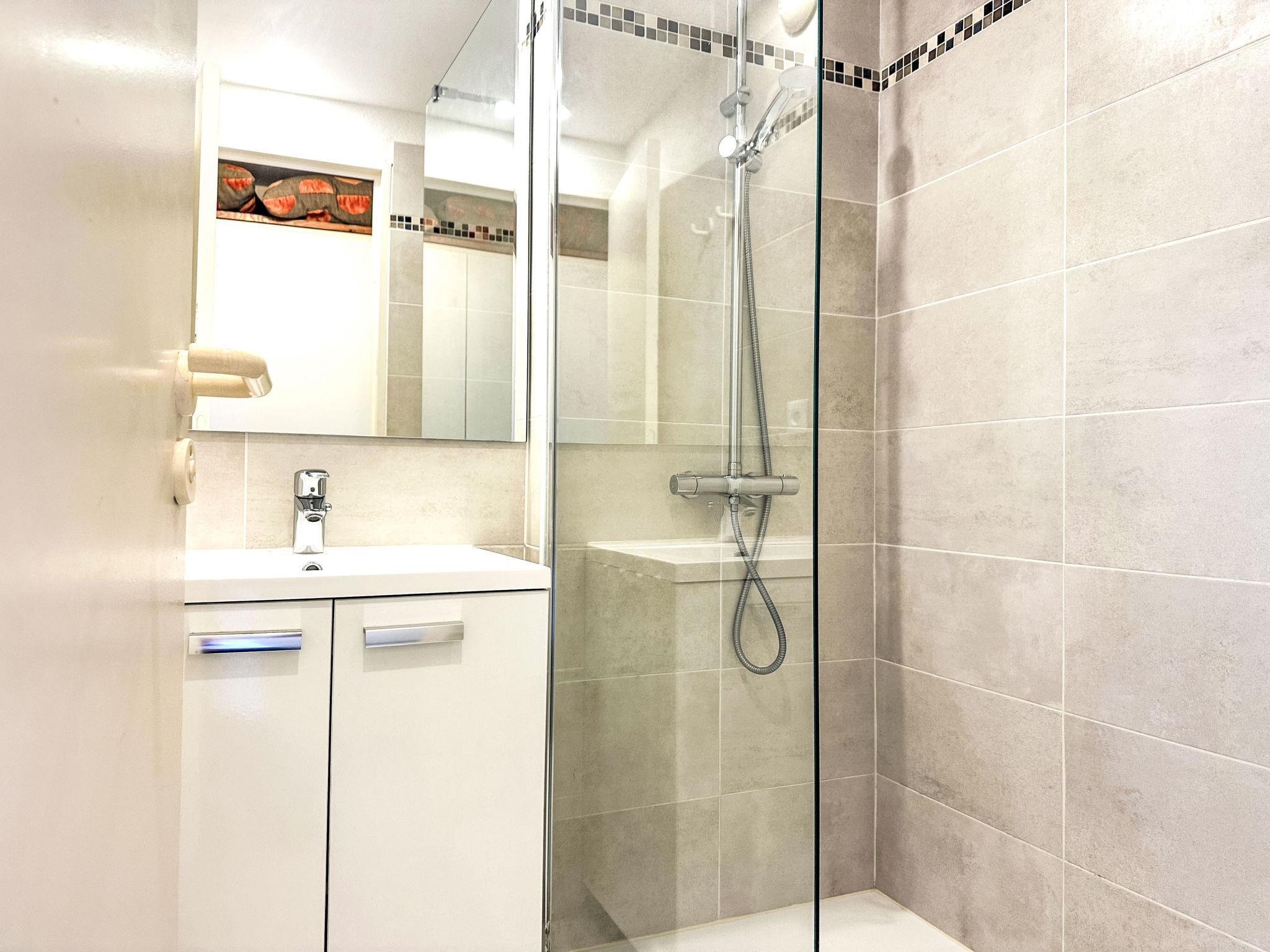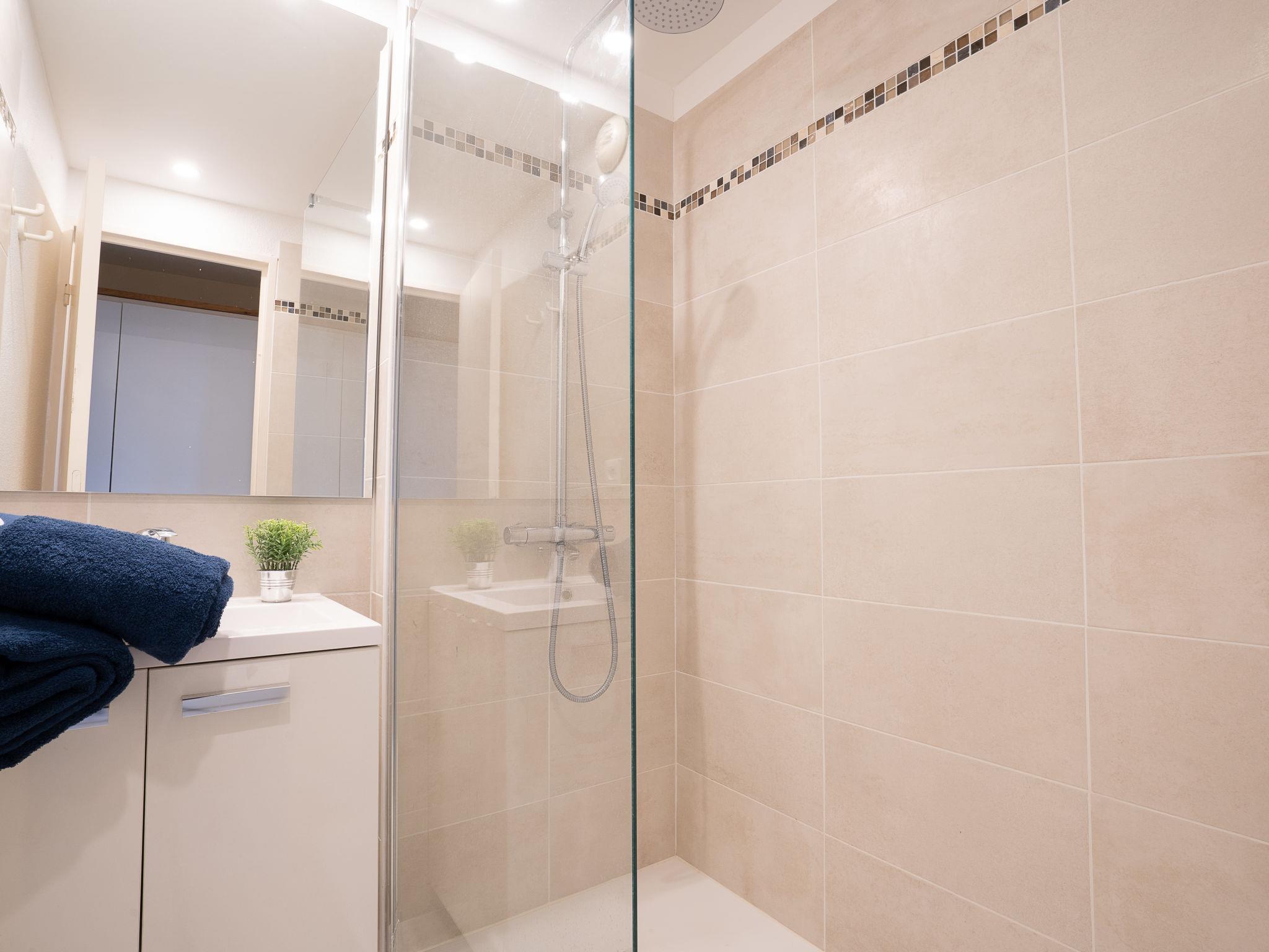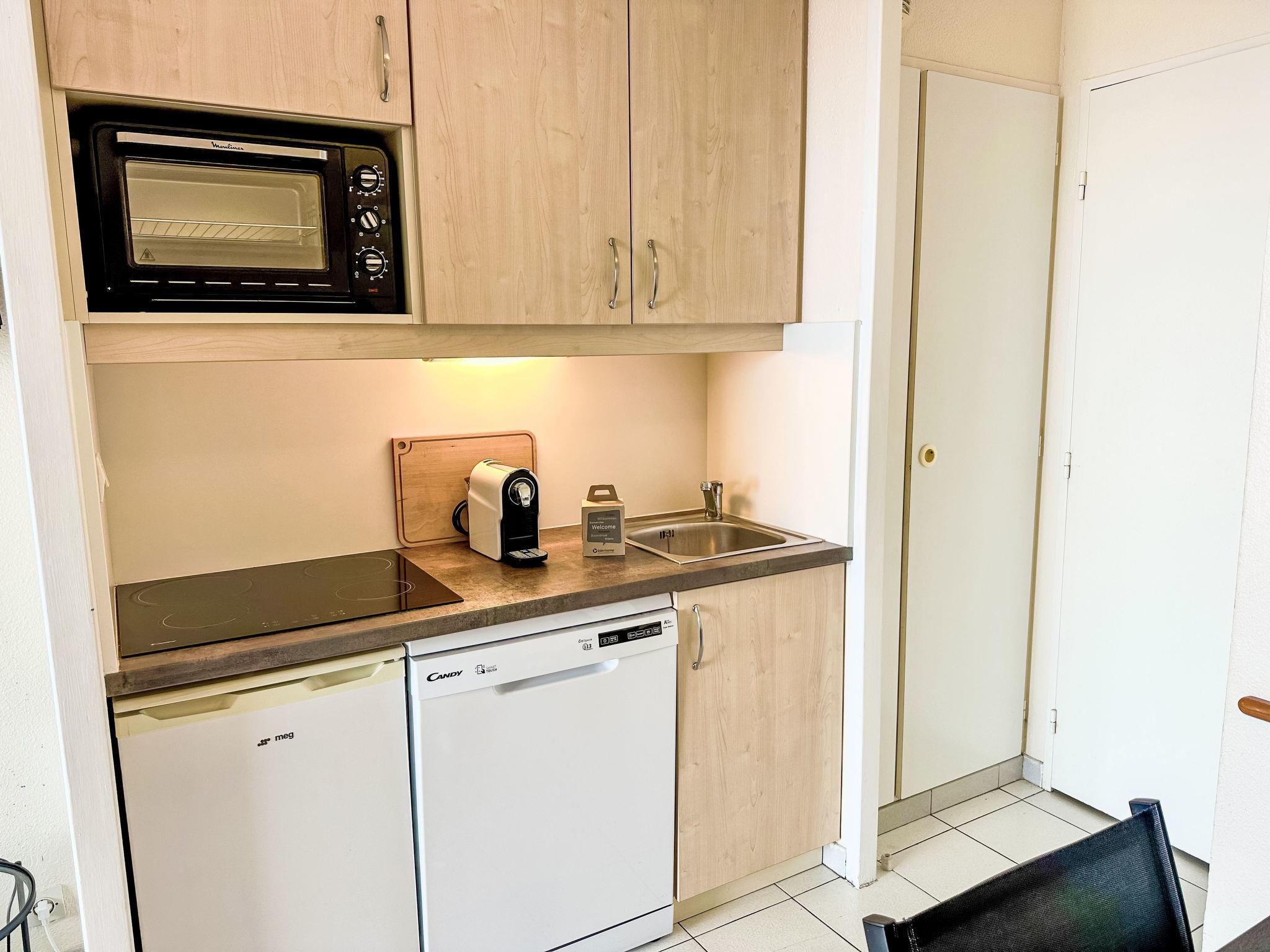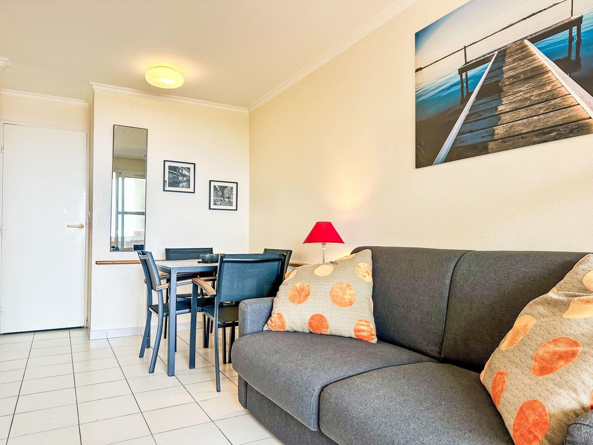 "L'Esquinade (G4 126)", 2-room apartment 28 m2, on the ground floor. Living room with 1 sofabed (140 cm, length 190 cm), TV (flat screen). Exit to the terrace. 1 room with 1 french bed (140 cm, length 190 cm). Kitchenette (4 hot plates, dishwasher, toaster, kettle, microwave, electric coffee machine, Capsules for coffee machine (Nespresso) extra). Shower, sep. WC. Electric heating. Terrace roofed. Terrace furniture. View of the sea. Facilities: Internet (WiFi, extra). Parking space n 2647 (roofed, 1 car), height 180 cm. Please note: non-smokers only. 1 small pet/ dog allowed. Smoke alarm. Offer by a private individual according to Art. 155, IV of CGI.