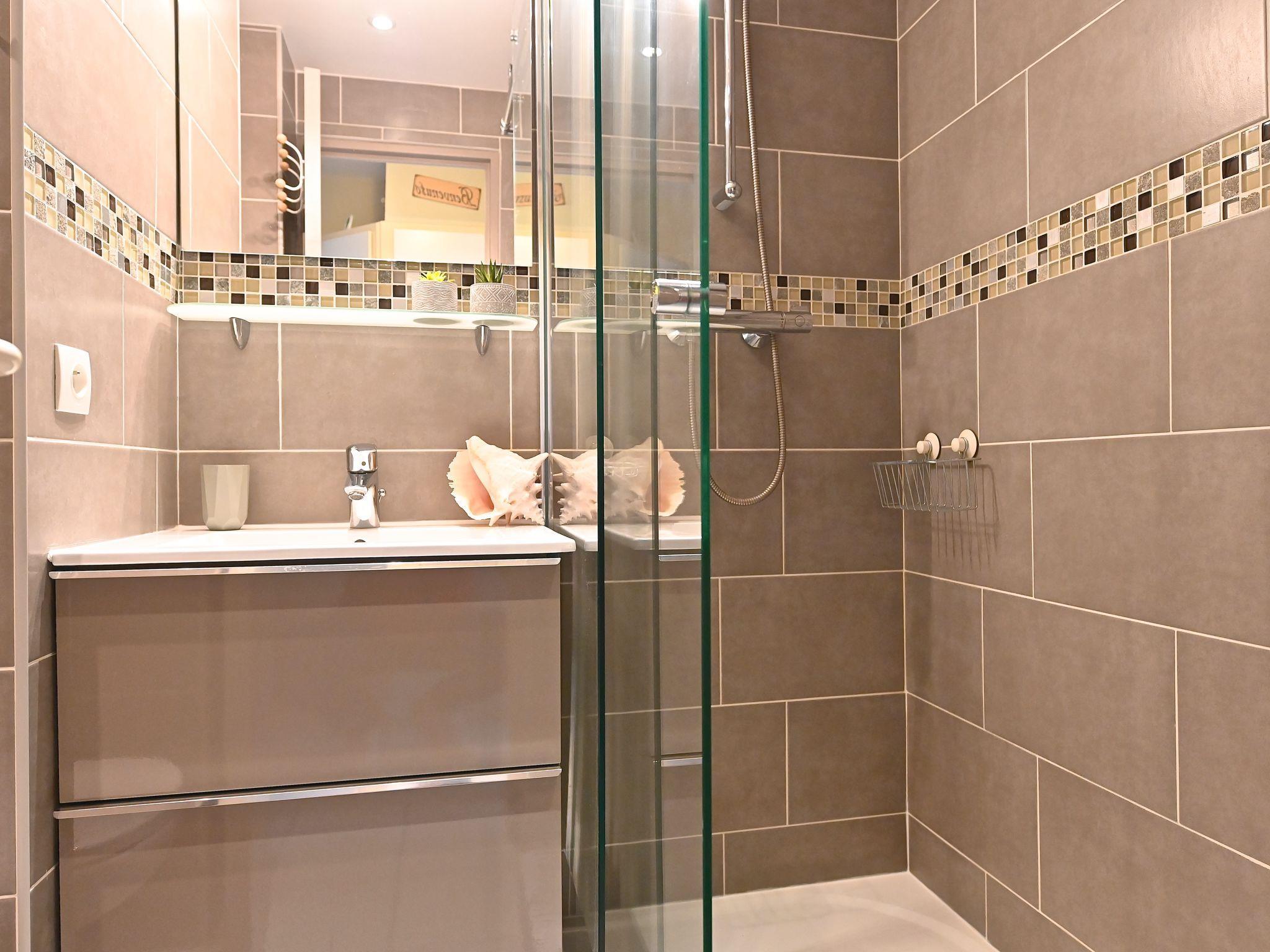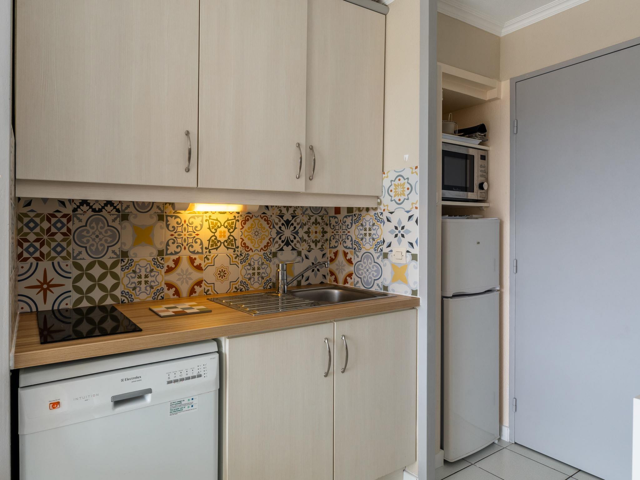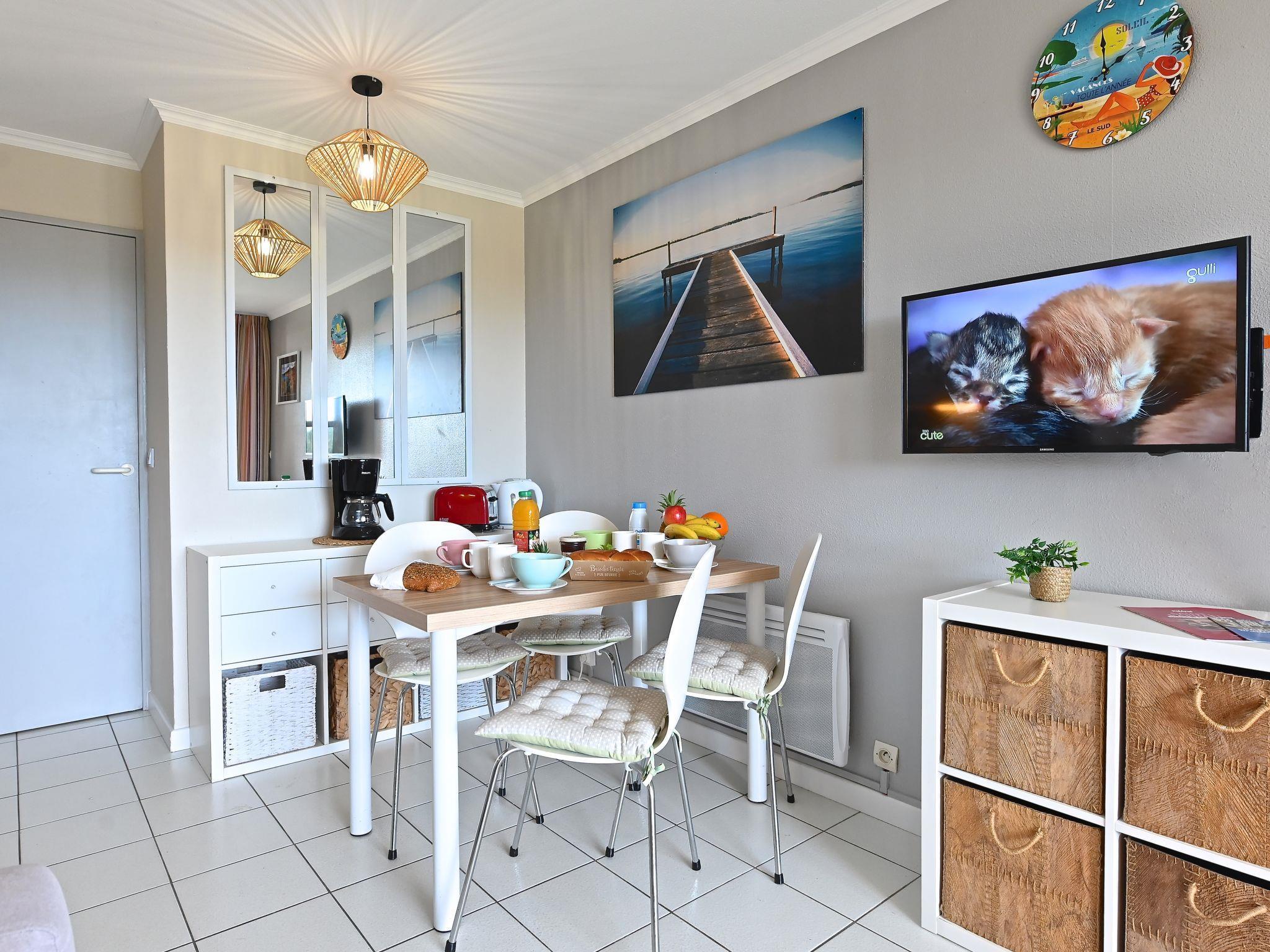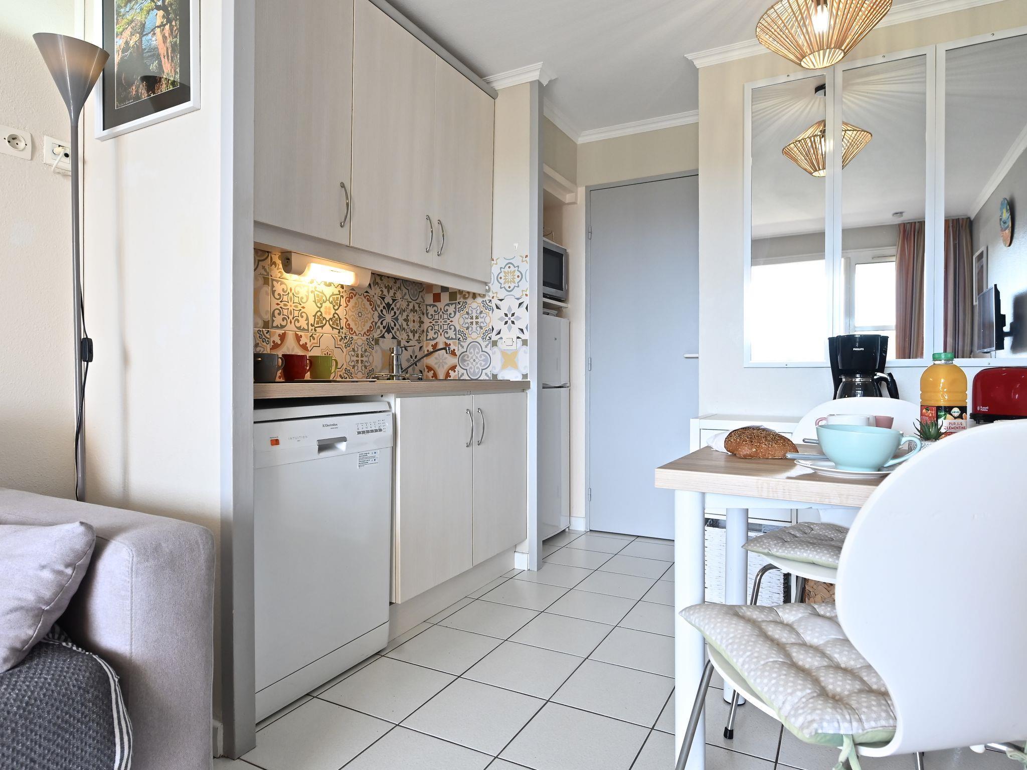 "L'Esquinade (F3 113)", 1-room studio 24 m2, on the ground floor. Object suitable for 2 adults + 2 children. Bright, renovated in 2022, comfortable furnishings: living room with 1 sofabed (140 cm, length 190 cm), TV (flat screen), air conditioning and fan. Exit to the terrace. Sleeping alcove with 1 x 2 bunk beds (90 cm, length 190 cm). Kitchenette (2 hot plates, dishwasher, toaster, kettle, freezer, electric coffee machine, combination microwave). Shower/WC. Electric heating. Terrace 8 m2, roofed. Terrace furniture, electric barbecue. Beautiful view of the sea and golf course. Facilities: Internet (WiFi, extra). Parking (1 car). Please note: non-smokers only. 1 small pet/ dog allowed. Smoke alarm. Instead of an enclosed bedroom, some sleeping areas are located in an open-plan area (gallery, alcove, etc.). Offer by a private individual according to Art. 155, IV of CGI.