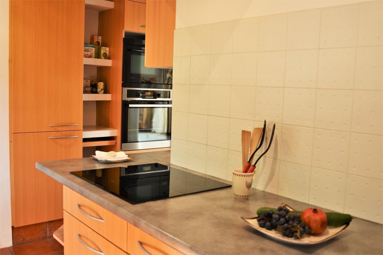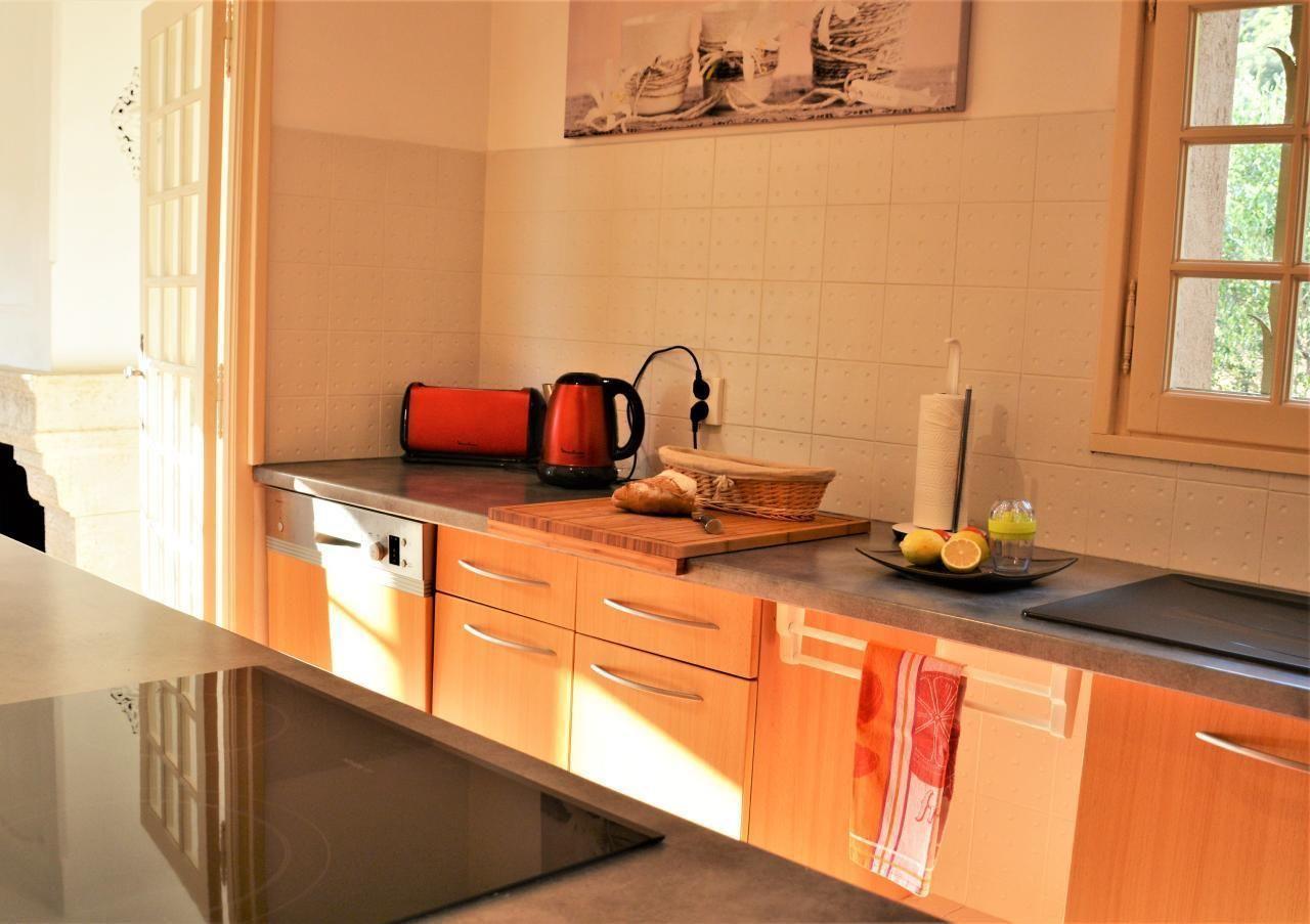 On the upper floor is the fully equipped kitchen with dishwasher, refrigerator, oven, microwave, ceramic glass fireplace, automatic coffee maker (Nespresso) and a toaster. The kitchen opens onto a covered terrace with magnificent views of the Massif de l'Esterel. The mountains are known for their impressive "porphyry" red rocks.
