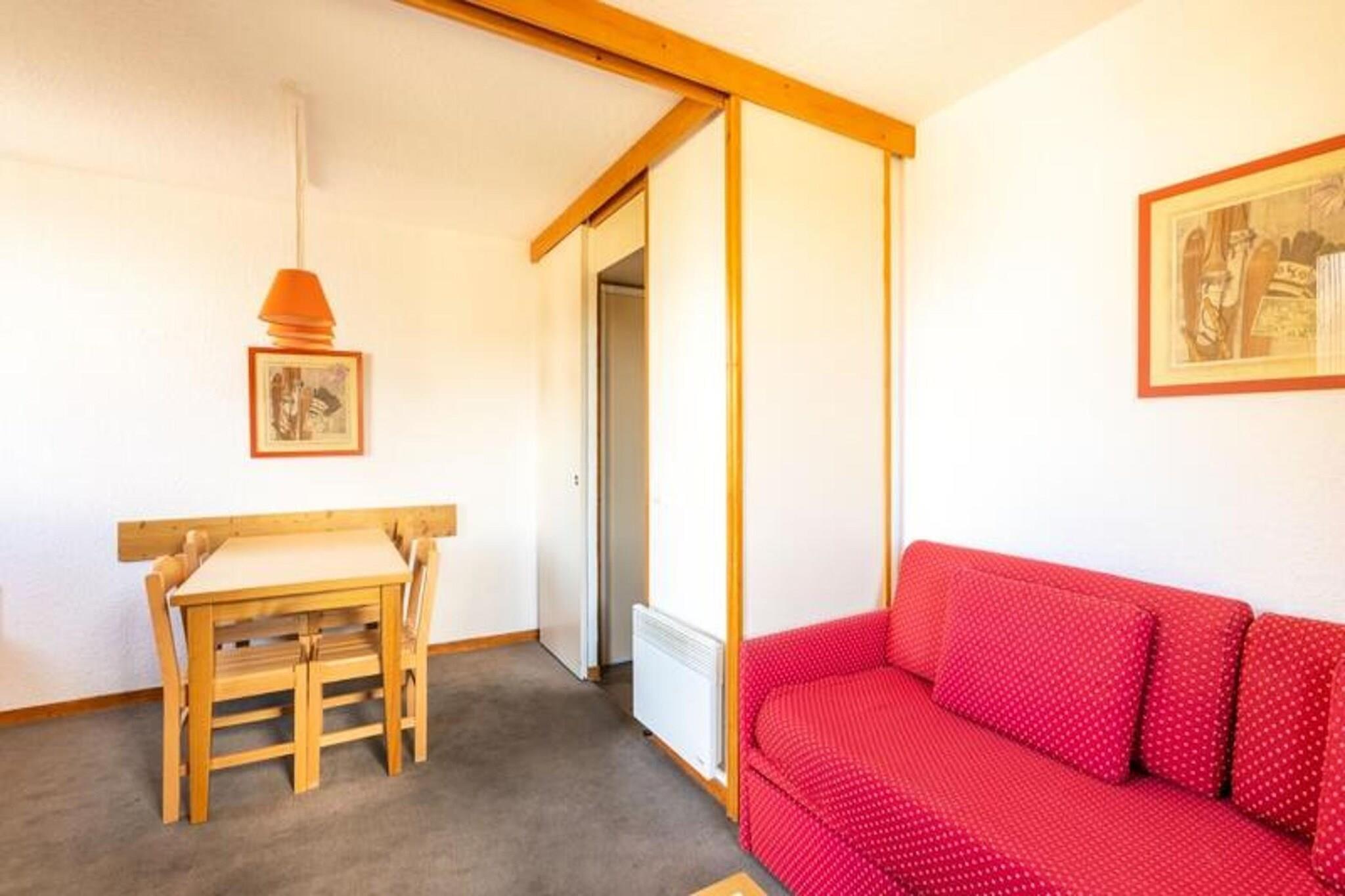 This cozy studio apartment offers a comfortable living space with a convertible sofa that sleeps up to four guests. The property is pet-friendly, with additional fees for pets. It features a private bathroom with a water closet and a balcony with a beautiful view of the valley. The apartment is equipped with essential amenities for a relaxing stay, and Wi-Fi access is available for an extra charge. Housekeeping services are offered at an additional cost, and parking is provided during the summer months in a covered area. Located at the foot of the slopes, this property offers direct ski-in/ski-out access, making it ideal for winter sports enthusiasts. Situated in the village center, the apartment is surrounded by a variety of attractions, including cafes, shops, and markets, all within walking distance. Guests can enjoy the local Savoyard cuisine at nearby restaurants, and entertainment venues are just a short stroll away. Whether you're looking to explore or relax, this location has something for everyone. The studio features a semi-open kitchen, providing guests with basic cooking facilities. The kitchen area is compact, with no separate dining table, but the living space includes a dining table with seating for four. The private bathroom is in good condition, and the apartment is bright and comfortable. For those requiring additional services, bed linens, towels, and cleaning can be arranged at extra cost, ensuring a convenient stay.