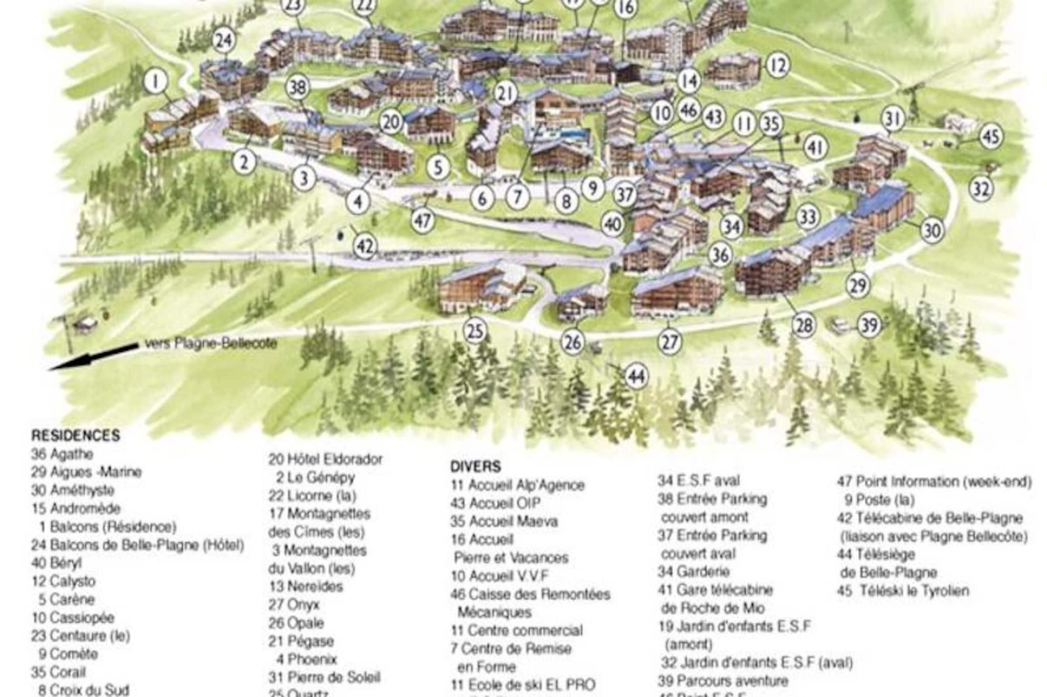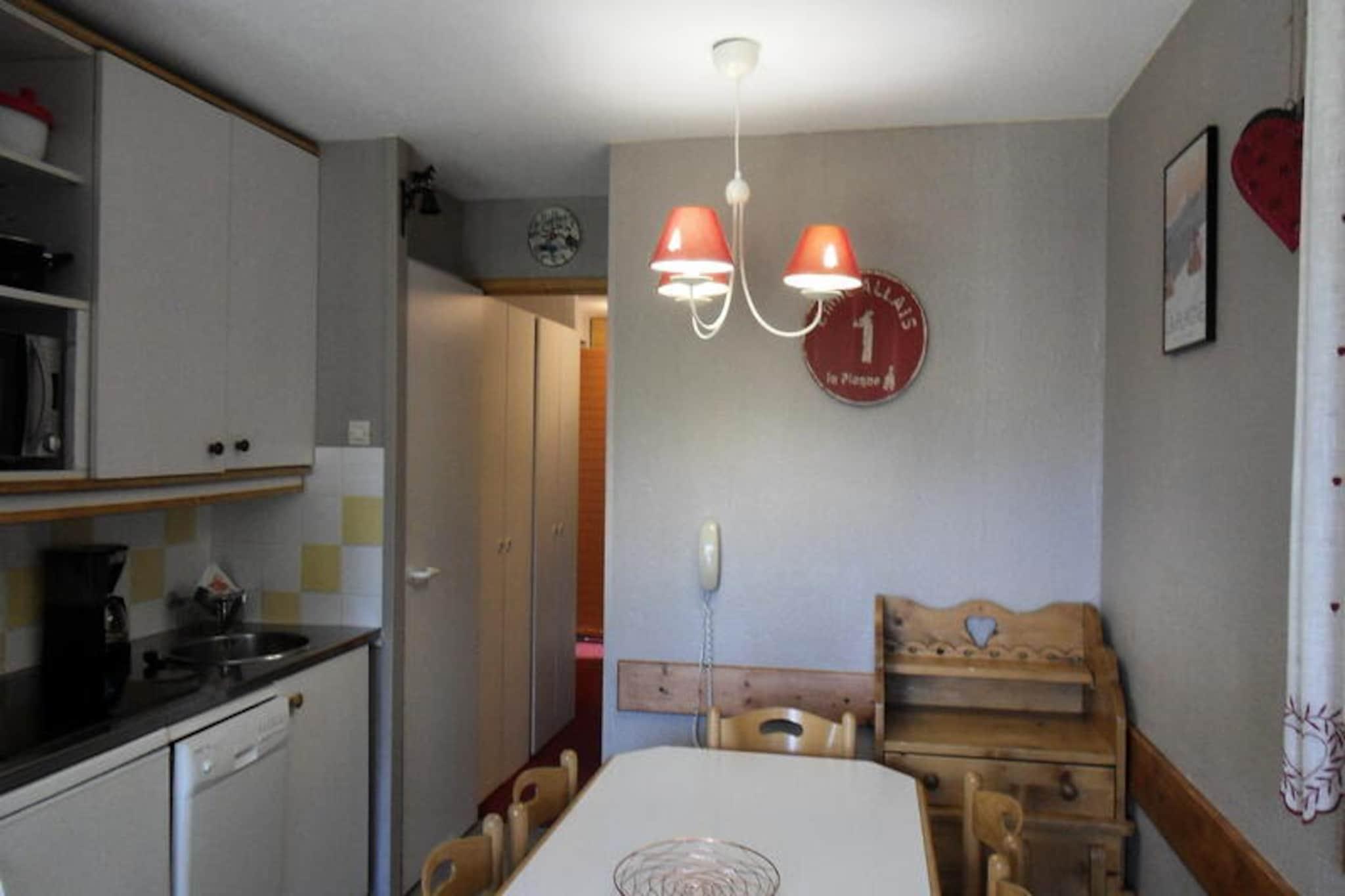 High above the charming Belle Plagne resort, this cozy ski-in/ski-out apartment offers the perfect alpine escape for families and friends. Imagine stepping out onto your southwest-facing terrace, where the slopes stretch out before you, inviting you to embrace the thrill of the mountains. With its prime location in the upper part of the resort, this residence ensures both convenience and breathtaking views of the surrounding peaks. Whether you're here for exhilarating ski days or tranquil summer hikes, this property places you at the heart of it all. \n\nInside, the 36m² apartment comfortably accommodates up to seven guests. The open-plan kitchen, equipped with a 4-burner ceramic hob, combi oven, and dishwasher, makes meal preparation a breeze. The living room features two single sofa beds, a trundle bed, and a flat-screen TV, creating a welcoming space to relax after a day of adventure. Two bedrooms provide restful retreats: one with a double bed and another with bunk beds, perfect for children or friends. A bathroom with a bathtub and an additional shower room with a toilet add to the convenience.\n\nThe residence offers direct access to the slopes, an individual ski locker, and paid underground parking with direct access to the building. Shops, restaurants, and amenities are just 100 meters away, making it easy to stock up on essentials or enjoy après-ski delights. For added comfort, pets are welcome for a small fee, and duvets are provided, though guests should bring their own linens and towels. \n\nWhether you're seeking a winter wonderland or a summer retreat, this Belle Plagne apartment combines comfort, practicality, and an unbeatable location, ensuring an unforgettable stay in the heart of the French Alps.