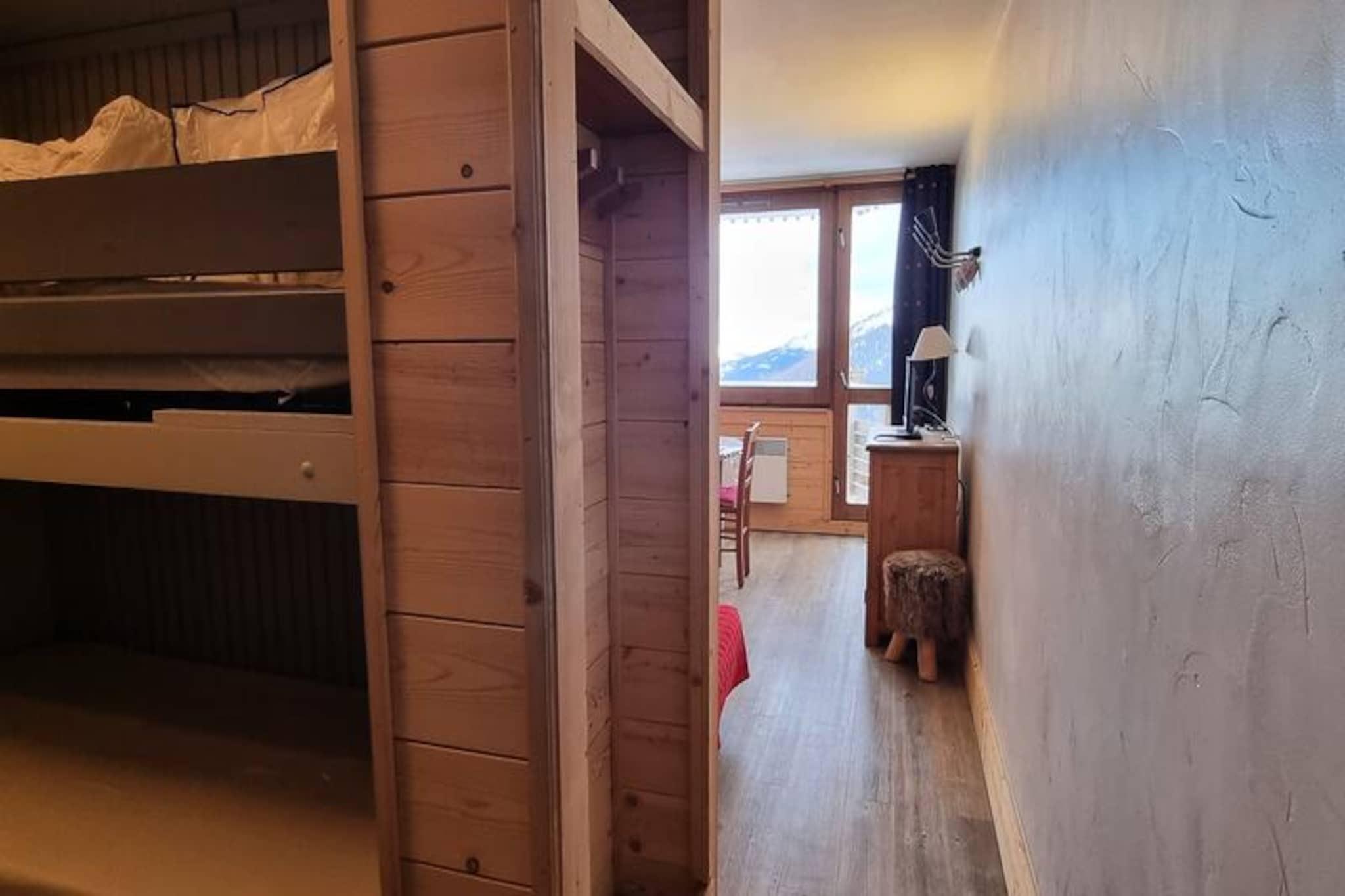 High above the Tarentaise Valley, this charming studio cabin offers a front-row seat to the breathtaking Mont Blanc and the vibrant La Plagne resorts. Located within the iconic Paquebot des Neiges, this ski-in/ski-out residence is a haven for mountain enthusiasts seeking both adventure and comfort. With north and south exposure, the property is bathed in natural light, creating a warm and inviting atmosphere for your alpine escape. \n\nThis recently renovated 25.19 m² studio is thoughtfully designed to accommodate 3 to 4 guests. The living room features a comfortable double sofa bed, a dining table for four, and a flat-screen TV, perfect for unwinding after a day on the slopes. A cozy sleeping alcove with bunk beds provides additional space for restful nights. The separate kitchen is fully equipped with a combination oven, ceramic hob, refrigerator, and dishwasher, making meal preparation a breeze. The modern bathroom includes a bathtub, and a separate toilet adds extra convenience. Step out onto the east-facing balcony to soak in the stunning views of Mont Blanc and the surrounding alpine landscape. \n\nThe Paquebot des Neiges offers unparalleled convenience with all shops and the cable car station located on level G of the residence. A free resort shuttle ensures easy access to nearby attractions, while free outdoor parking and paid covered parking provide flexibility for travelers. The ski locker and direct slope access make this the perfect base for winter sports enthusiasts. \n\nWhether you're here to carve through pristine snow, explore the picturesque trails, or simply relax and take in the serene mountain views, this studio cabin is your gateway to an unforgettable alpine adventure. Let the magic of the French Alps captivate you from this unique and well-appointed retreat.