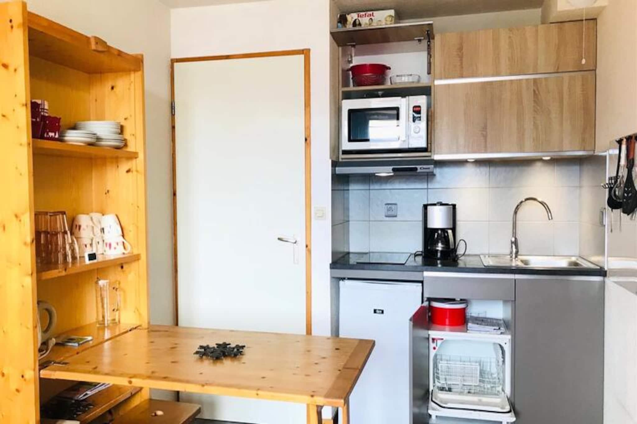 Location: Residence without elevator, located on the slopes, 500m from shops and ski lifts (ski access from the residence when snow conditions are sufficient). Amenities: Individual ski lockers on the ground floor and level -1. Free parking in front of the residence. Residence "Le Chanteloup", on the slopes, quiet, pleasant and renovated 26m² apartment for 4 people, on the 1st floor without elevator, with a balcony overlooking the valley and an individual ski locker on the ground floor (hallway facing the slopes). The apartment includes a kitchenette equipped with a refrigerator, microwave, dishwasher, ceramic hob, coffee maker, toaster, and kettle. It opens onto the living room, which features a shepherd's table, sofa, and flat-screen TV. A sleeping alcove accommodates two bunk beds (not suitable for children under 6) and a storage closet. The bedroom has a double bed. The bathroom has a sink and a bathtub. There is a separate toilet. /!\ Linens and end-of-stay cleaning are available at an additional cost. The accommodation is equipped with duvets. Security deposit (in euros) - 400 Heating - 1
