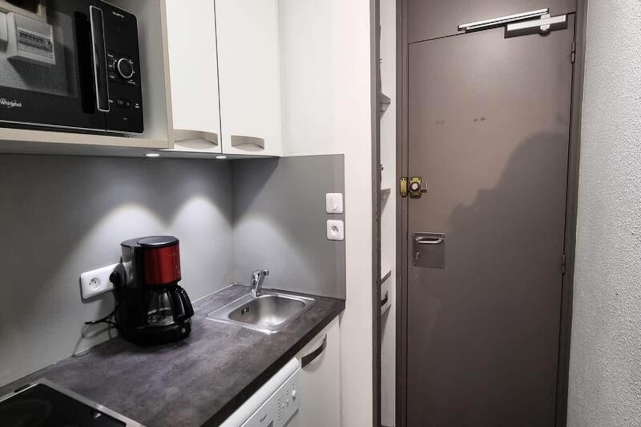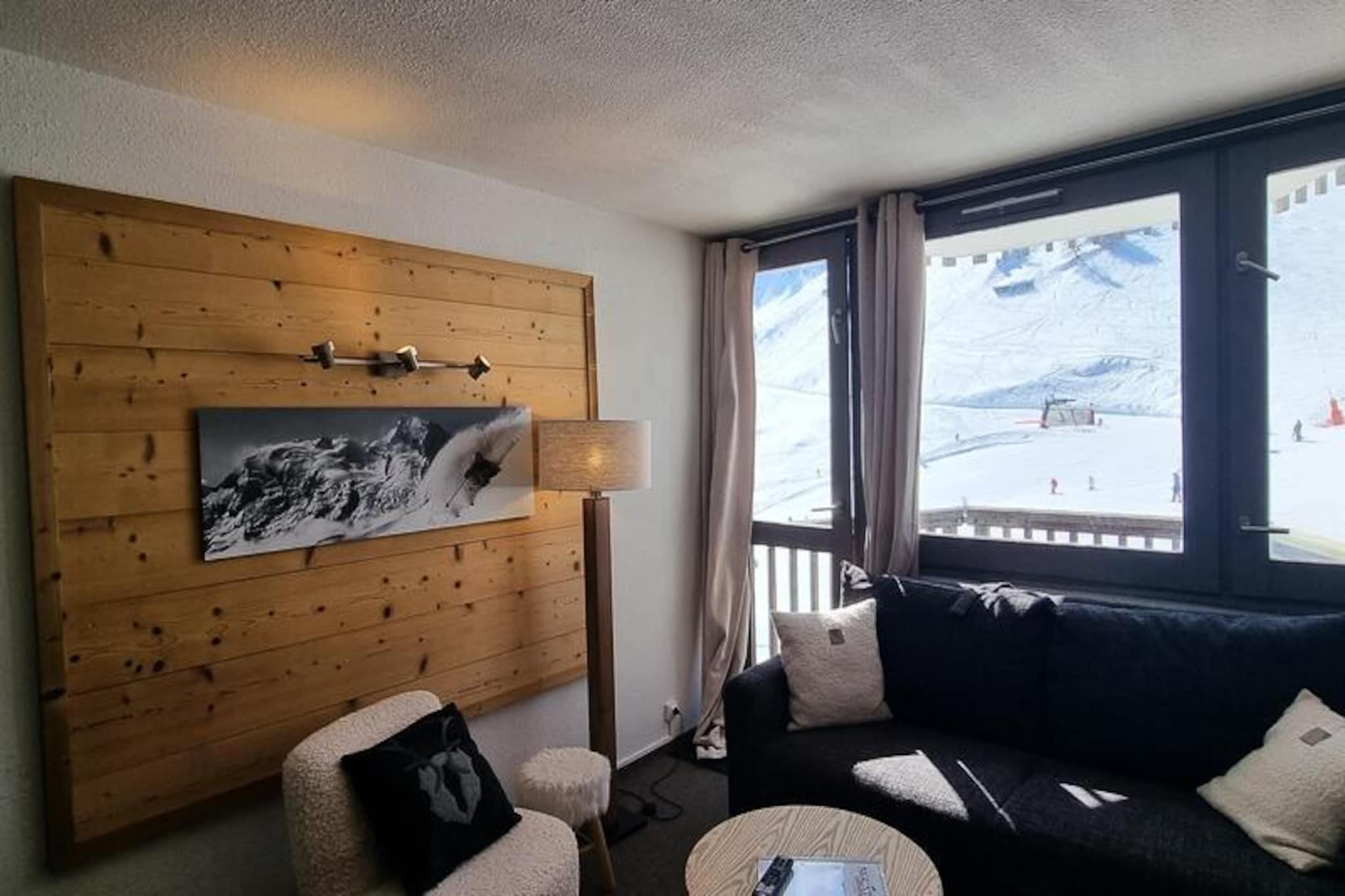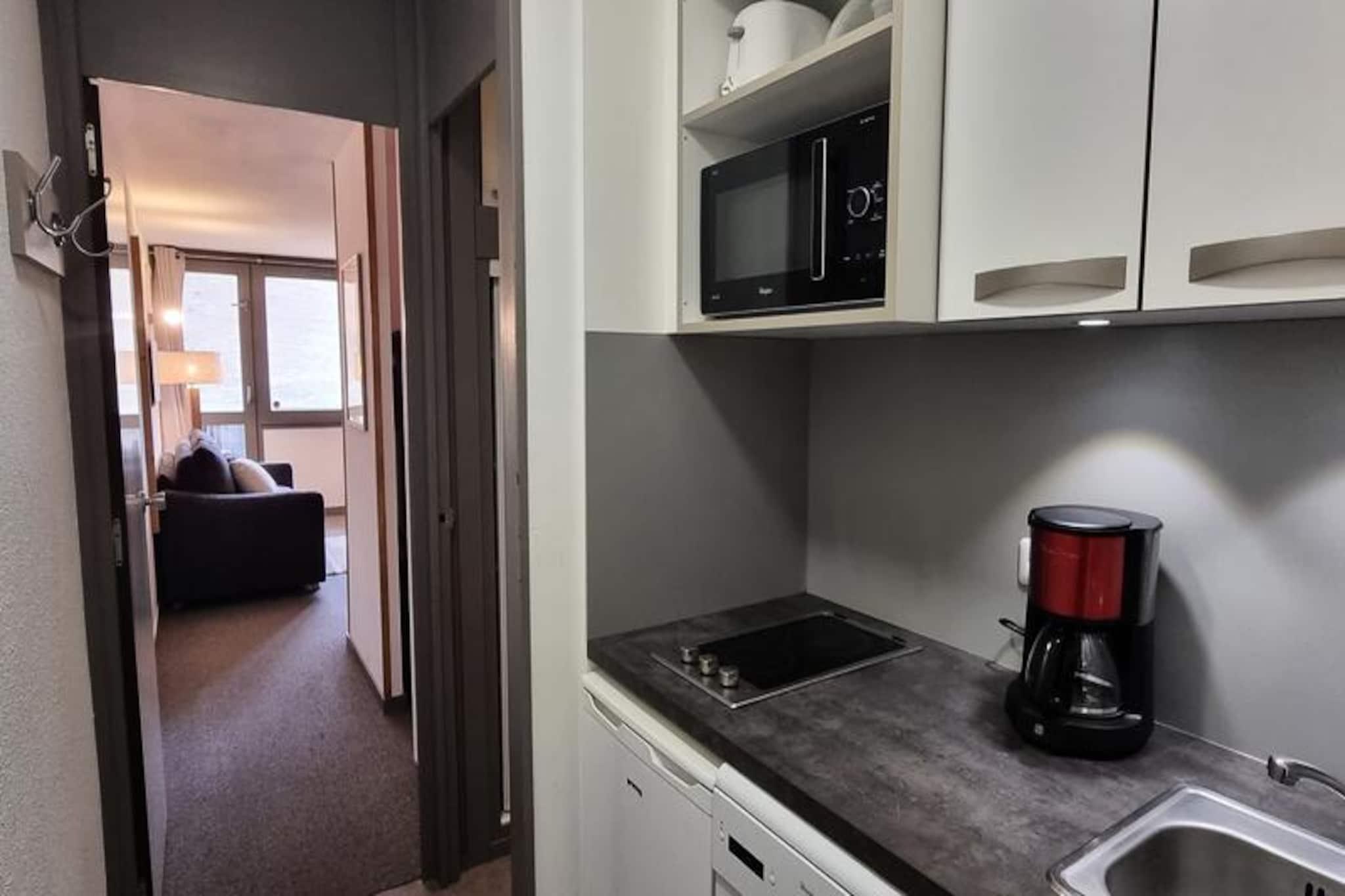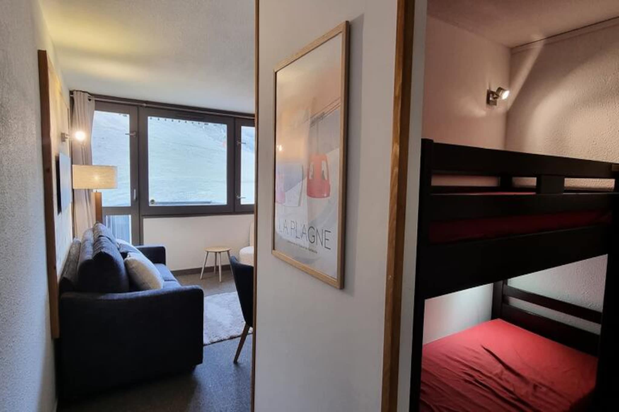 High above the serene slopes of Aime 2000, this charming studio offers a cozy retreat where alpine adventures and modern comforts blend seamlessly. Situated within the iconic Paquebot des Neiges, a ski-in/ski-out residence with unparalleled convenience, this property invites you to immerse yourself in the beauty of the French Alps. From its south-facing balcony, soak in the stunning views of the snow-covered pistes while enjoying the crisp mountain air. Whether you're here for skiing, hiking, or simply relaxing, this studio is your gateway to unforgettable moments. \n\nDesigned to accommodate up to four guests, the studio features a thoughtfully arranged living space with a comfortable sofa bed, a dining table for four, and a flat-screen TV for cozy evenings. A sleeping alcove with bunk beds ensures restful nights for all. The separate kitchen is equipped with modern amenities, including a combi oven, ceramic hobs, refrigerator, and dishwasher, making meal preparation a breeze. The bathroom offers a bathtub for soothing relaxation after a day of outdoor activities, along with a separate toilet for added convenience. \n\nThe Paquebot des Neiges residence boasts exceptional facilities, including free outdoor parking, paid covered parking, and direct access to shops and the cable car station on level G. A free resort shuttle is available, ensuring easy exploration of the surrounding area. Ski lockers and Wi-Fi access are provided, and additional services such as baby equipment and end-of-stay cleaning can be arranged upon request. \n\nWhether you're seeking thrilling ski runs, tranquil mountain vistas, or a cozy alpine escape, this studio is perfectly positioned to offer it all. Let the majestic peaks of the Tarentaise Valley inspire your next adventure and create lasting memories in this unique alpine haven.