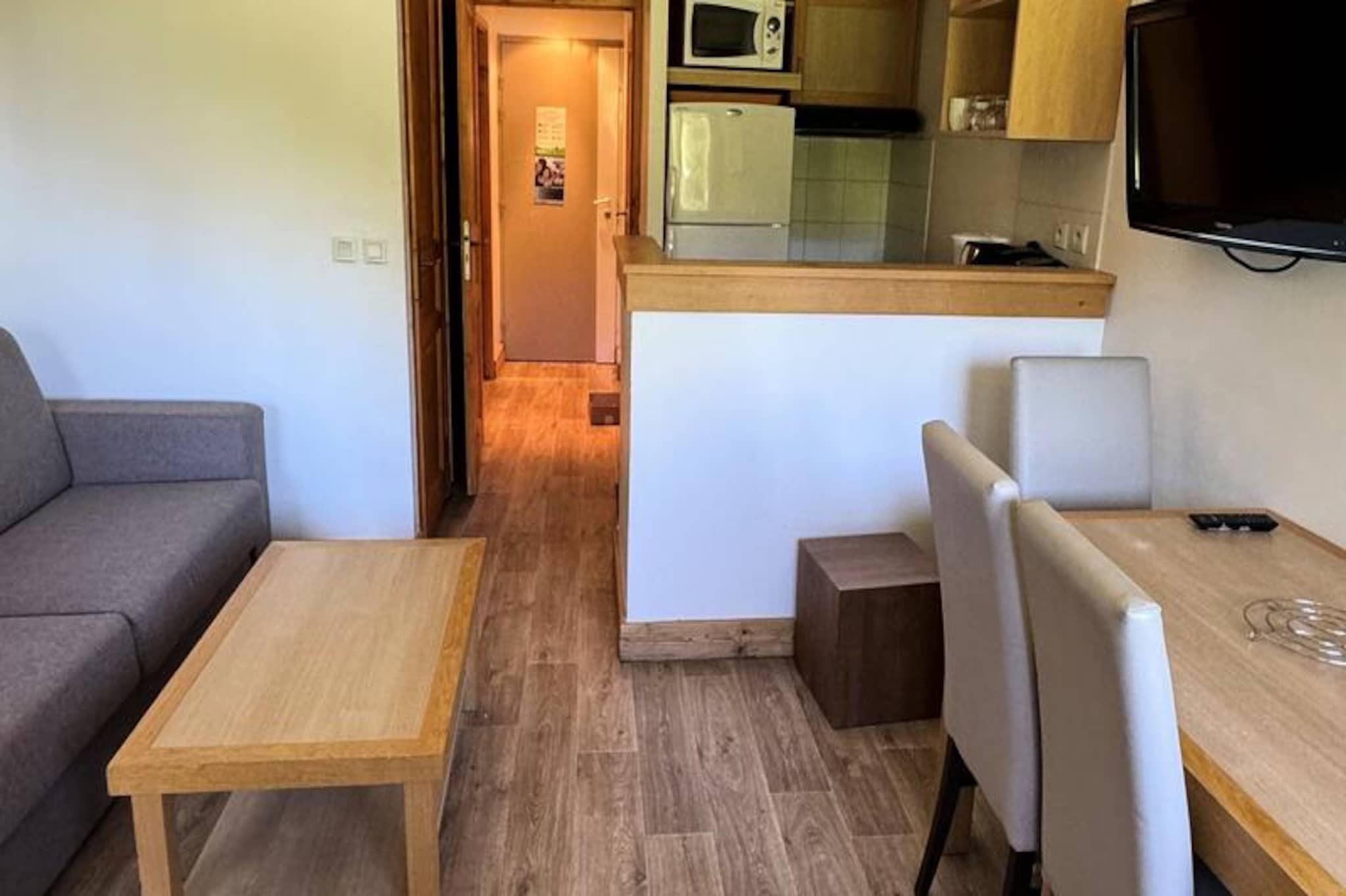 High above the picturesque Belle Plagne, this charming alpine apartment offers a cozy retreat for those seeking the perfect blend of adventure and relaxation. Imagine waking up to the crisp mountain air and stepping out onto your private balcony to take in the serene views of the slopes. Whether you're here for thrilling days on the snow or tranquil evenings in the wellness center, this residence promises an unforgettable escape in the heart of the French Alps. With direct access to the slopes from the building, your alpine adventure begins the moment you step outside. \n\nThe apartment spans two levels and comfortably accommodates up to four guests. The living room features a double sofa bed and a flat-screen TV with a DVD player, perfect for unwinding after a day of skiing. Upstairs, the attic bedroom offers two single beds, creating a cozy and private sleeping space. The open-plan kitchen is fully equipped with a ceramic hob, dishwasher, oven, microwave, and refrigerator with freezer, making it easy to prepare meals. A modern bathroom with a bathtub and hairdryer, along with a separate WC, ensures all the comforts of home. Bed linen, towels, and duvets are provided, so you can focus on enjoying your stay. \n\nThe residence boasts an indoor heated swimming pool and a luxurious wellness center featuring a sauna, jacuzzi, hammam, and experience shower. Shops are conveniently located just 100 meters away, and underground parking with direct access to the building is available for added convenience. Free Wi-Fi keeps you connected, while pets are welcome for a small fee, ensuring everyone in the family can join the fun. \n\nWhether you're here to carve the slopes, relax in the spa, or explore the charming Belle Plagne area, this apartment offers the perfect base for your alpine adventure. Let the beauty of the French Alps inspire your next holiday and create memories that will last a lifetime.
