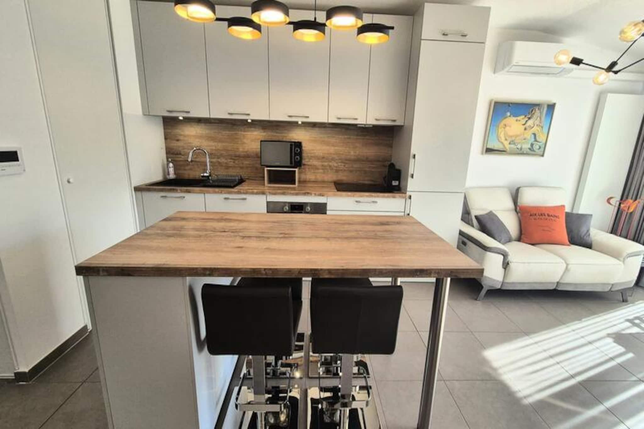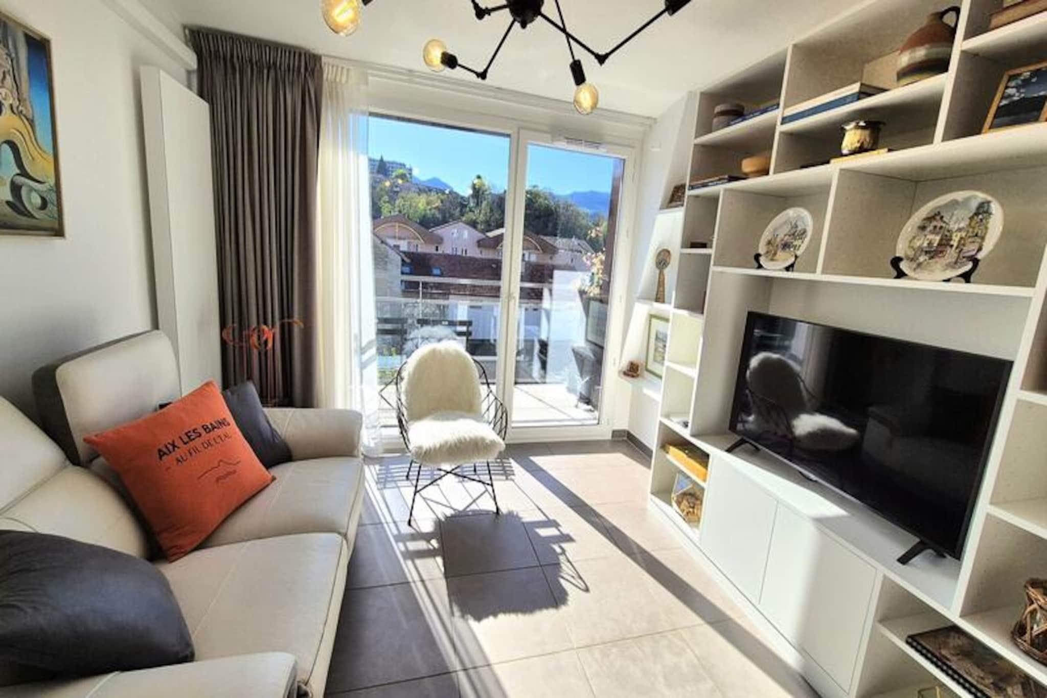 In the serene neighborhood of Les Jardins du Petit Port, this elegant 3-star apartment offers a tranquil retreat just 500 meters from the shimmering waters of Lake Bourget. With its west-facing balcony, you can bask in the golden hues of the setting sun while enjoying the peaceful ambiance of this modern residence, built in 2020. Whether you're seeking relaxation or adventure, this property provides the perfect balance of comfort and convenience. The nearby waterfront invites leisurely strolls, invigorating bike rides, or even a scenic cruise aboard one of the lake’s charming boats, immersing you in the beauty of the region. \n\nLocated on the 3rd floor and accessible by elevator, this 40m² apartment is designed with high-quality amenities to ensure a comfortable stay for up to two guests. The open-plan living area features a fully equipped kitchen with a central island, induction burners, and modern appliances such as a dishwasher, oven, and microwave. The cozy bedroom boasts a plush 160cm bed, ample storage, and a desk area, perfect for unwinding after a day of exploration. The en-suite bathroom includes a walk-in shower and heated towel rail, while a separate WC adds extra convenience. Reversible air conditioning ensures year-round comfort, and the property includes secure underground parking and bicycle storage. \n\nThe residence itself is thoughtfully designed with landscaped communal gardens, fostering a sense of community and relaxation. Its prime location offers easy access to Aix-les-Bains’ vibrant town center, just 1km away, and the renowned Chevalley Thermal Baths, only 3km from your doorstep. Whether you’re visiting for the therapeutic waters, the stunning lake views, or the charming local culture, this apartment is your gateway to an unforgettable stay in the heart of the French Alps.