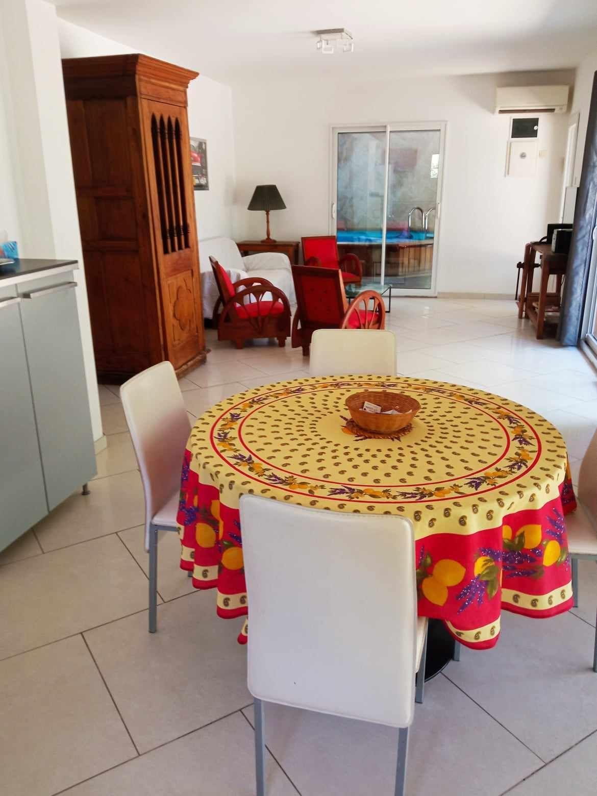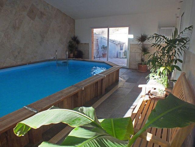 BUNGALOW house of 70m2 living space + room of 40m2 with private HEATED SWIMMING POOL of 5.95 X 3.5 m (depth 1.5m), (water at 29-30°C treated with active oxygen), OPEN from February to the end of November. Use of the pool is totally exclusive to this house. Access to the pool is via the living room or the terrace (enclosed by bay windows and roller shutters). The house comprises 2 bedrooms, a large living room with fully-equipped open-plan kitchen, 1 shower room with walk-in shower, separate wc.