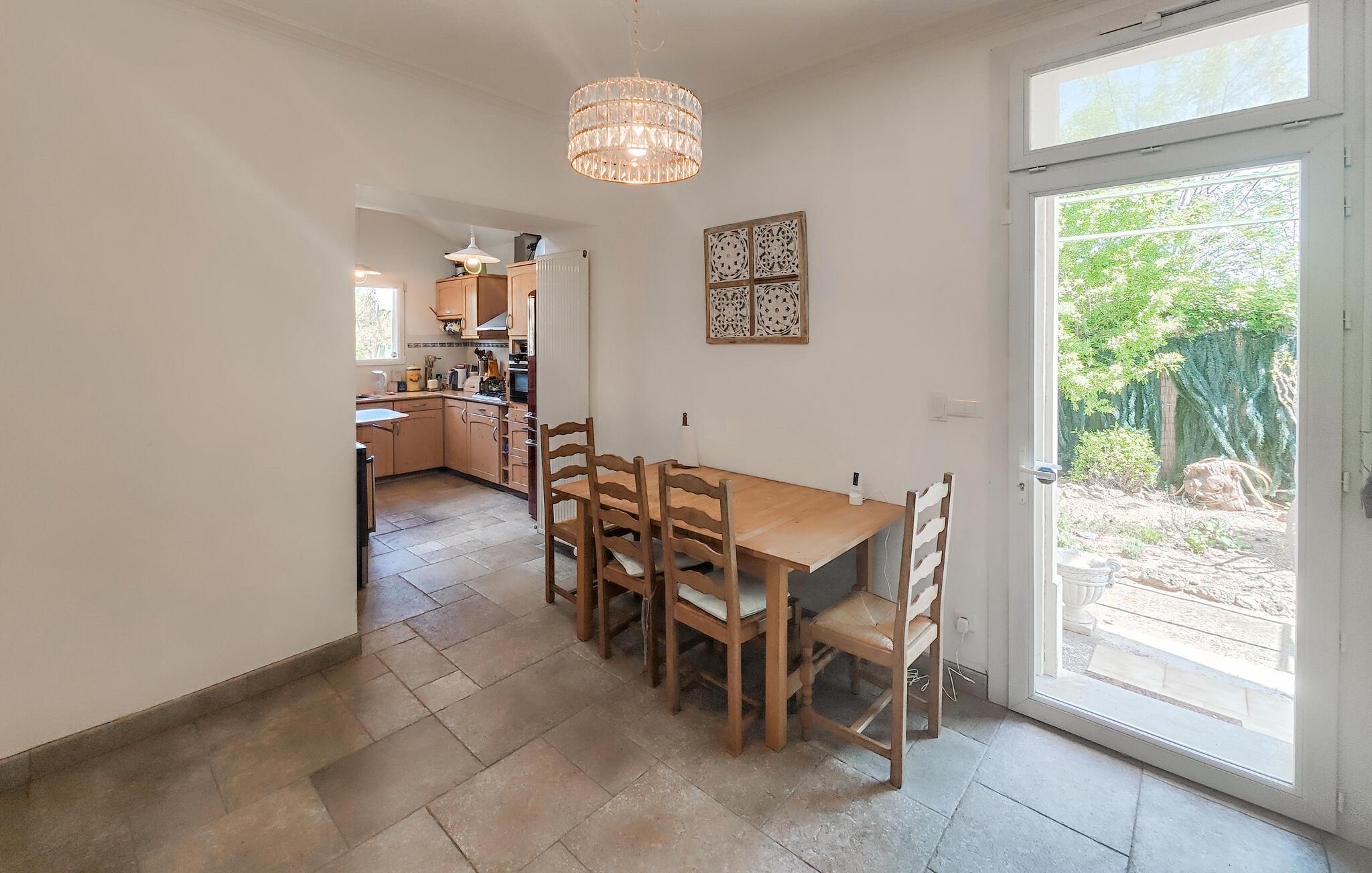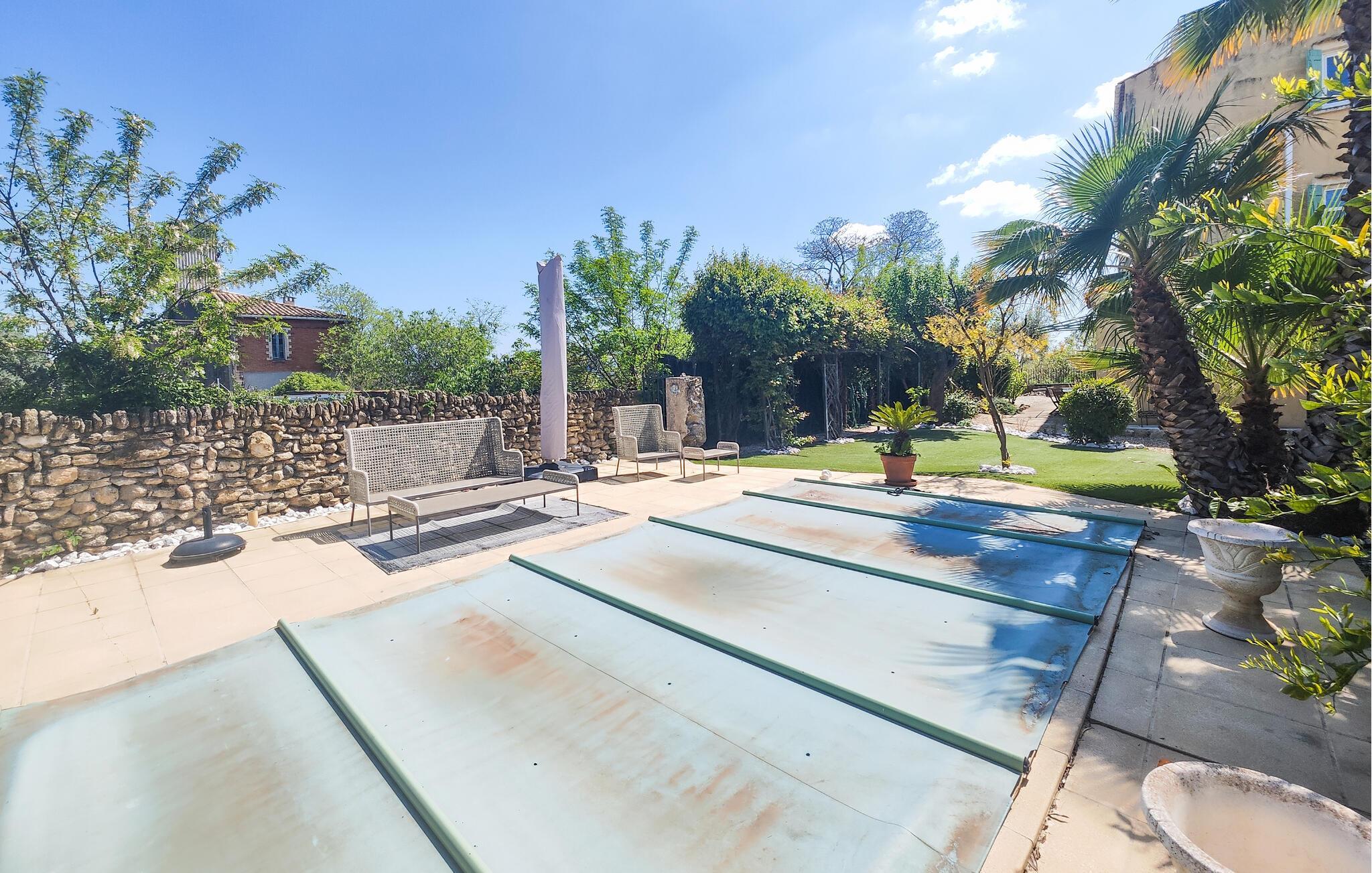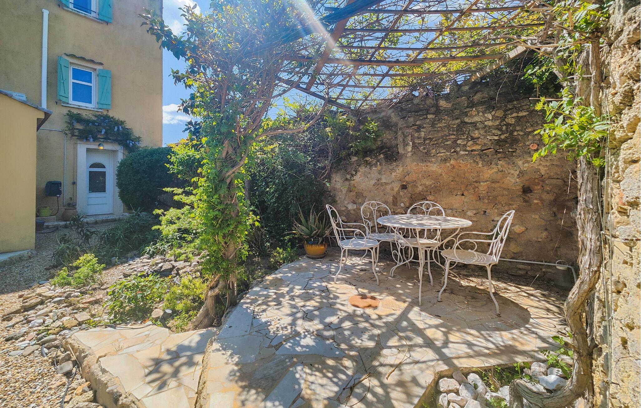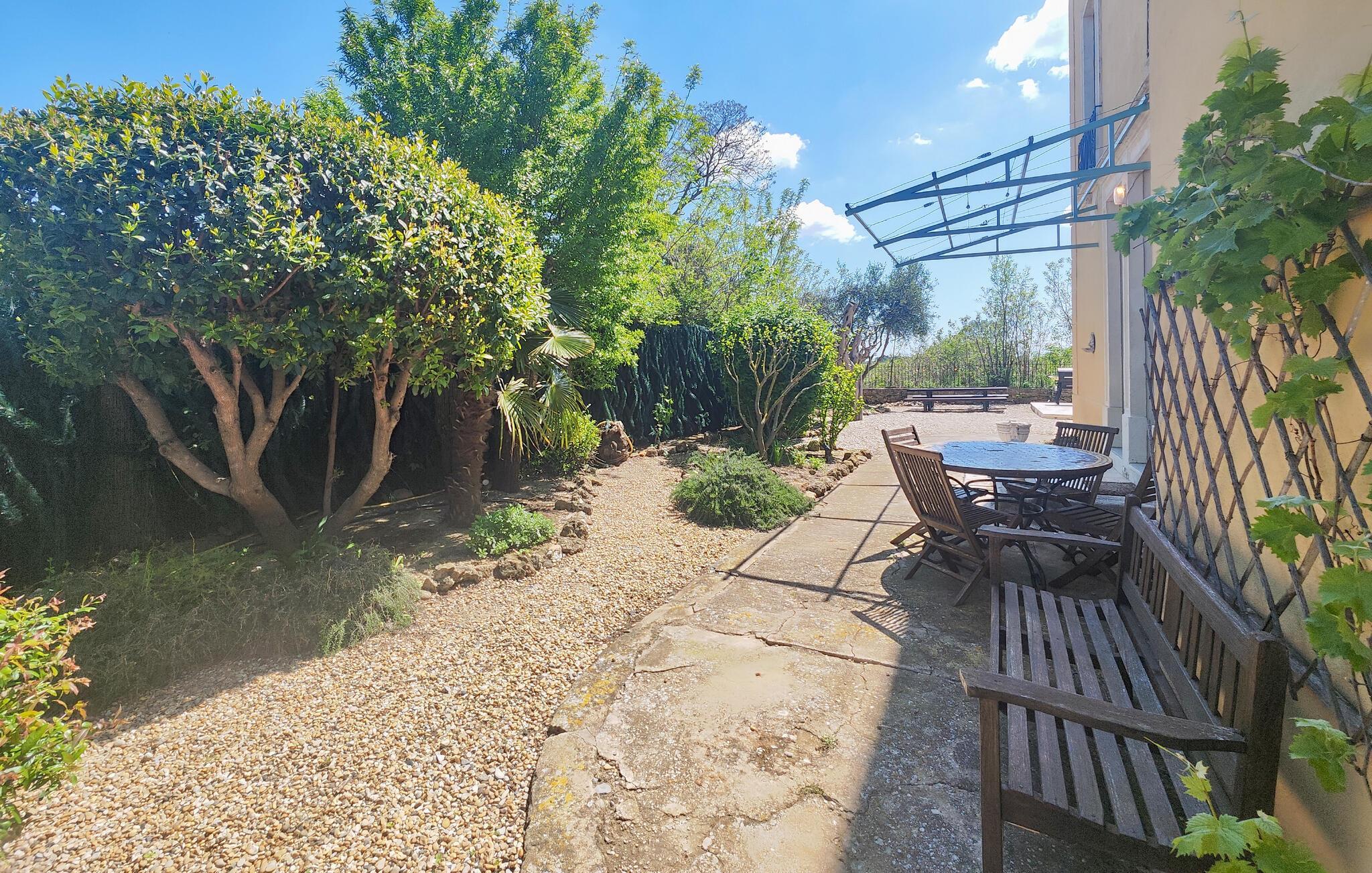 Draußen erwartet Sie ein gepflegter Garten und ein erfrischender Pool, der Badespaß an heißen Sommertagen verspricht. Frühstücken Sie im Freien, genießen Sie ein Glas Wein im Schatten der romantischen Terrasse mit natürlichem Blätterdach und versammeln Sie sich für stimmungsvolle Grillabende am rustikalen Holztisch.