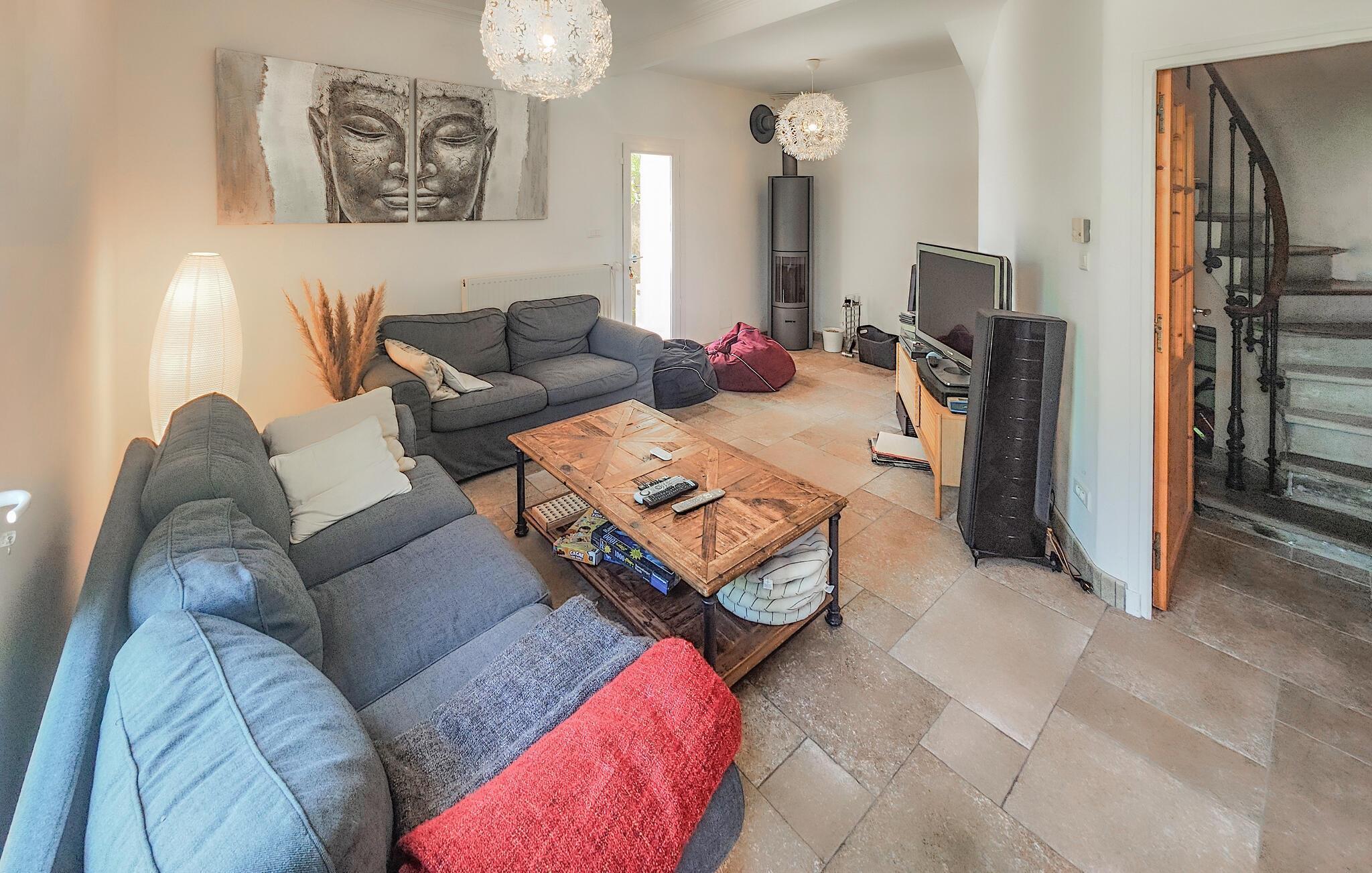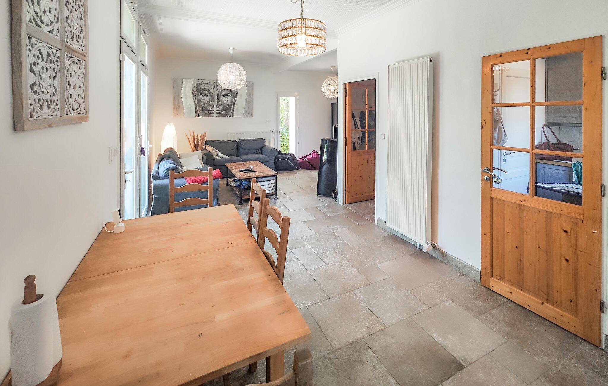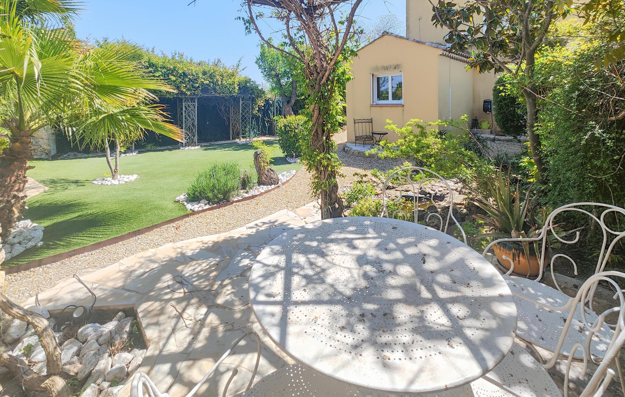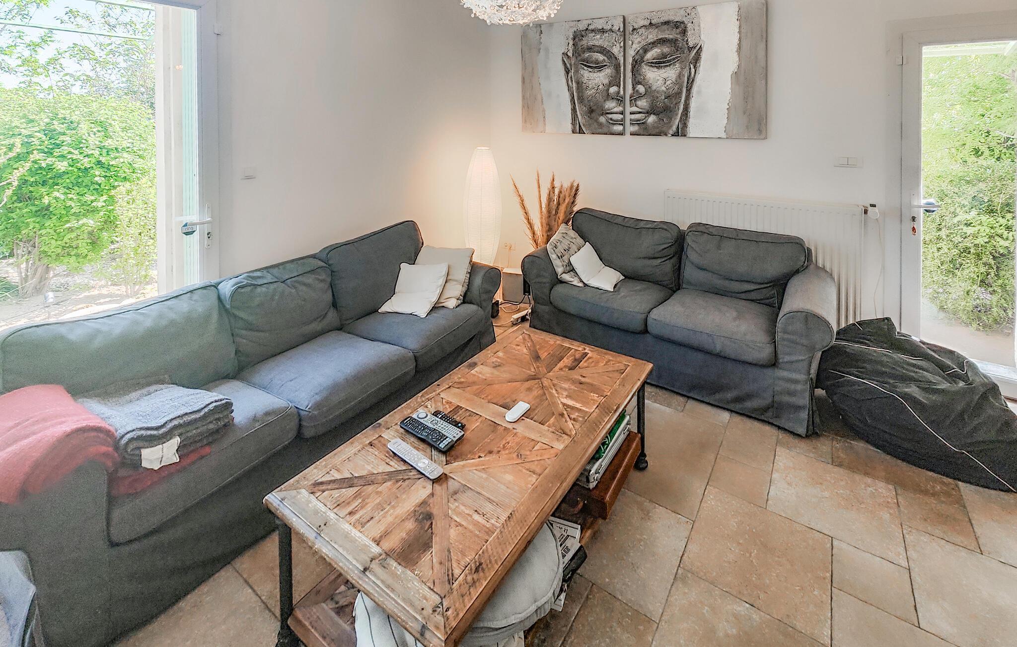 Draußen erwartet Sie ein gepflegter Garten und ein erfrischender Pool, der Badespaß an heißen Sommertagen verspricht. Frühstücken Sie im Freien, genießen Sie ein Glas Wein im Schatten der romantischen Terrasse mit natürlichem Blätterdach und versammeln Sie sich für stimmungsvolle Grillabende am rustikalen Holztisch.
