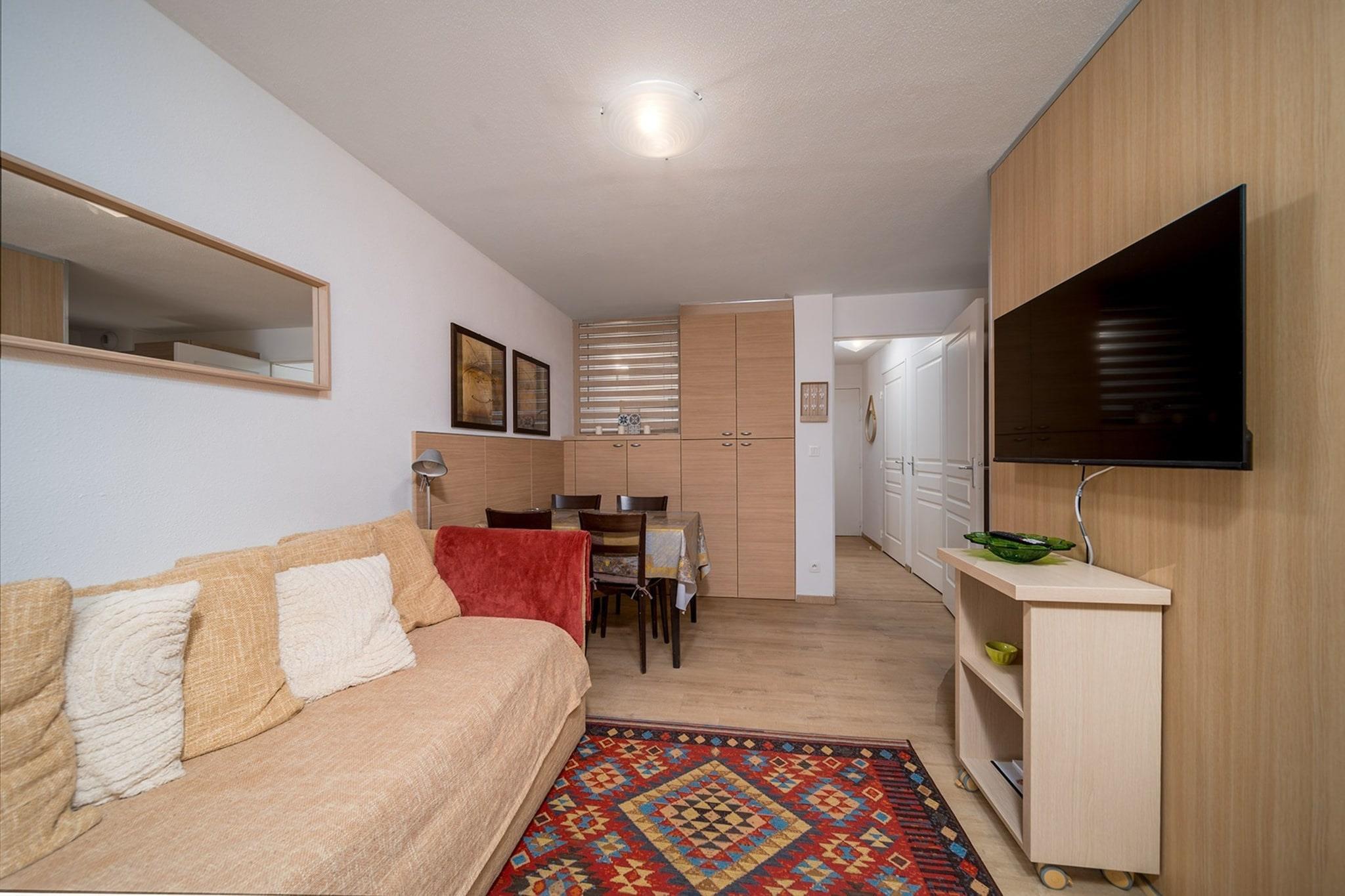 This charming and bright 35 m² apartment accommodates up to 6 guests, offering a cozy retreat at the foot of the ski slopes. The property features 1 comfortable bedroom and is located in a family-friendly, mountainous area with breathtaking mountain views. Guests can enjoy modern amenities such as central heating, Wi-Fi, and a TV for added comfort. The apartment includes a private balcony with outdoor furniture, a communal heated swimming pool, and an elevator for easy access. Open-air parking is available on-site, ensuring a stress-free experience. Please note, the property is not pet-friendly. Ideally situated for ski enthusiasts, the apartment is located right at the ski resort, allowing you to step directly onto the slopes. A short 50-meter walk takes you to the delightful "Crêperie La Marmotte" restaurant, perfect for savoring local cuisine. The surrounding family-friendly zone and scenic mountainous landscapes make it an excellent base for outdoor activities like skiing, hiking, and exploring the natural beauty of the area. The open-plan electric kitchen is fully equipped to meet all your culinary needs. It features a refrigerator, microwave, freezer, coffee machine, kettle, dishes, cutlery, and essential kitchen utensils, making meal preparation simple and convenient. Whether you're enjoying a warm breakfast before hitting the slopes or a cozy dinner after a day of adventures, this apartment offers everything needed for a memorable stay.