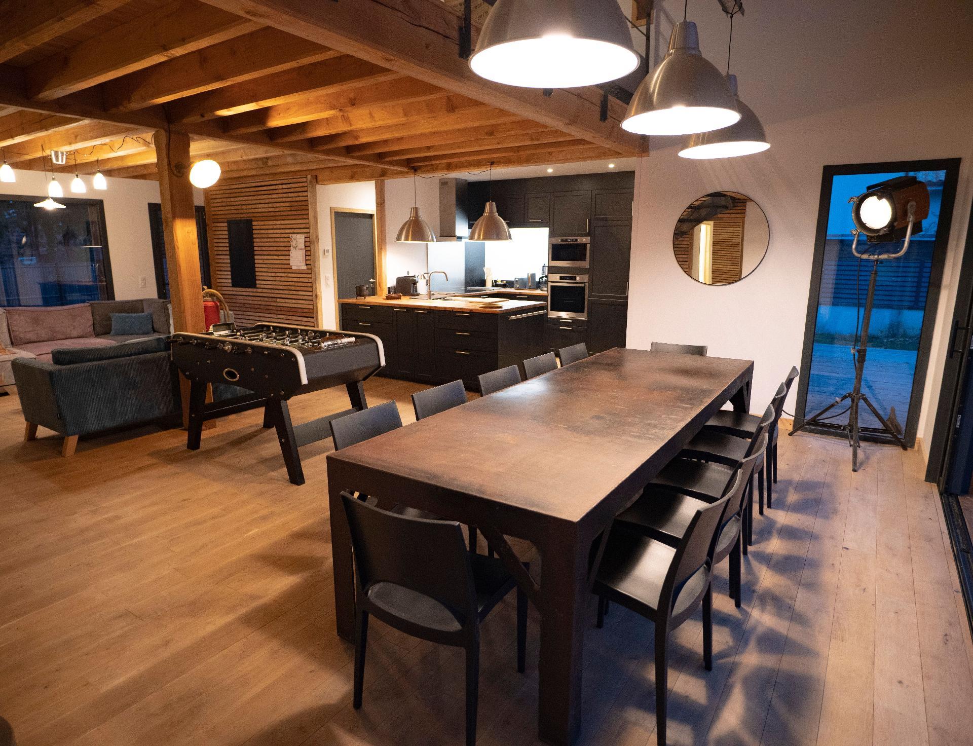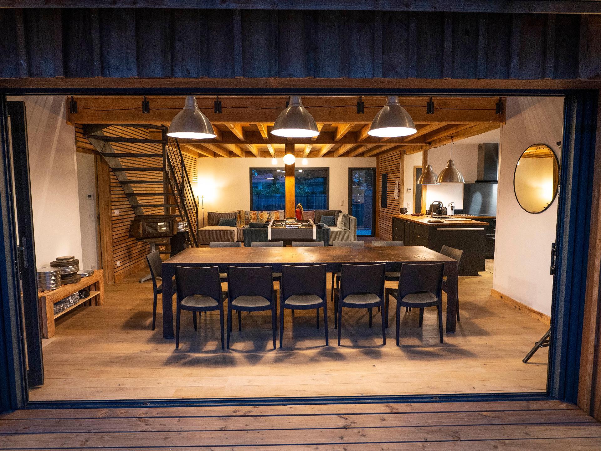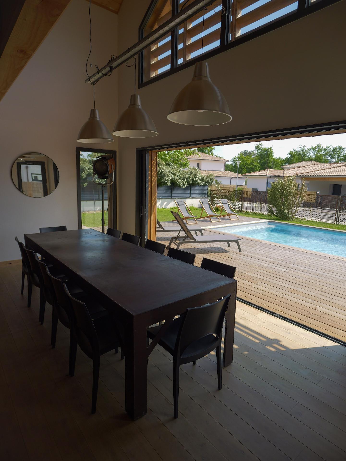 A large table to accommodate a small tribe. The sliding glass doors will give you the sensation of'être autant à l'inside as'à l'outside.