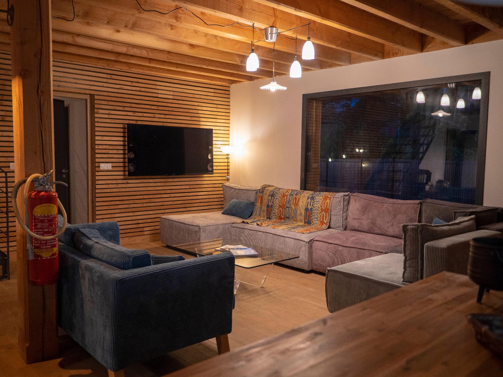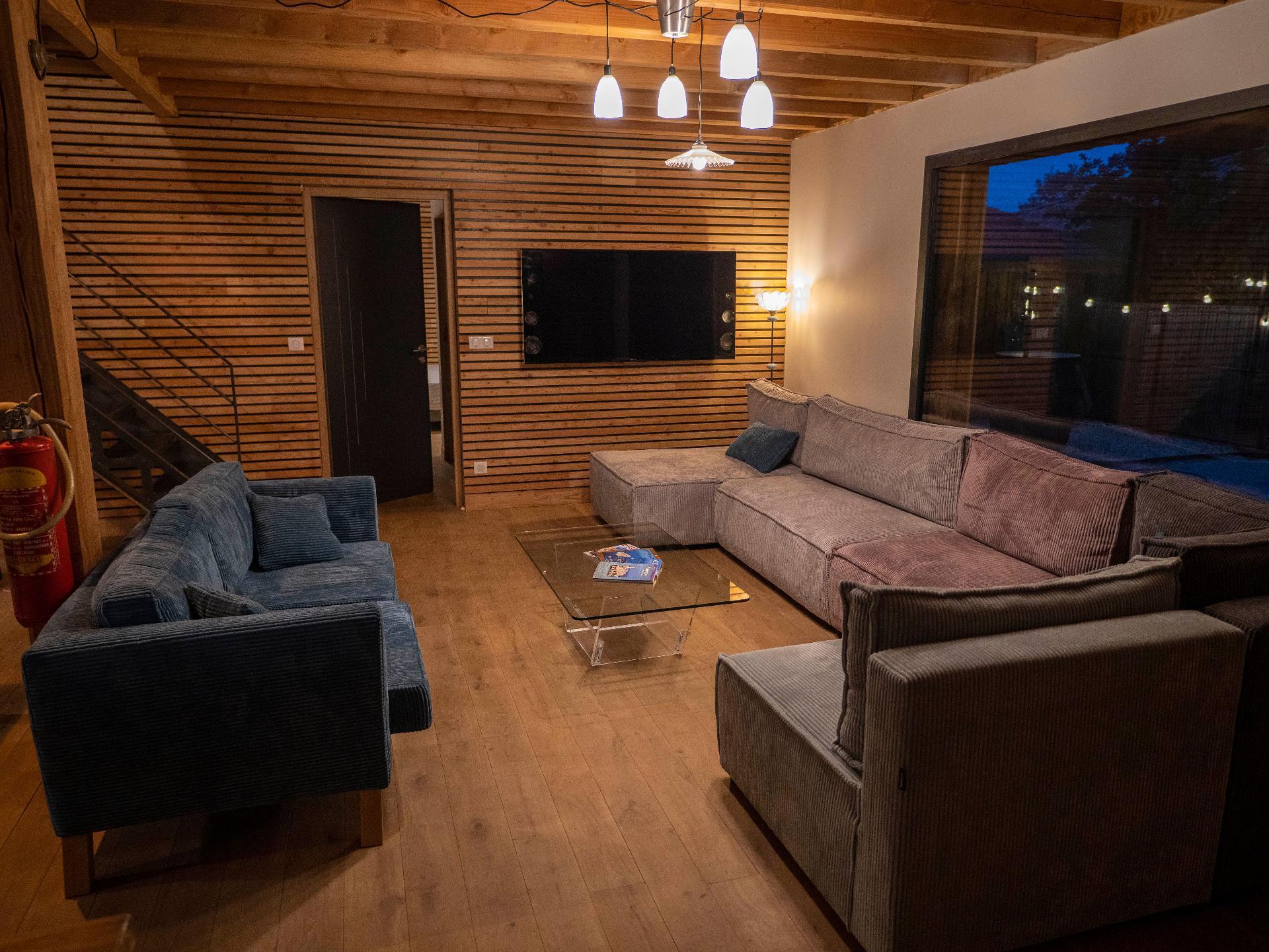 The lounge area is equipped with'un canapé confortable. Il y a également une grande TV dans le salon. La fibre a été installée, tv sur internet et wifi.