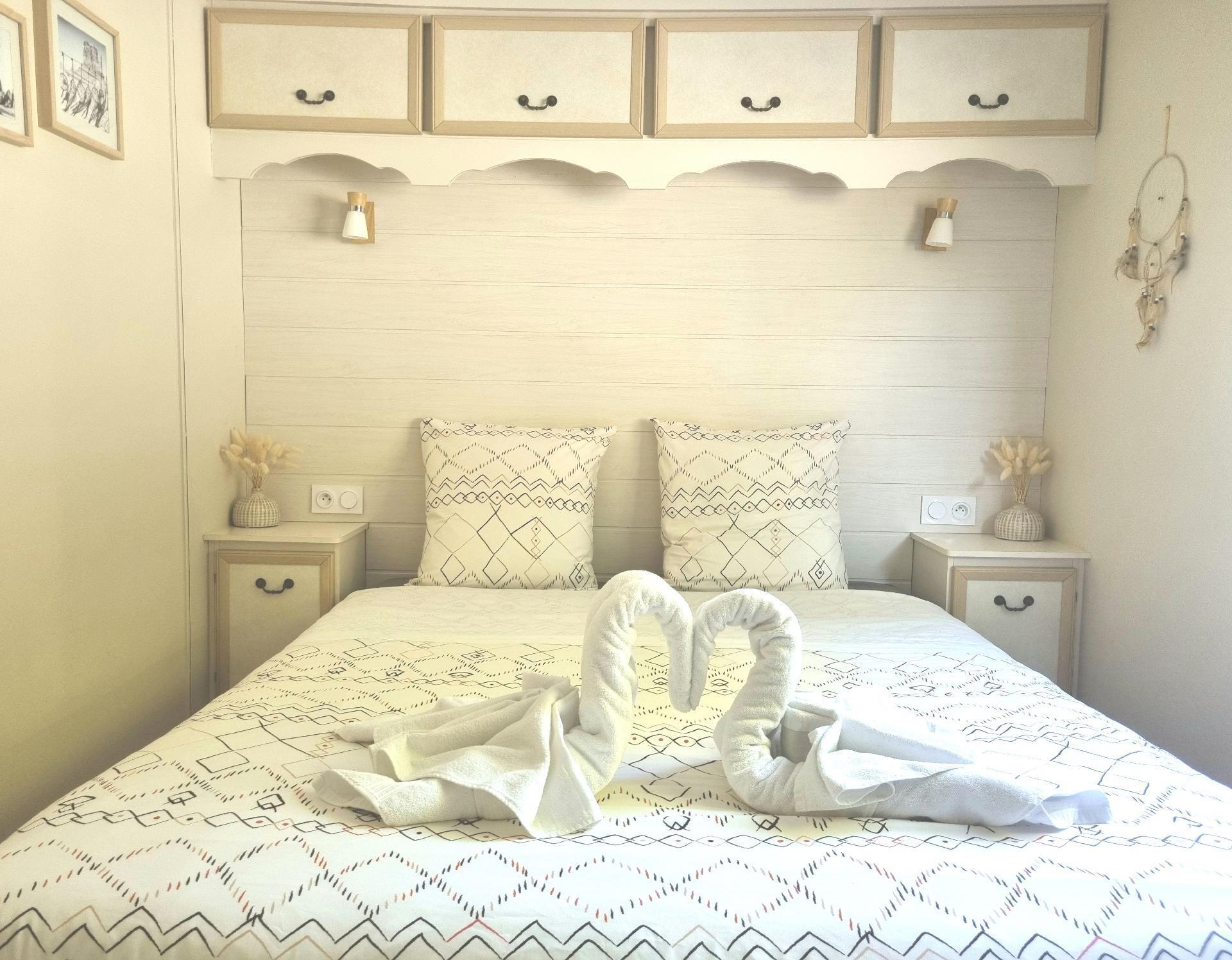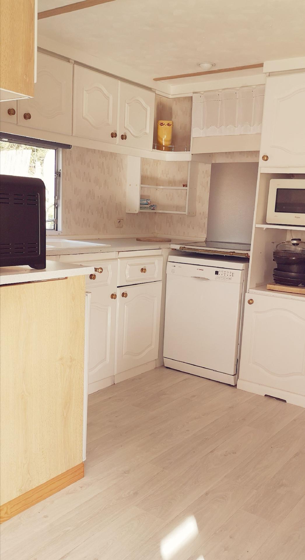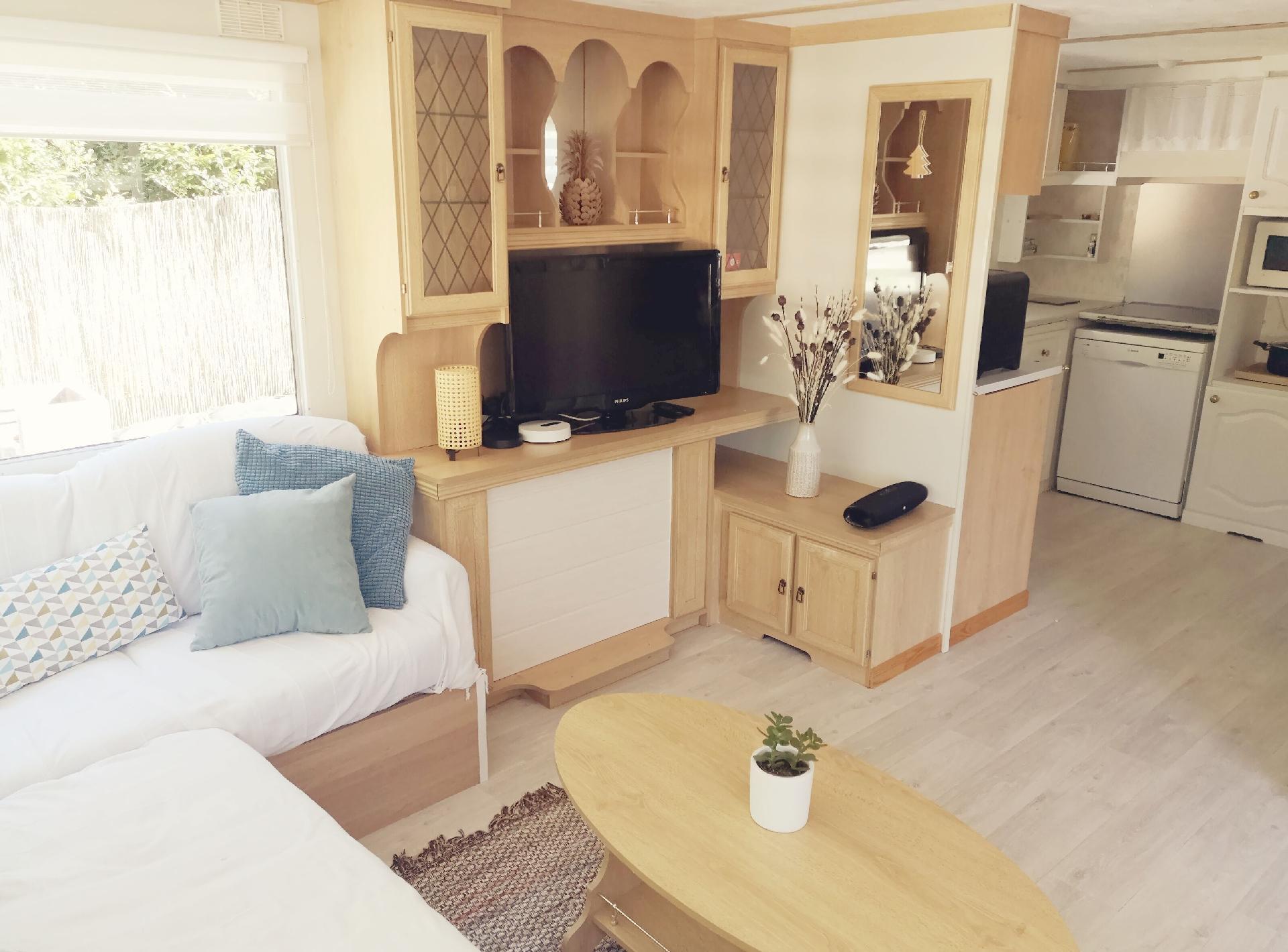 The interior of this mobile home is equipped to meet your needs during your stay. The kitchen is well equipped with a ceramic hob, a dishwasher, a coffee maker with soft pods, an electric kettle and a mini-oven to prepare and enjoy your meals with ease. A washing machine for private use in the accommodation also ensures your comfort. Relaxation is guaranteed with a connected TV, so you can keep up to date with your favourite series and films.