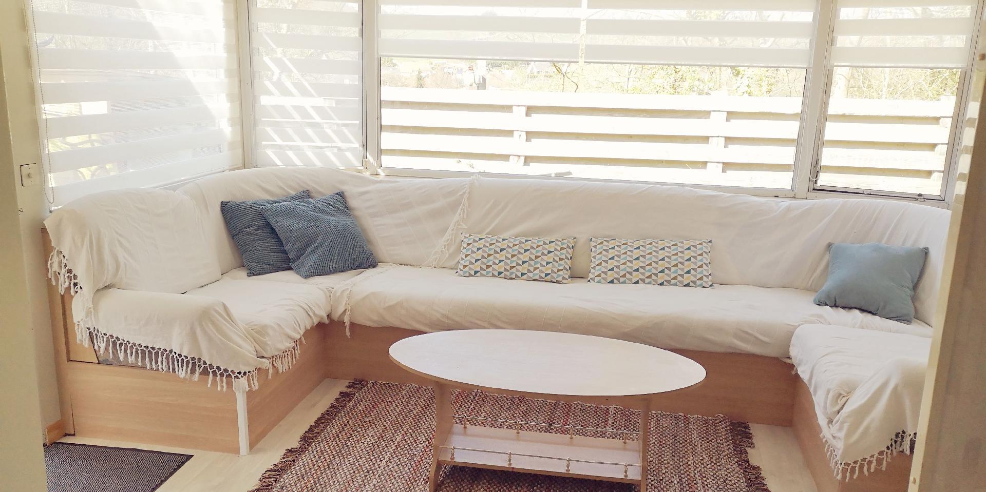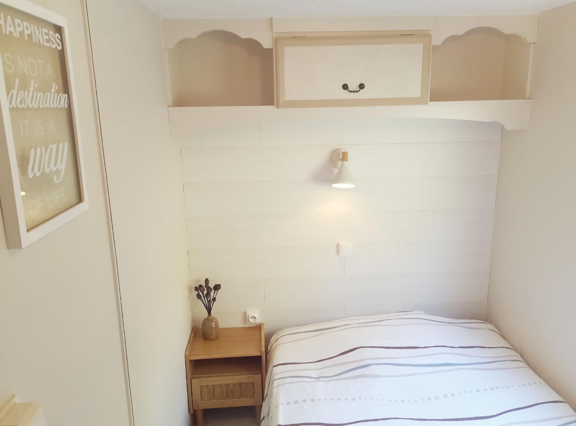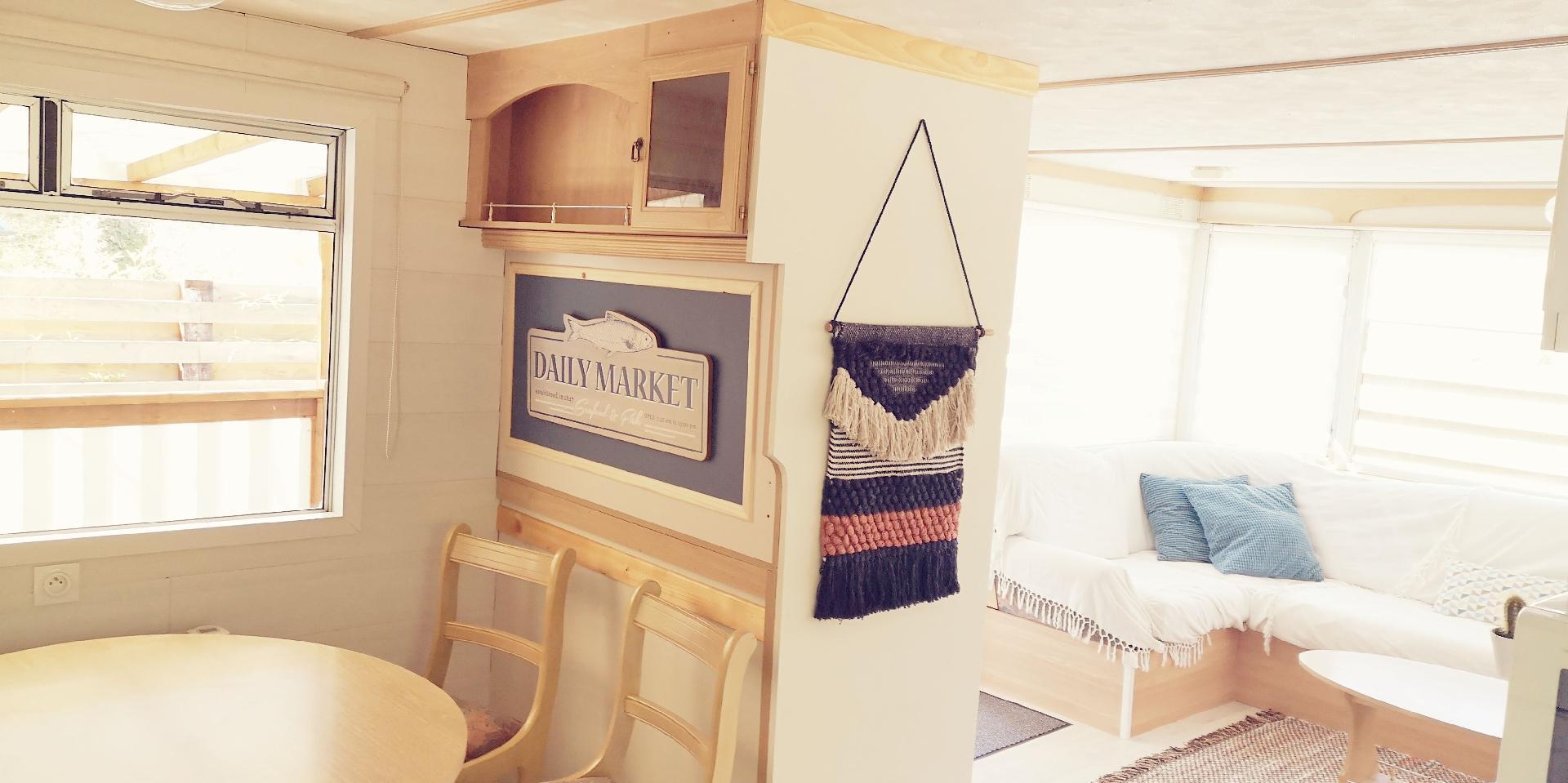 The interior of this mobile home is equipped to meet your needs during your stay. The kitchen is well equipped with a ceramic hob, a dishwasher, a coffee maker with soft pods, an electric kettle and a mini-oven to prepare and enjoy your meals with ease. A washing machine for private use in the accommodation also ensures your comfort. Relaxation is guaranteed with a connected TV, so you can keep up to date with your favourite series and films.