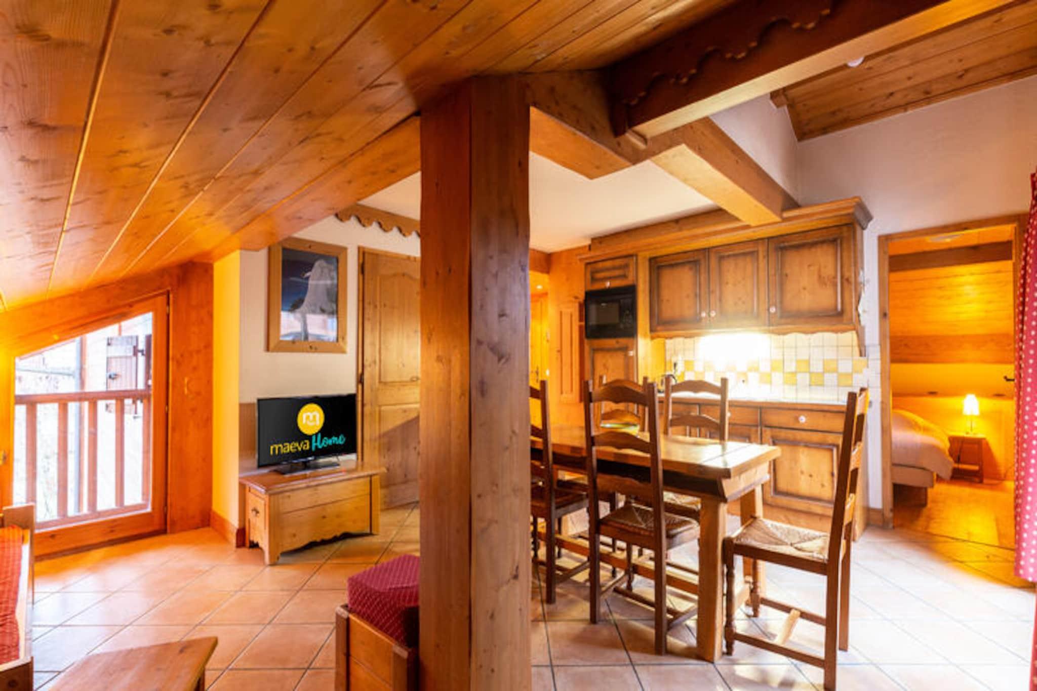 Located in Carroz d'Arraches, this cozy apartment offers a warm, mountain-inspired atmosphere with a living room featuring a sofa, dining table for six, and two bedrooms—one with a double bed and the other with a single and two bunk beds. The apartment includes a bathroom, separate toilet, and a balcony with a village view. Pets are allowed for an additional fee, and a baby kit is available on request. Bed linen and towels are provided, with optional end-of-stay cleaning services. The residence is conveniently located near bars, restaurants, and shops, all within 100 meters. The ski slopes are 800 meters away, with a free shuttle stop nearby. The village center and children’s clubs offering various activities for kids are also easily accessible. Explore the Juno Beach Museum and fishing port for cultural experiences. The apartment features an American-style kitchen, with additional amenities such as a heated indoor swimming pool, sauna (from 15 years old), and wellness area with a Spa Deep Nature® (extra charge). A parking space is available for an additional fee. These modern comforts, combined with stunning mountain views, make it an ideal retreat for families or groups.