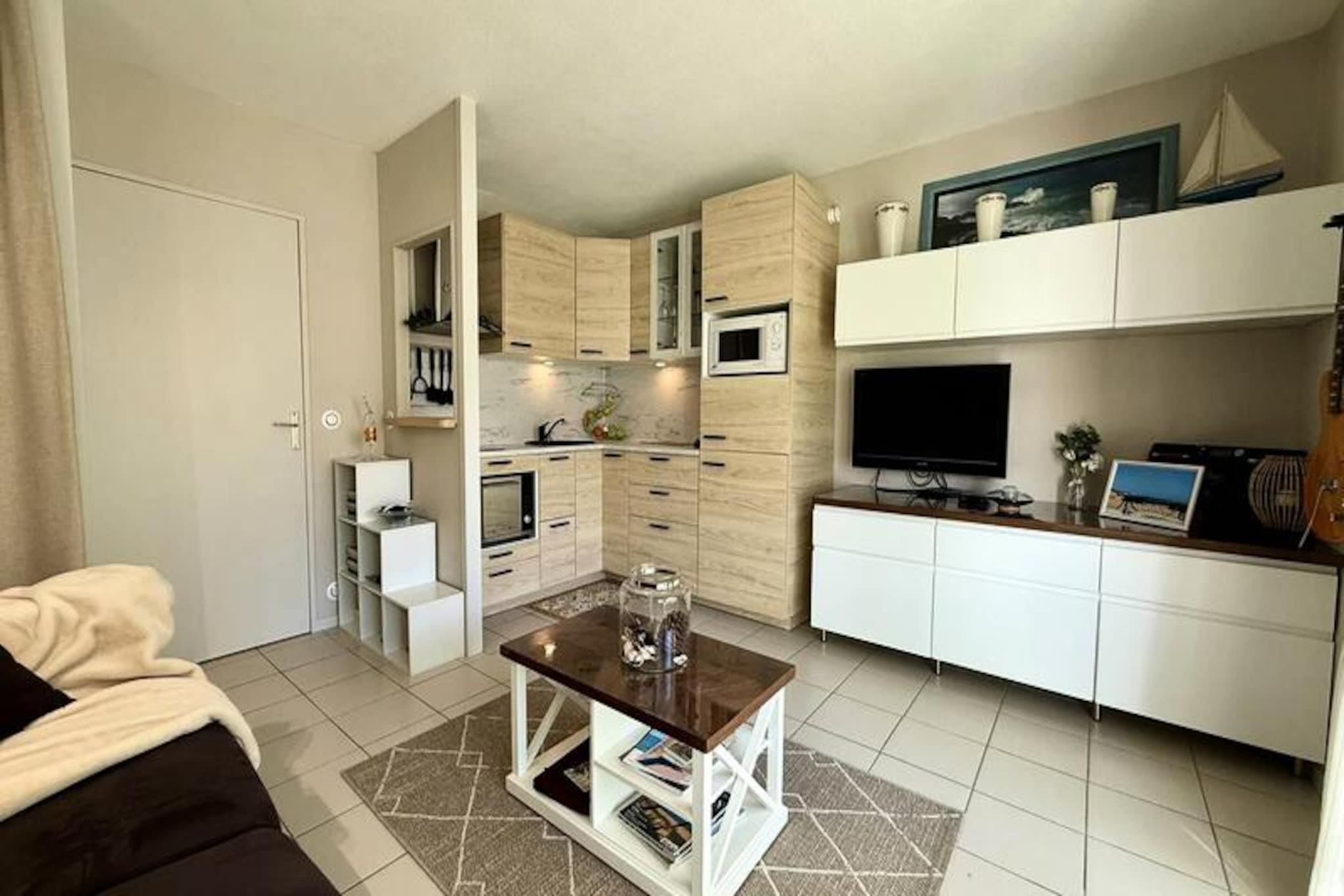 In the heart of Arcachon, just a short stroll from the golden sands and the iconic Notre-Dame Basilica, this charming studio cabin offers a delightful retreat for up to four guests. Whether you're seeking a seaside escape or a tranquil getaway, this ground-floor residence combines modern comfort with a prime location, making it an ideal choice for couples, small families, or friends. \n\nStep inside to discover a thoughtfully designed space of 33 m², featuring a cozy cabin area with two single beds (including a trundle bed) and a well-appointed bathroom with a toilet. The main living area boasts a fully equipped kitchen with everything you need to prepare delicious meals, from a 2-burner induction hob to a Senseo coffee maker. Relax in the stylish living room, complete with a swivel TV and a comfortable 140 cm sofa bed. The west-facing 8 m² loggia, furnished for dining and lounging, is a perfect spot to unwind, offering a serene ambiance no matter the weather.\n\nThe apartment's location is truly unbeatable. The beach is just 350 meters away, inviting you for morning swims or sunset strolls. A Carrefour Market is conveniently located 170 meters from your door, and the vibrant municipal market, brimming with fresh local produce, is just a 10-12 minute walk away. Parking is hassle-free on the nearby streets, and the residence itself is secure and welcoming.\n\nRecently renovated with contemporary decor and ample storage, this studio cabin ensures a comfortable and relaxing stay. With Wi-Fi and internet access included, you'll feel right at home. Whether you're savoring fresh seafood on the loggia, exploring Arcachon's charming streets, or simply soaking up the sun on the beach, this property promises an unforgettable coastal escape.