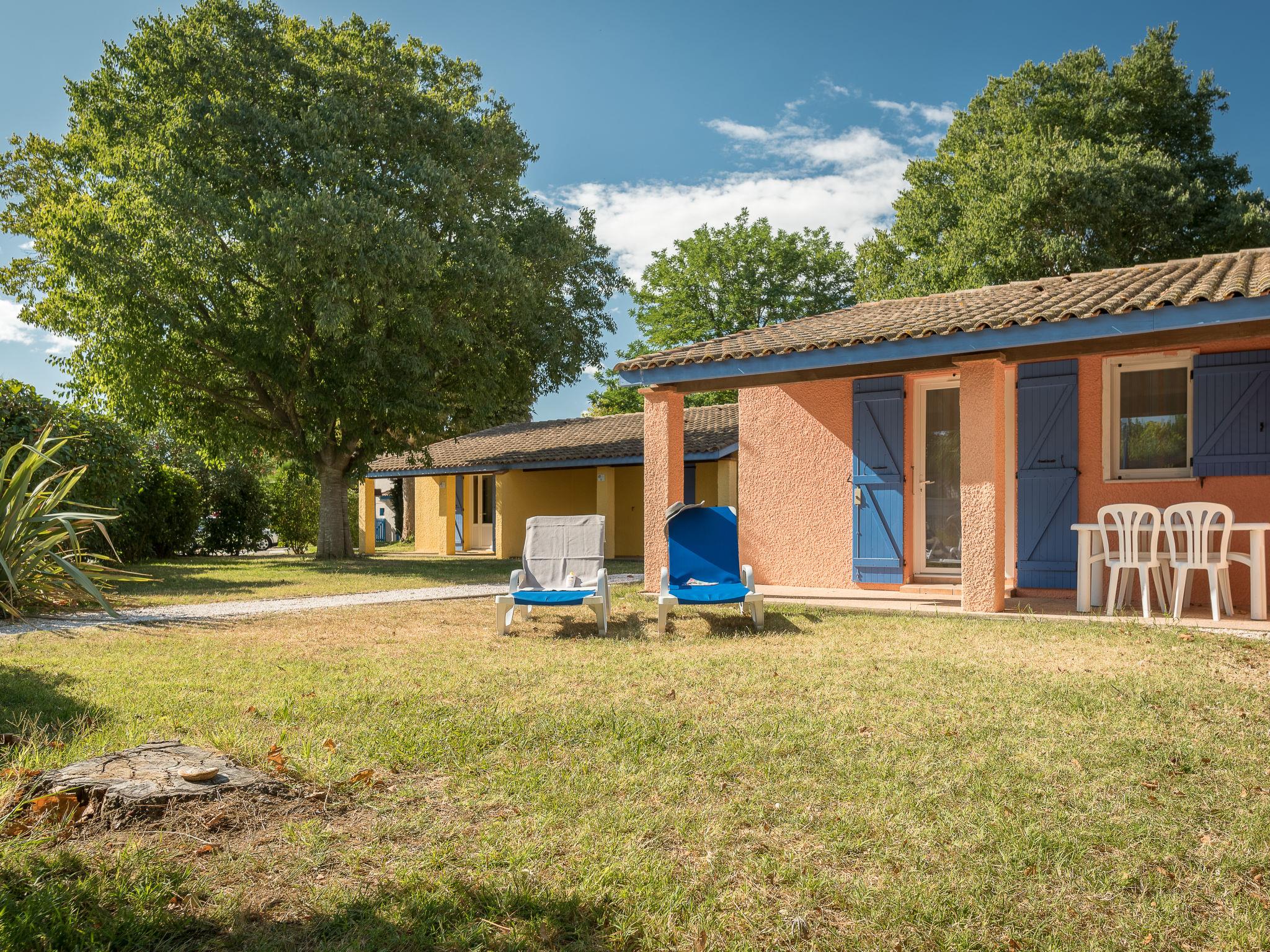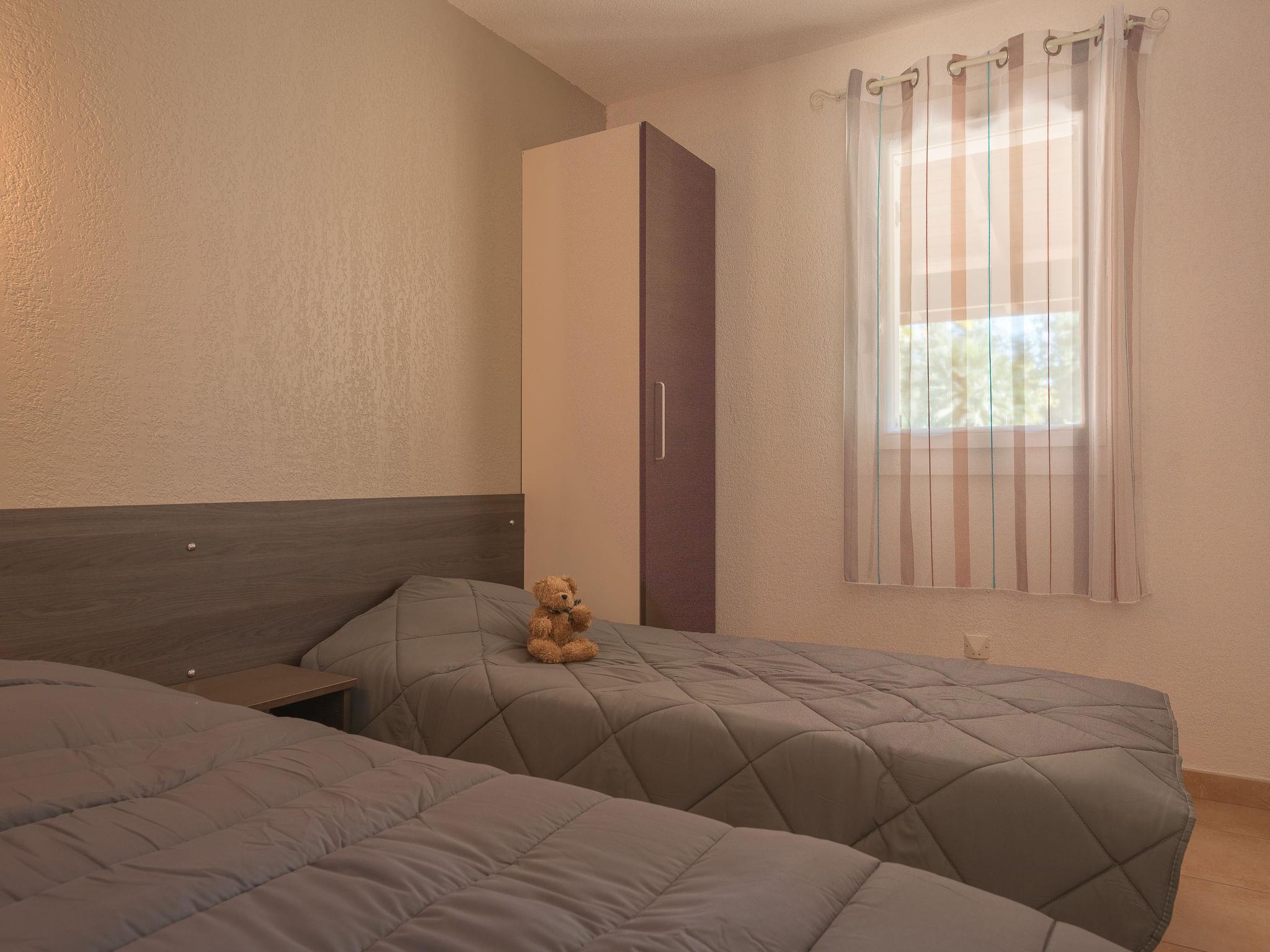 "Le Mediterranée", 3-room terraced house 39 m2. Practical furnishings: living/sleeping room with 1 double sofabed, dining table and satellite TV (flat screen), air conditioning. Exit to the terrace. 1 room with 1 french bed (160 cm, length 200 cm). 1 room with 2 beds (80 cm, length 190 cm). Kitchenette (2 hot plates, dishwasher, toaster, kettle, microwave, freezer, electric coffee machine). Shower, sep. WC. Electric heating, forced-air heating. Terrace partly roofed. Terrace furniture, deck chairs (2). Facilities: children's high chair, baby cot for up to 2 year olds (extra). Internet (WiFi, extra). Please note: maximum 1 pet/ dog allowed. Smoke alarm.