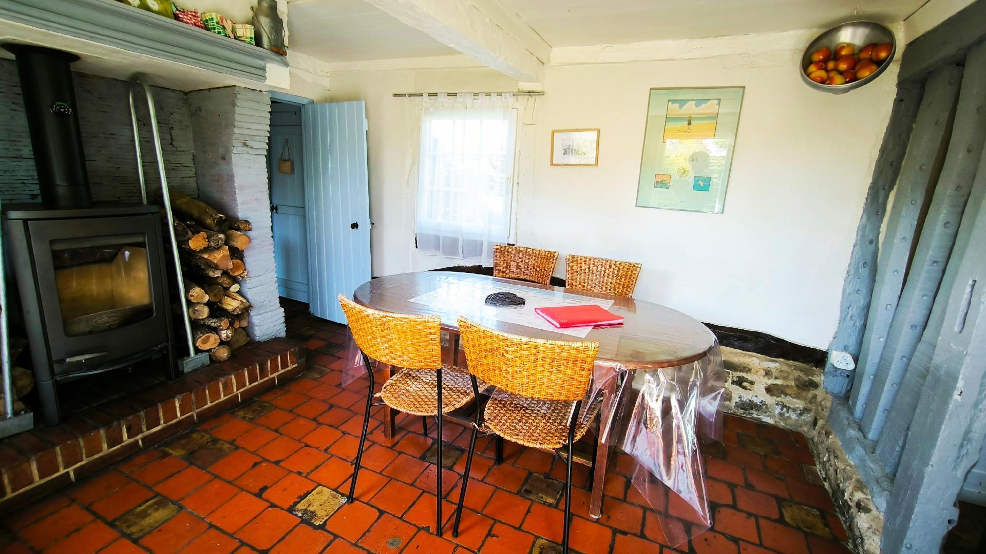 The charm of this property continues outside with a magnificent 200m2 private wooded garden, where you can enjoy al fresco meals on the terrace, relax and breathe in the fresh Normandy air. A wood-burning stove is a welcome addition for cooler evenings or simply for a cosy atmosphere.