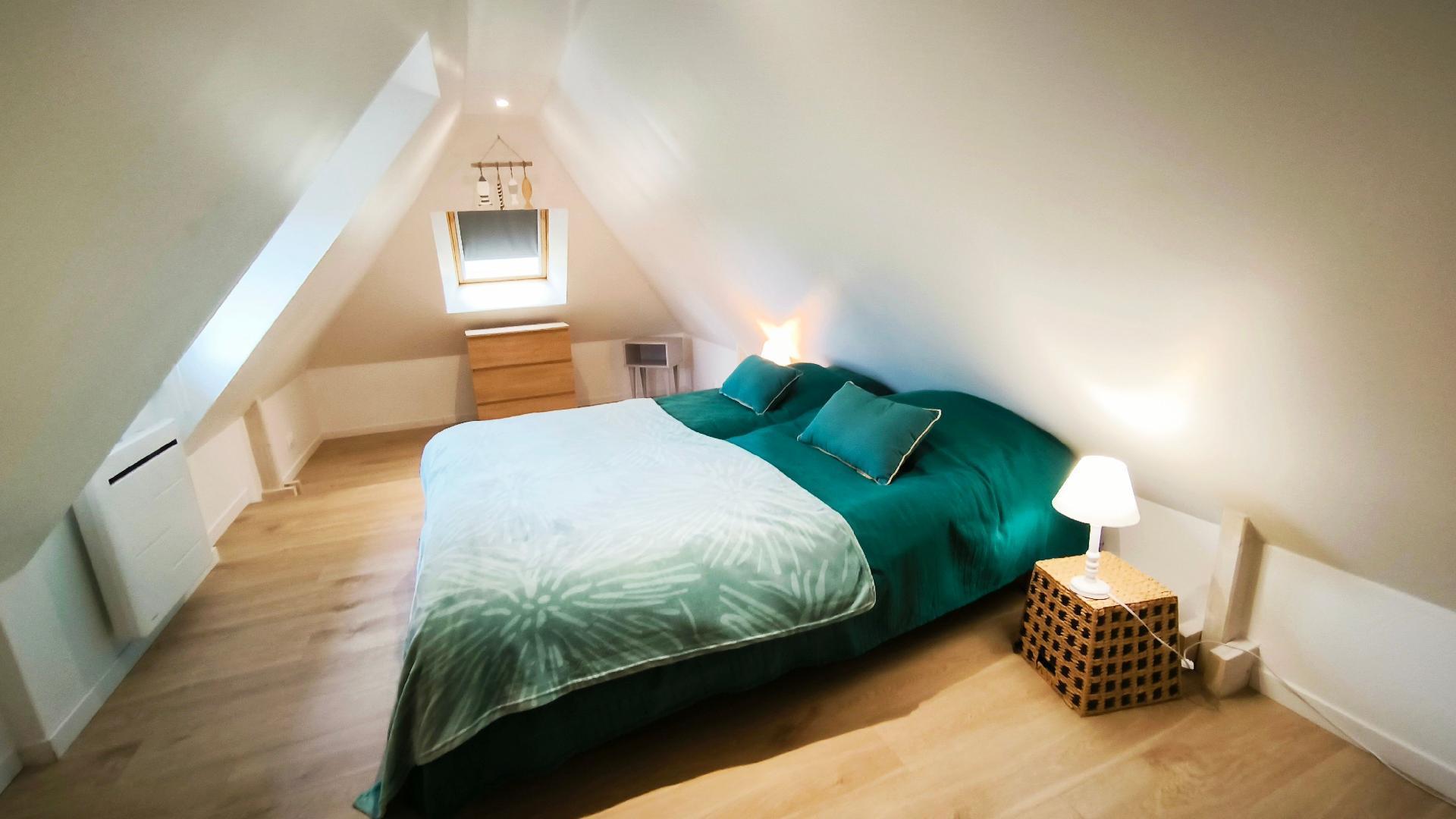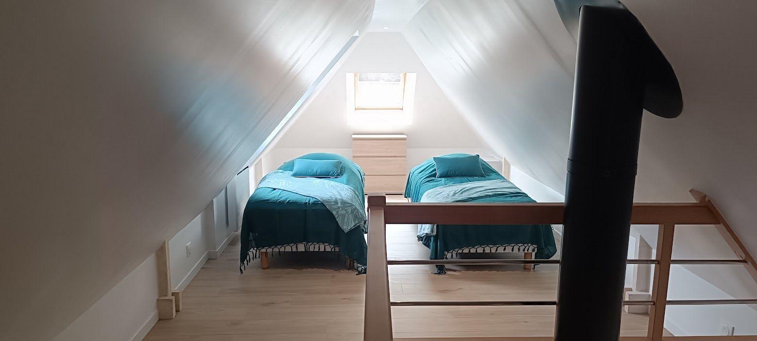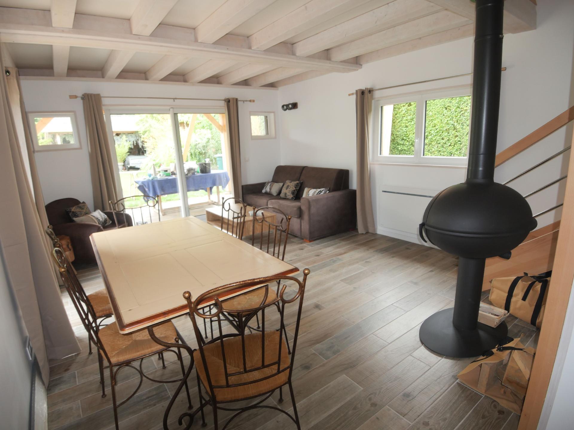 Inside, you'll be greeted by a bright living room with bay window overlooking the garden. The separate kitchen, fully equipped with oven, 12 place dishwasher, microwave and induction hob, invites you to prepare tasty meals. For your comfort, the house has a ground-floor shower room with shower, WC and hairdryer, as well as a second separate WC and a bedroom with a 160 cm bed. The wood-burning stove creates a cosy atmosphere in the house, which is fully tiled on the ground floor and has parquet flooring on the first floor, where there are two attic bedrooms, one with a 140 cm bed, the other with two 80 cm beds that can be converted into a 160 cm bed.