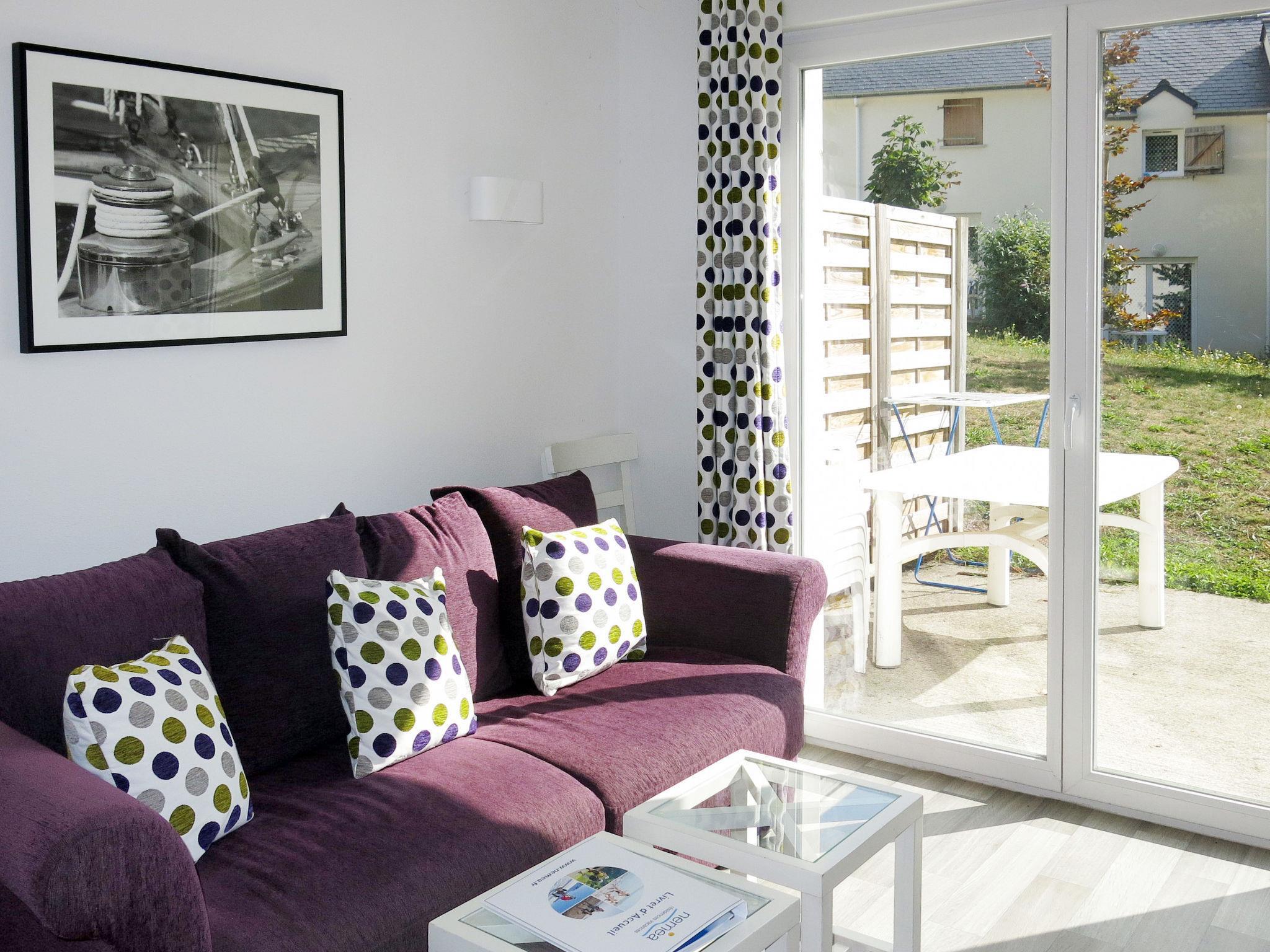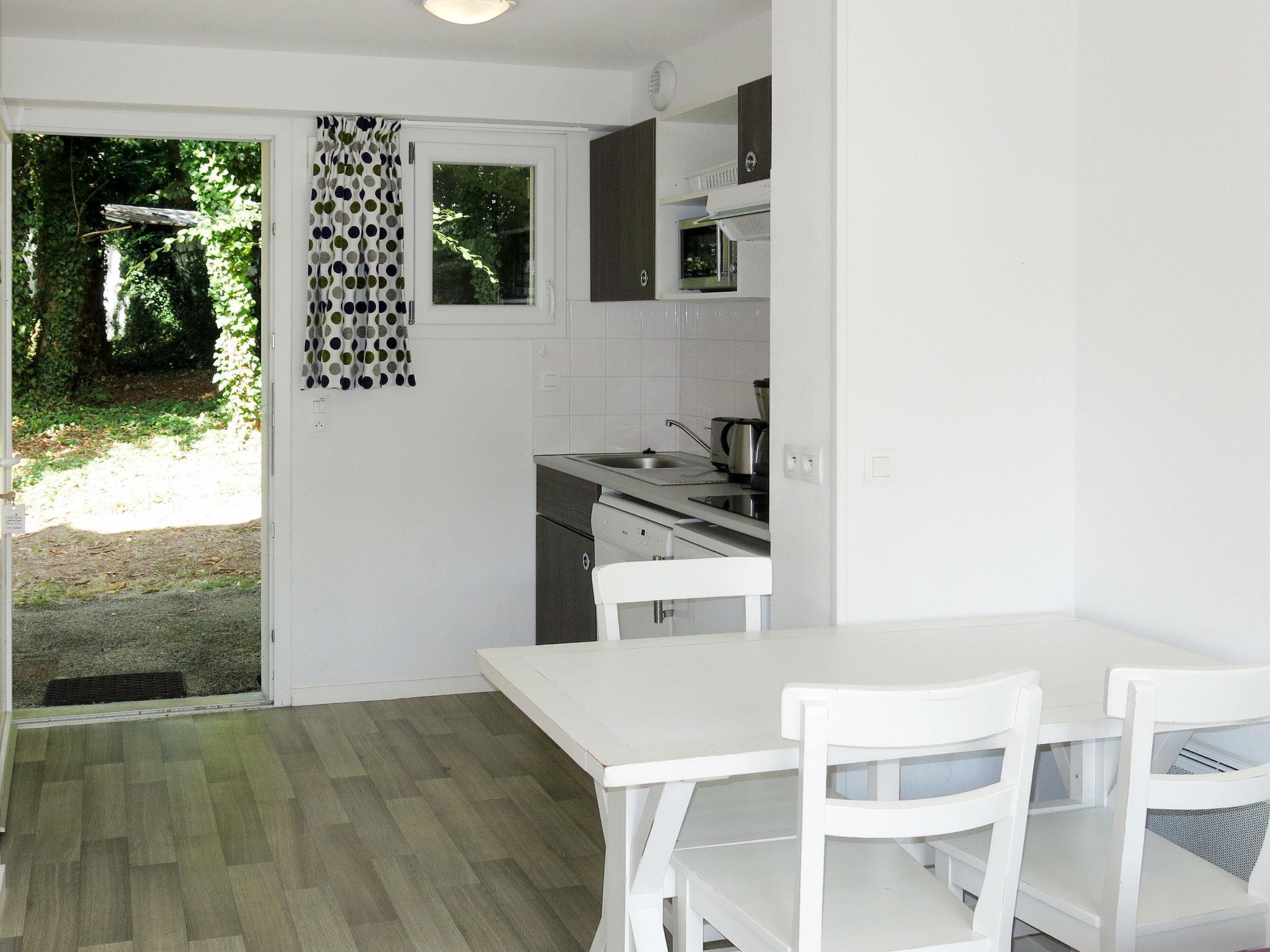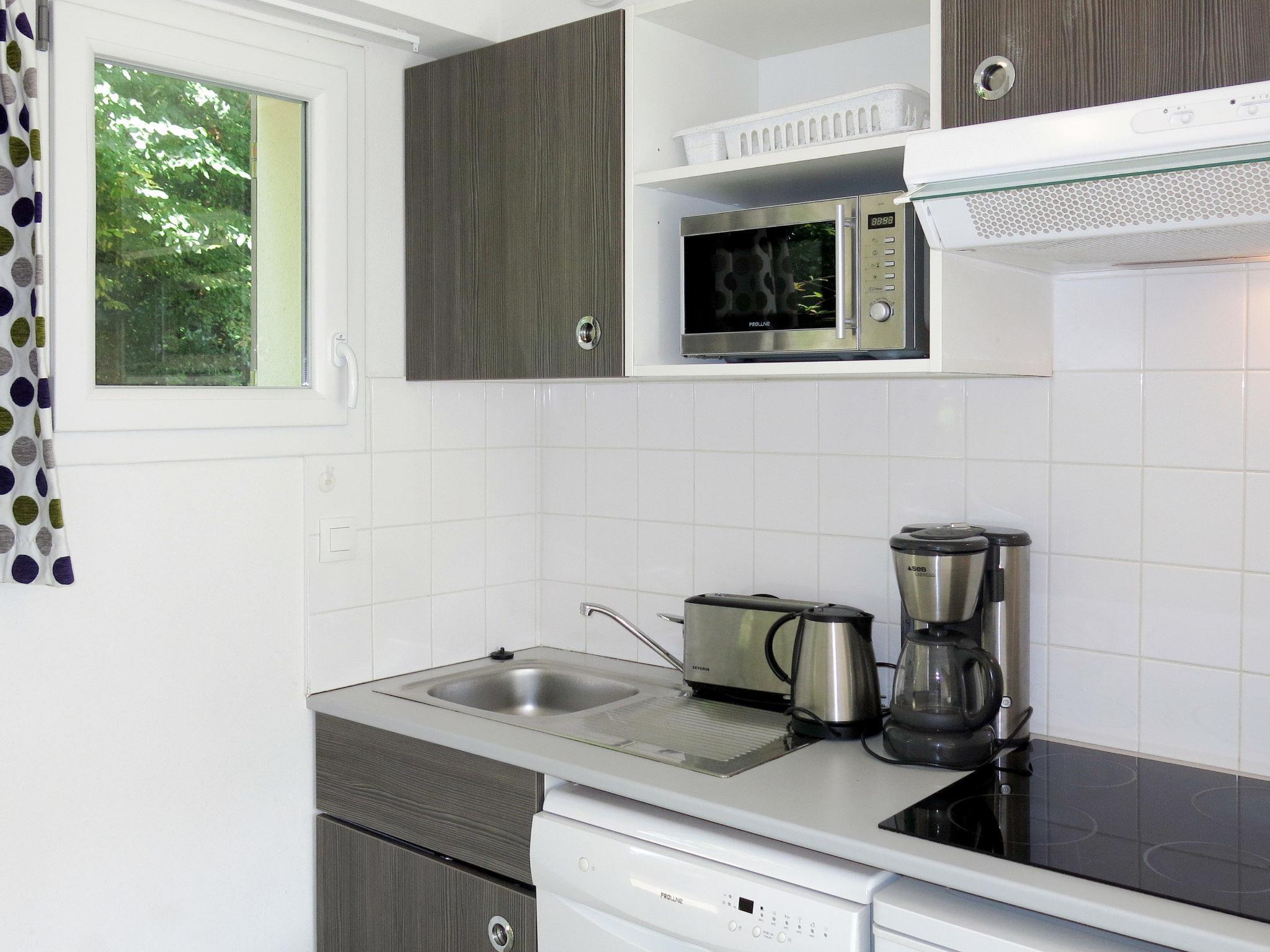 "Domaine de la Baie-T2+cab-duplex, 6 pers", 2-room terraced house 38 m2 on 2 levels. Beautiful furnishings: living/sleeping room with 1 double sofabed, dining table and TV (flat screen). Exit to the terrace. Kitchenette (dishwasher, 2 ceramic glass hob hotplates, toaster, kettle, microwave, electric coffee machine). Sep. WC. Upper floor: 1 room with 1 french bed. Open alcove with 1 x 2 bunk beds. Bathroom. Electric heating. Terrace. Terrace furniture. Please note: non-smokers only. Maximum 1 pet/ dog allowed. Smoke alarm. The property is one of a type of property or apartment. Instead of an enclosed bedroom, some sleeping areas are located in an open-plan area (gallery, alcove, etc.).