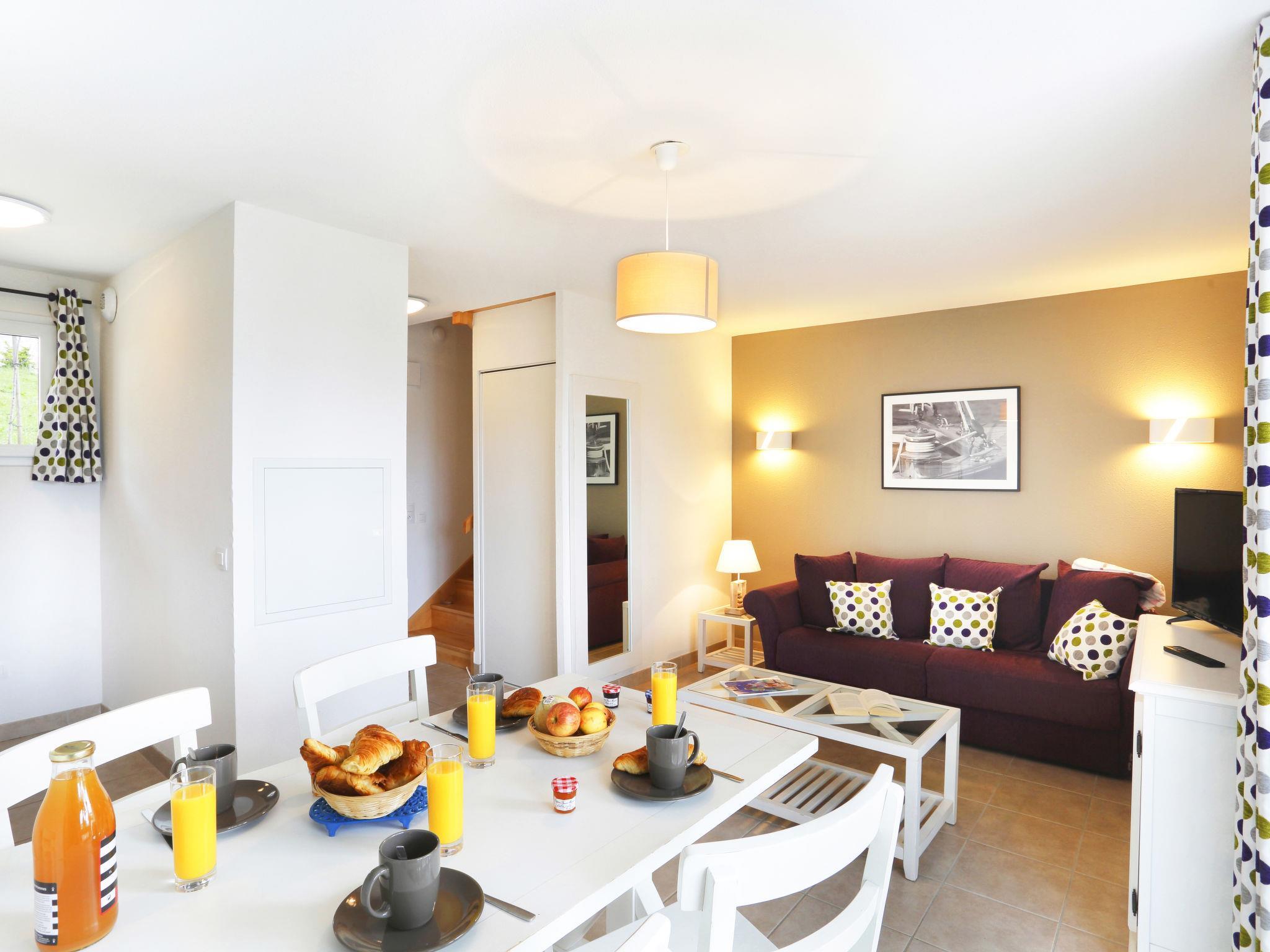 "Domaine de la Baie-T3 duplex 6 pers.", 3-room terraced house 46 m2 on 2 levels. Beautiful furnishings: living/sleeping room with 1 double sofabed, dining table and TV (flat screen). Exit to the terrace. Kitchenette (dishwasher, 4 ceramic glass hob hotplates, toaster, kettle, microwave, electric coffee machine). Upper floor: 1 room with 1 french bed. 1 room with 2 beds. Bathroom, sep. WC. Electric heating. Terrace. Terrace furniture. Please note: non-smokers only. Maximum 1 pet/ dog allowed. Smoke alarm. The property is one of a type of property or apartment.