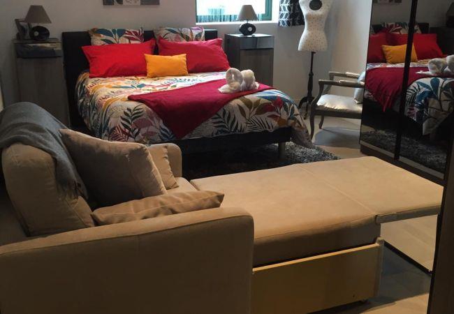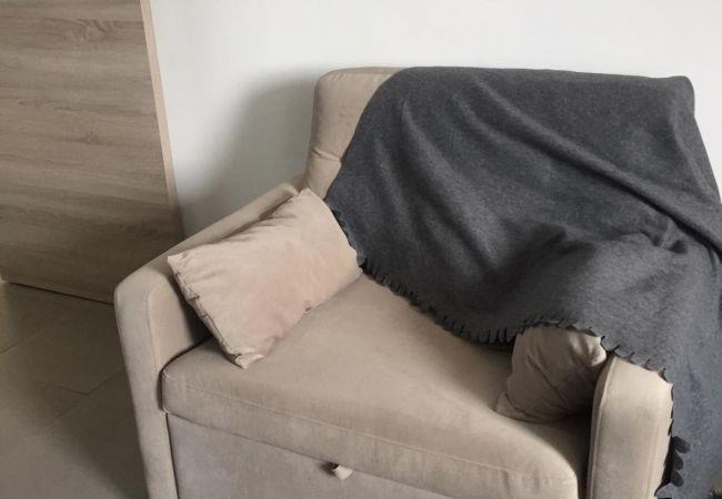 In the same room, there is a small individual sofa that you can transform into a bed.