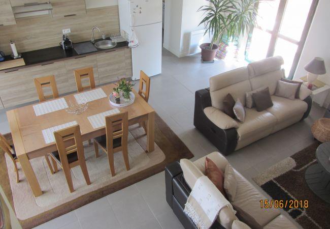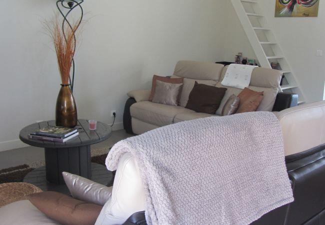 The living room is equipped with a large dining table, a television, but also a second room type mezzanine where there is a double bed.