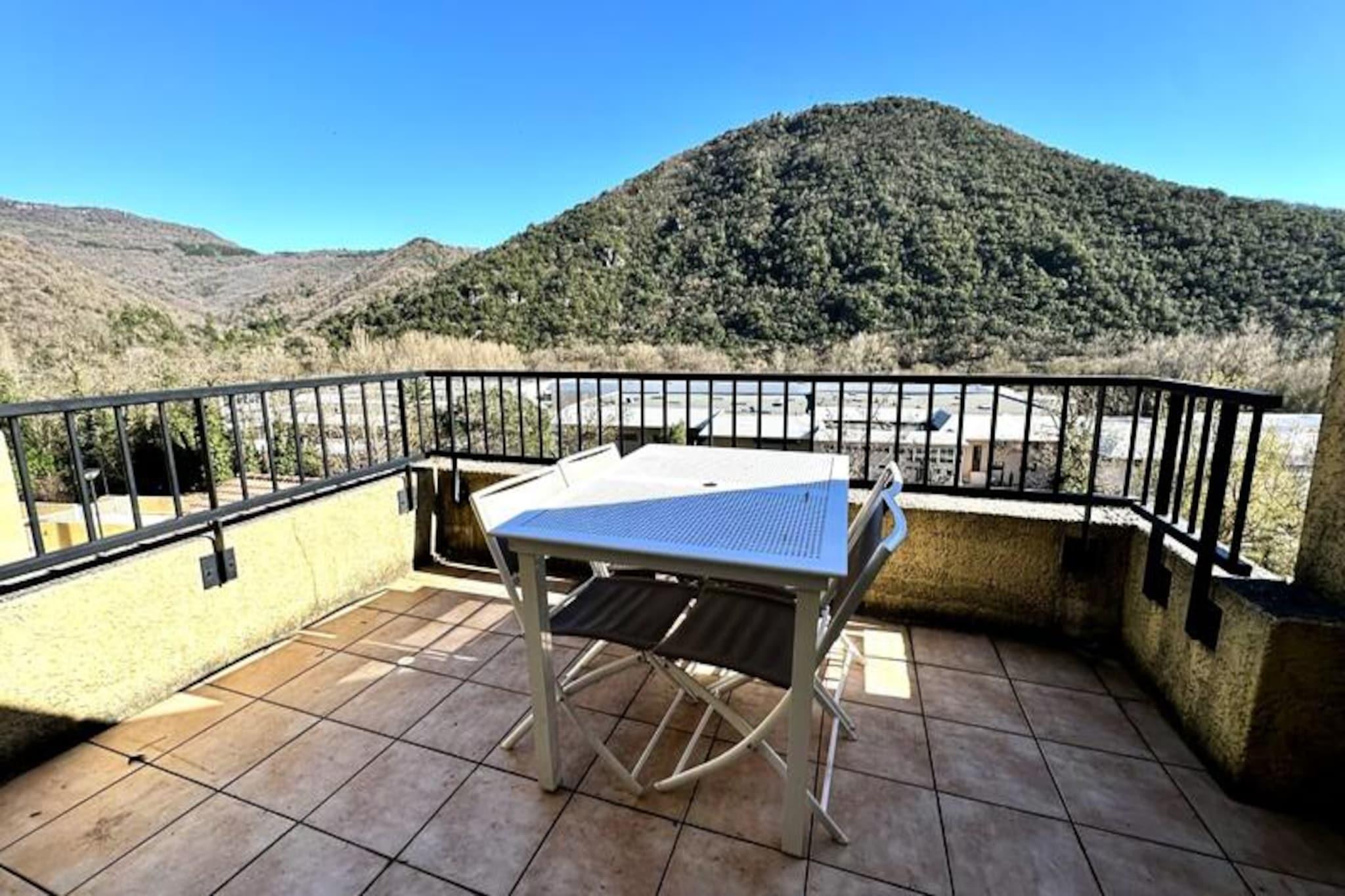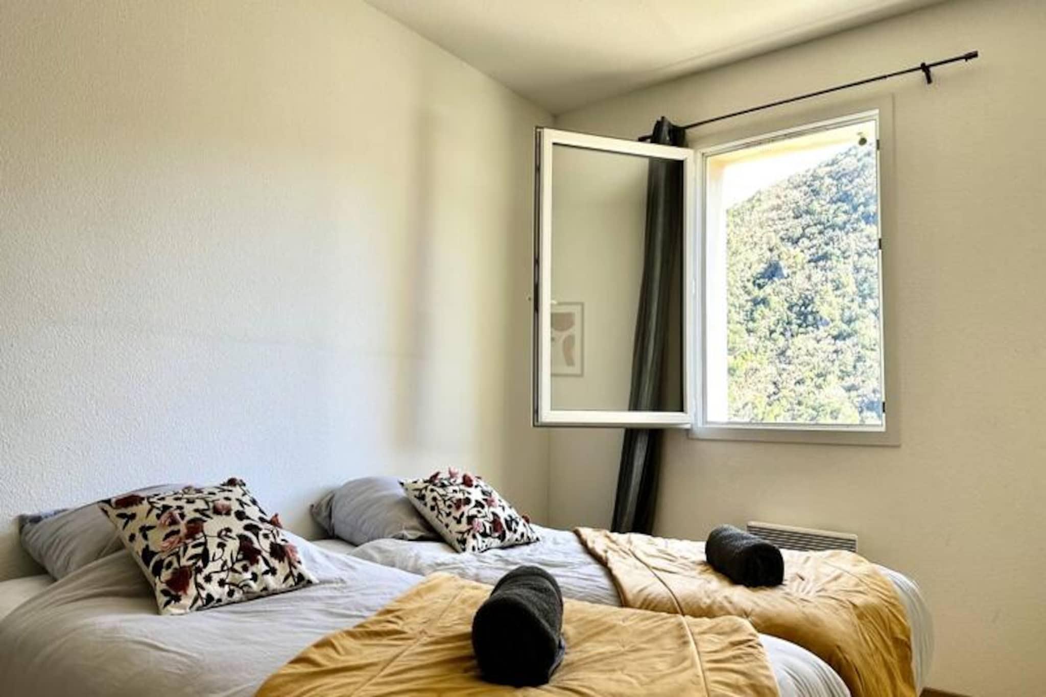 In the heart of the Haut-Languedoc Regional Natural Park, where the Cévennes mountains rise majestically, this charming residence offers a tranquil retreat just a 10-minute walk from the renowned Avène Thermal Spa. Surrounded by lush greenery and the serene Upper Orb Valley, this property is a haven for those seeking relaxation and rejuvenation in a picturesque natural setting. The soothing ambiance of the area, coupled with the therapeutic springs, makes it an ideal destination for spa-goers and nature enthusiasts alike. The apartment, located on the second floor, features a bright and spacious open-plan living area with a fully equipped kitchen, a dining space, and a comfortable sofa bed. The living area opens onto a private terrace, perfect for enjoying your morning coffee or an evening glass of wine while soaking in the peaceful surroundings. With two cozy bedrooms, a modern bathroom, and thoughtful amenities such as free Wi-Fi, bed linens, and towels provided, the apartment ensures a comfortable and hassle-free stay. Guests also have access to a communal swimming pool, open during the summer months, and a large free parking area for added convenience. Beyond the residence, the region offers countless opportunities for outdoor adventures. Explore the stunning hiking trails around Lake Avène, cycle through the scenic Monts d'Orb, or visit the charming village of Olargues, one of France's most beautiful villages. The dramatic Héric and Colombières-sur-Orb gorges, the Caroux and Espinouse mountains, and the vineyards of the Haut-Languedoc are all within easy reach, offering a perfect blend of natural beauty and cultural heritage. Whether you're here for a spa retreat, a weekend getaway, or an active holiday, this residence provides the perfect base to discover the treasures of the Haut-Languedoc. Let the tranquility of the Orb Valley and the charm of Avène rejuvenate your body and soul.