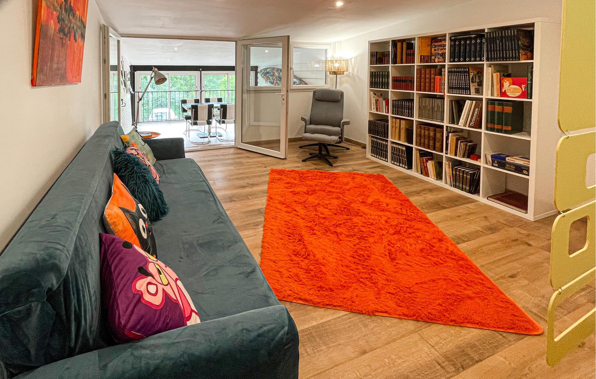 Sie lieben unkonventionelle Urlaubsunterkünfte? Dann werden Sie das bunte Ambiente aus Pop Art und Designer-Möbeln dieser Ferienwohnung begeistern. Machen Sie es sich auf den bequemen Sofas im Wohnzimmer gemütlich, stöbern Sie in den gut sortierten Bücherregalen nach spannender Lektüre oder genießen Sie einen Filmabend auf dem großen Flachbildfernseher. Die voll ausgestattete Küche lädt zu geselligen Kochabenden mit Familie oder Freunden ein.