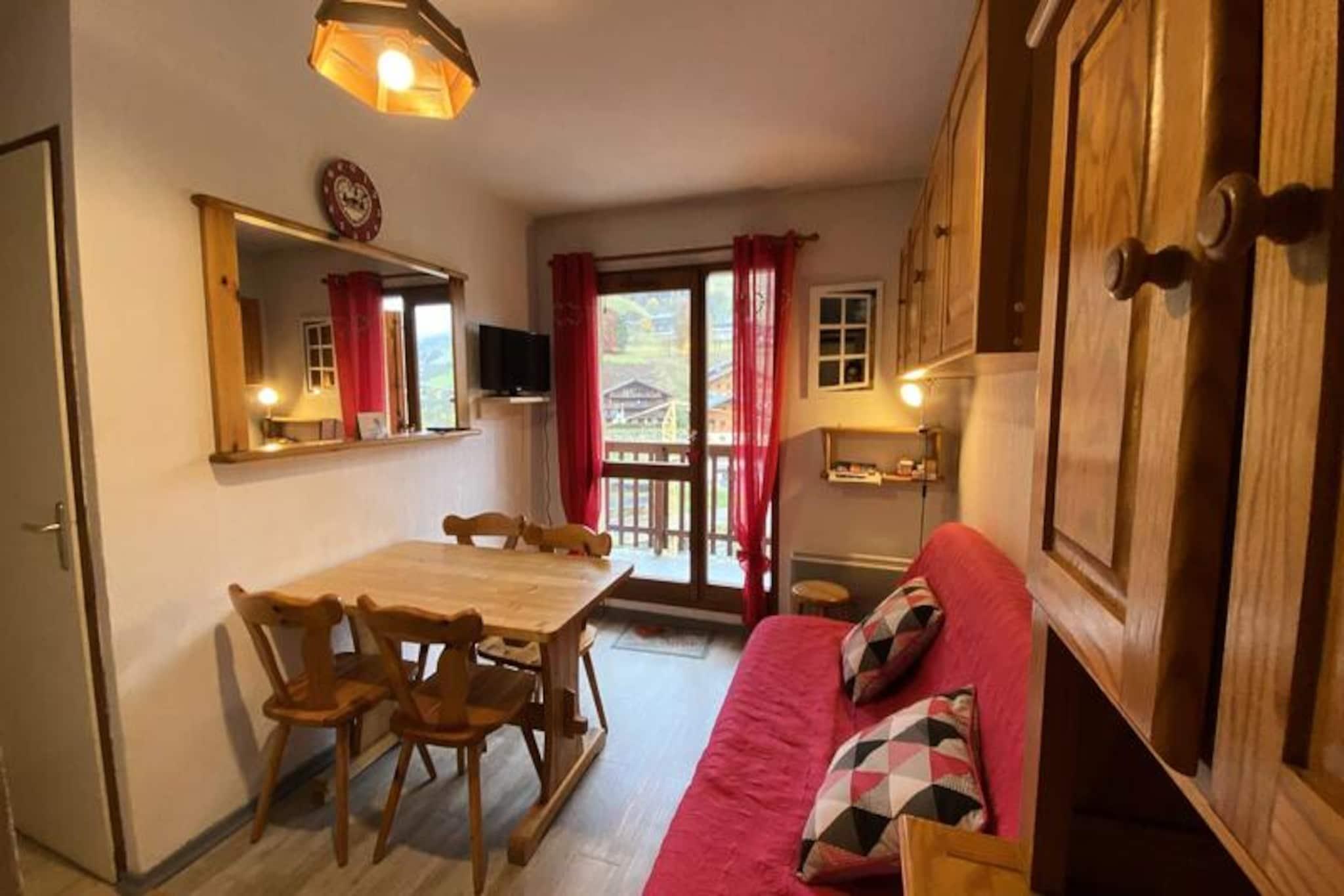 In the heart of the enchanting Areches-Beaufort village, this cozy apartment offers a delightful alpine retreat for up to four guests. With its raised ground floor location and a west-facing balcony, you’ll enjoy uninterrupted views of the surrounding mountains, perfect for soaking in the serene beauty of the French Alps. Whether you’re visiting for skiing adventures or a relaxing summer getaway, this property provides a warm and welcoming base for your holiday. \n\nThe 24m² apartment is thoughtfully designed for comfort and functionality. The entrance features a sleeping cabin with bunk beds, ideal for children or friends, while the living room includes a sofa bed and a TV for cozy evenings. The kitchenette is fully equipped with modern appliances, including a dishwasher, raclette and fondue set, kettle, toaster, and filter coffee maker, ensuring you can prepare delicious meals with ease. A small bedroom with a double bed offers a peaceful retreat, and the bathroom with a shower and separate toilet adds convenience to your stay. \n\nLocated within the Val Blanc II residence, guests can enjoy access to a shared swimming pool during the summer months, adding a refreshing touch to your holiday. The property is just a short stroll from local shops and ski slopes, making it an ideal choice for both winter sports enthusiasts and those seeking to explore the charming village atmosphere. \n\nWhether you’re drawn to the thrill of skiing, the tranquility of mountain walks, or the vibrant local culture, this apartment invites you to create unforgettable memories in the heart of the French Alps. Perfectly blending comfort, convenience, and breathtaking surroundings, it’s a destination you’ll want to return to again and again.