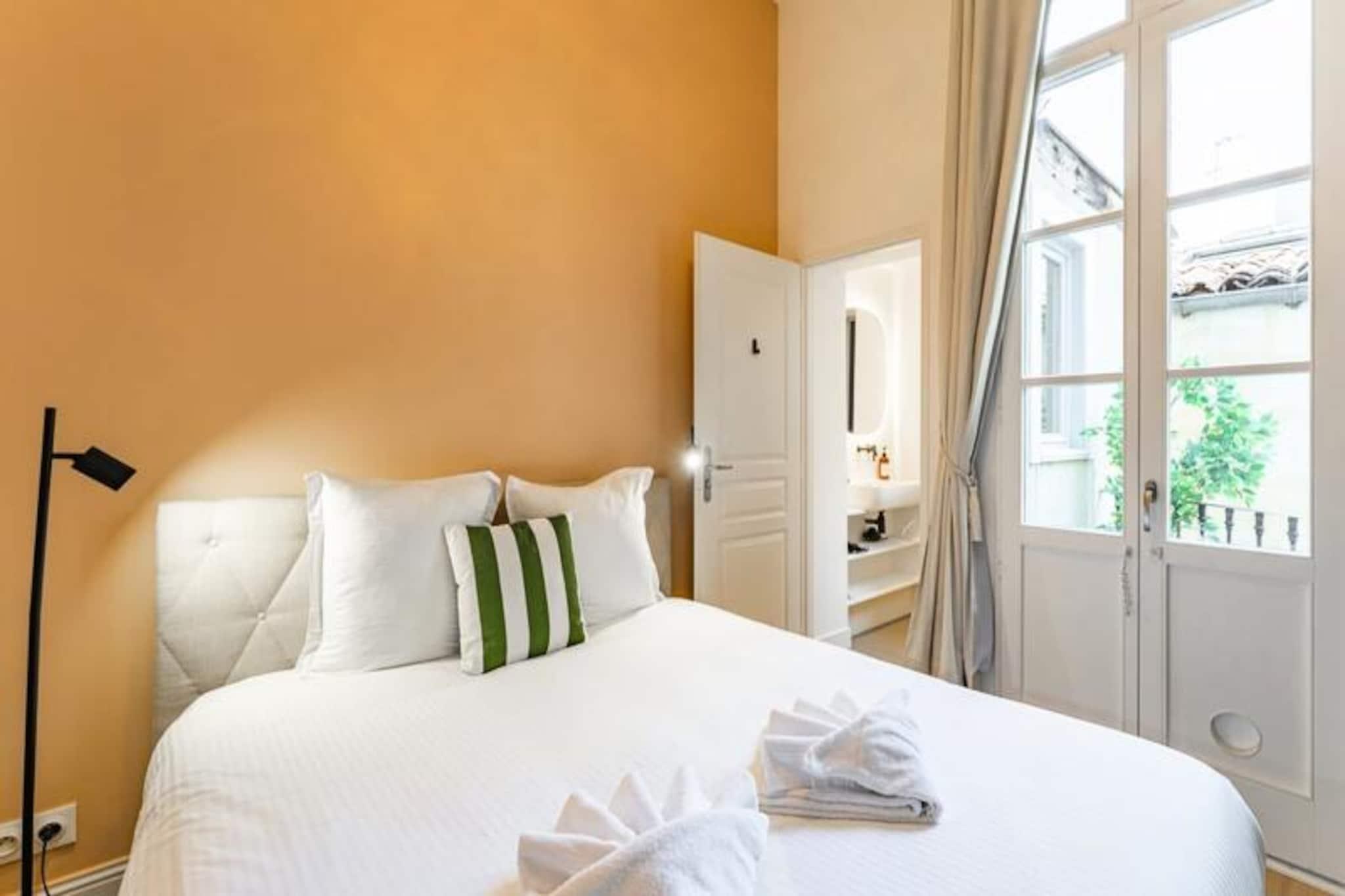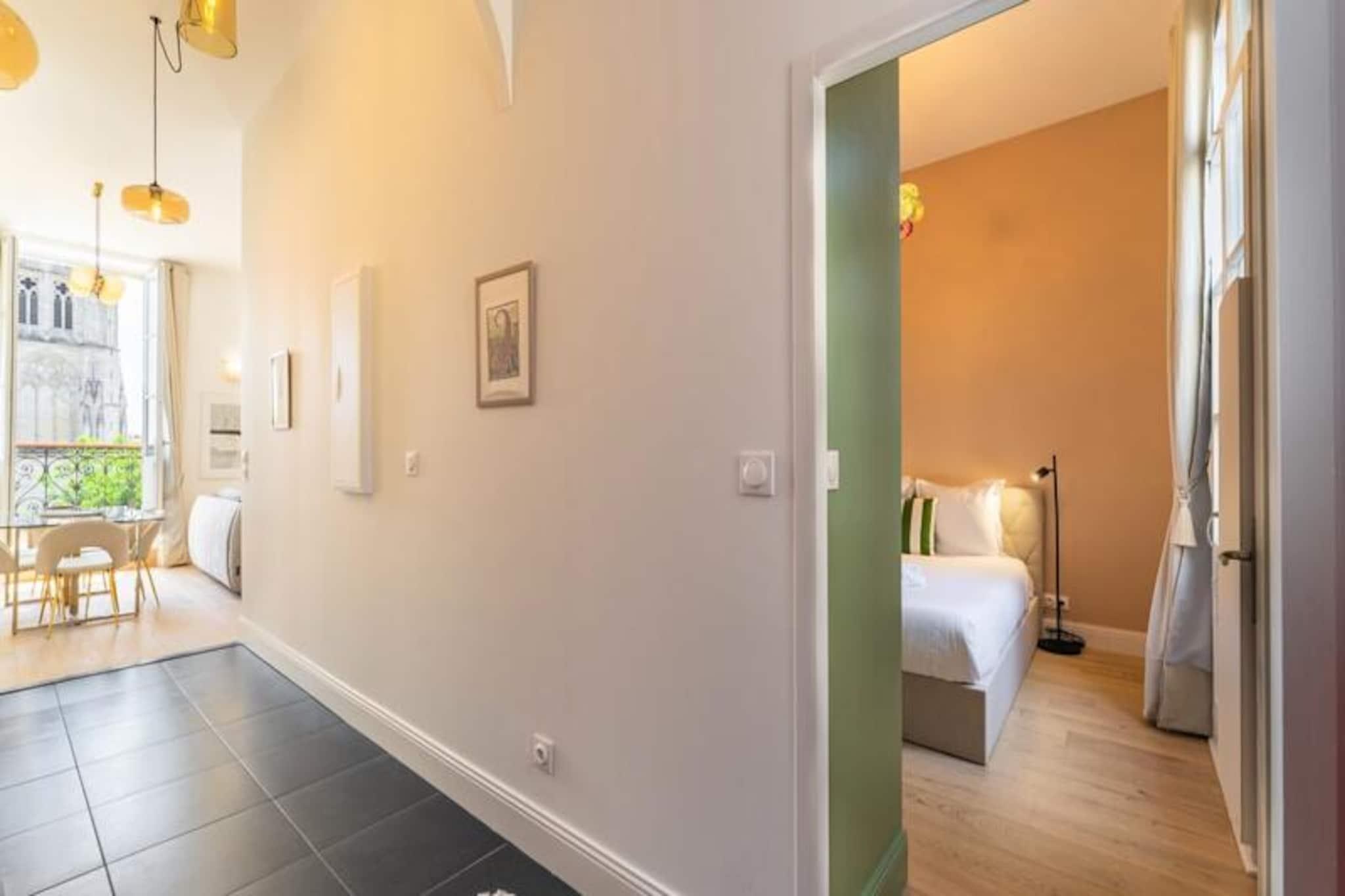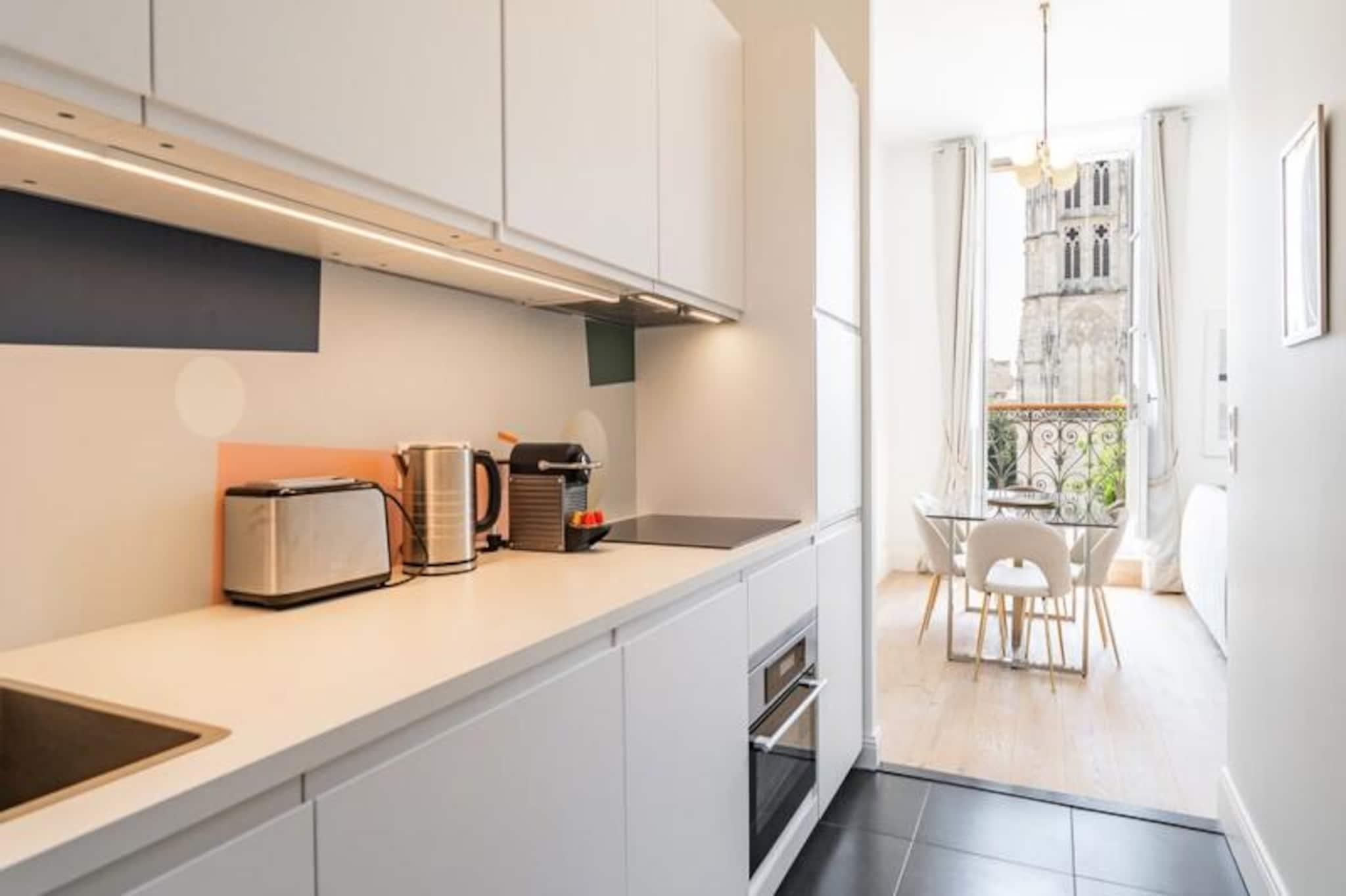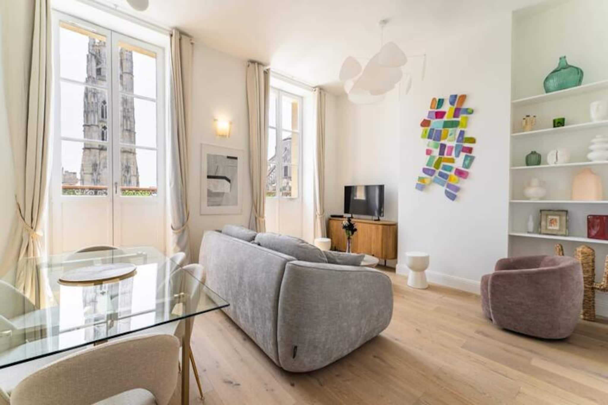 In the heart of Bordeaux, where history and elegance converge, this stunning apartment on Place Pey Berland offers an unparalleled experience. From your private balcony, take in breathtaking views of the iconic Saint-André Cathedral, a masterpiece of Gothic architecture that stands as a symbol of the city’s rich heritage. Immerse yourself in the vibrant atmosphere of this UNESCO World Heritage Site, where cobblestone streets lead to charming cafes, boutiques, and cultural landmarks. This third-floor apartment is a harmonious blend of old-world charm and modern luxury. The bright living room, adorned with tasteful décor, features a comfortable sofa bed and a flat-screen TV, creating a welcoming space to relax after exploring the city. The fully equipped open-plan kitchen invites you to prepare meals while enjoying the convivial ambiance. The serene bedroom, complete with an en-suite bathroom and a large shower, ensures restful nights, while air conditioning provides comfort year-round. A rare gem in Bordeaux, private parking is included, offering unmatched convenience in this bustling city center. Step outside, and you’re just moments from Bordeaux’s treasures. Stroll along Rue Sainte-Catherine, one of Europe’s longest pedestrian streets, or visit the Grosse Cloche, a medieval bell tower steeped in history. Art enthusiasts will appreciate the nearby Museum of Fine Arts, while food lovers can indulge in traditional French cuisine at local restaurants. With the tram stop just steps away, the entire city is at your fingertips. Whether you’re here to explore Bordeaux’s legendary wine culture, admire its architectural marvels, or simply soak in its vibrant ambiance, this apartment is the perfect base for an unforgettable stay. Experience the essence of Bordeaux, where every corner tells a story and every moment is filled with charm.