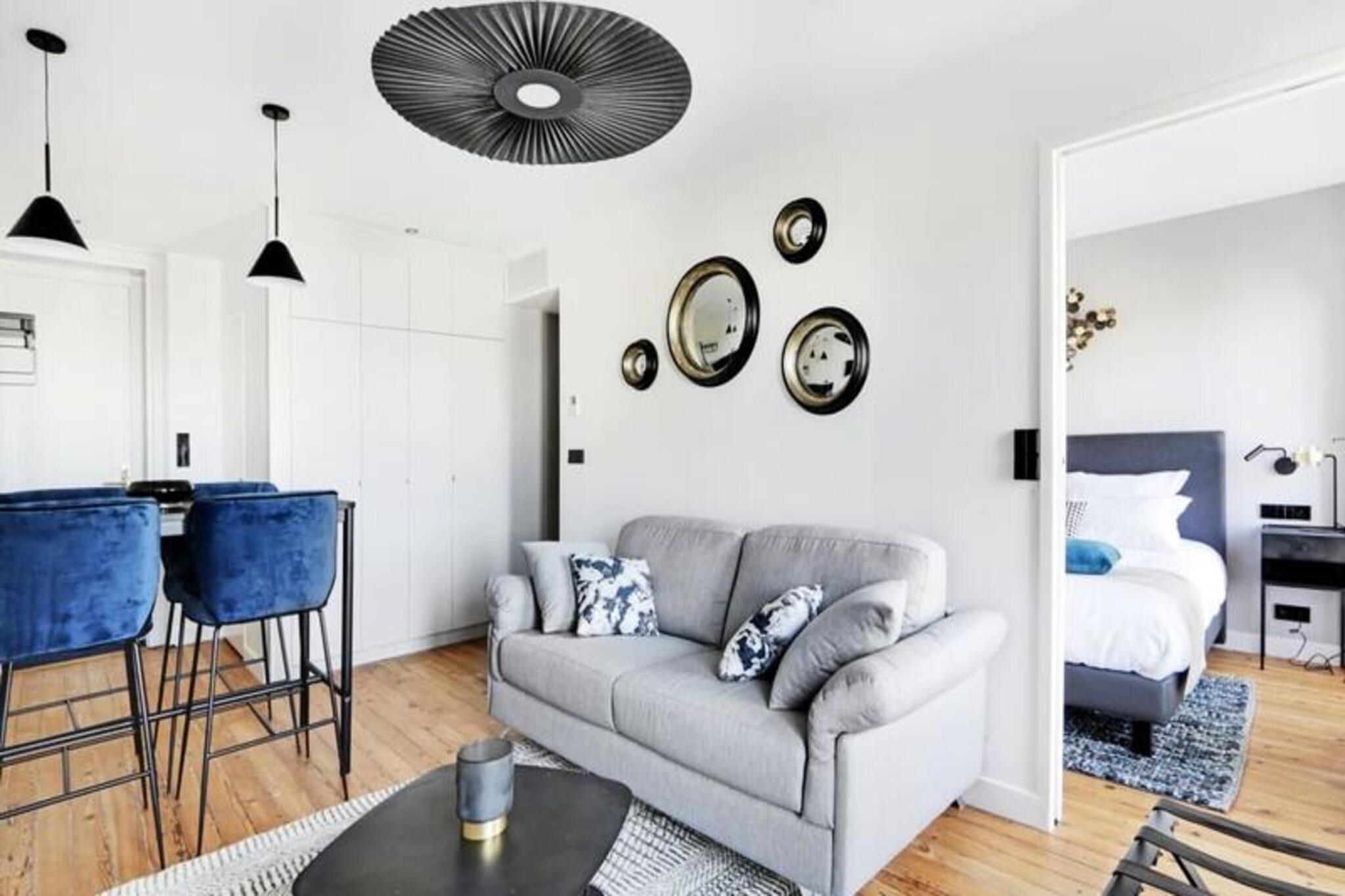 This stylish duplex suite, located on the top floor, offers a panoramic view over the rooftops of Bordeaux, making it an ideal getaway for families or friends. The space features two bedrooms, including a mezzanine-level master bedroom with a king-size bed, and a comfortable sofa bed in the living room, accommodating up to four guests. Two modern bathrooms with Italian showers and separate toilets ensure privacy and comfort throughout your stay. The fully equipped kitchen allows you to prepare your favorite meals, which can be enjoyed around the dining table in the cozy lounge area. For your convenience, the suite includes air conditioning, a safe, satellite TV, and high-speed Wi-Fi access. The apartment is designed to offer an exceptional level of comfort and autonomy, with a connected lock system for easy, secure entry. The apartment is situated in a chic and peaceful residential area, just a 5-minute walk from the Public Garden, perfect for leisurely strolls. The location also provides easy access to tram line C, allowing you to explore Bordeaux’s top attractions, such as the historic Place de la Bourse, the stunning Bordeaux wine shops, and the iconic La Cité du Vin wine museum. Whether you're here to enjoy Bordeaux's rich history, architecture, or local cuisine, this duplex offers an excellent base for exploring the city.