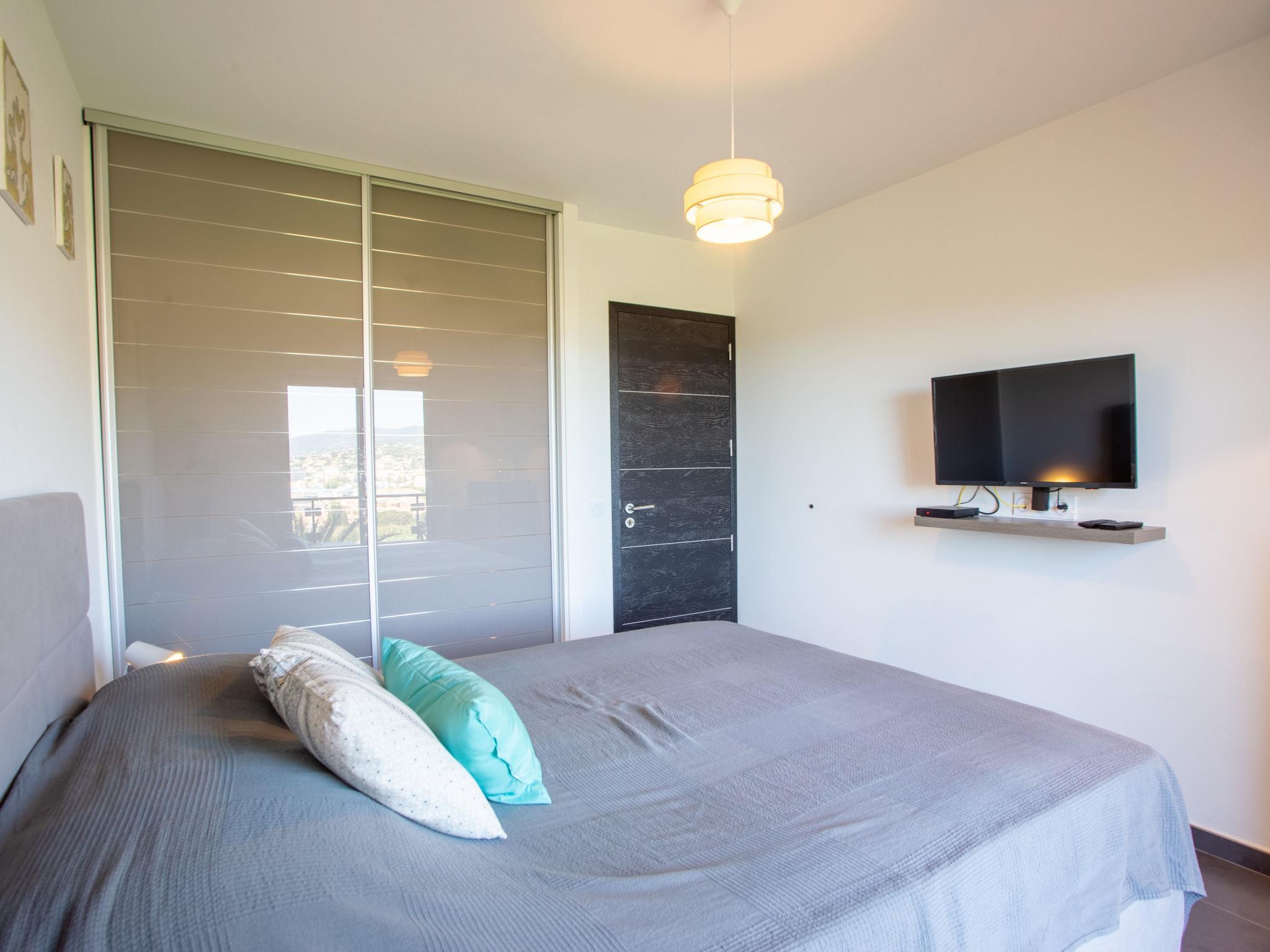 "Un autre jour ensoleillé", 2-room apartment 40 m2, on the upper ground floor. Renovated in 2021, comfortable and beautiful furnishings: living/dining room with radio and CD-player. Exit to the terrace. 1 room with 1 french bed (160 cm, length 200 cm), TV (flat screen). Exit to the terrace. Open kitchen (oven, dishwasher, 4 induction hot plates, toaster, kettle, microwave, freezer, electric coffee machine). Shower/WC, sep. WC. Electric heating, air-conditioning. Balcony 15 m2. Balcony furniture. Beautiful view of the sea and the countryside. Facilities: washing machine, hair dryer. Internet (WiFi, free). Parking. Please note: non-smokers only. TV only FR. Smoke alarm. 83019000885TG