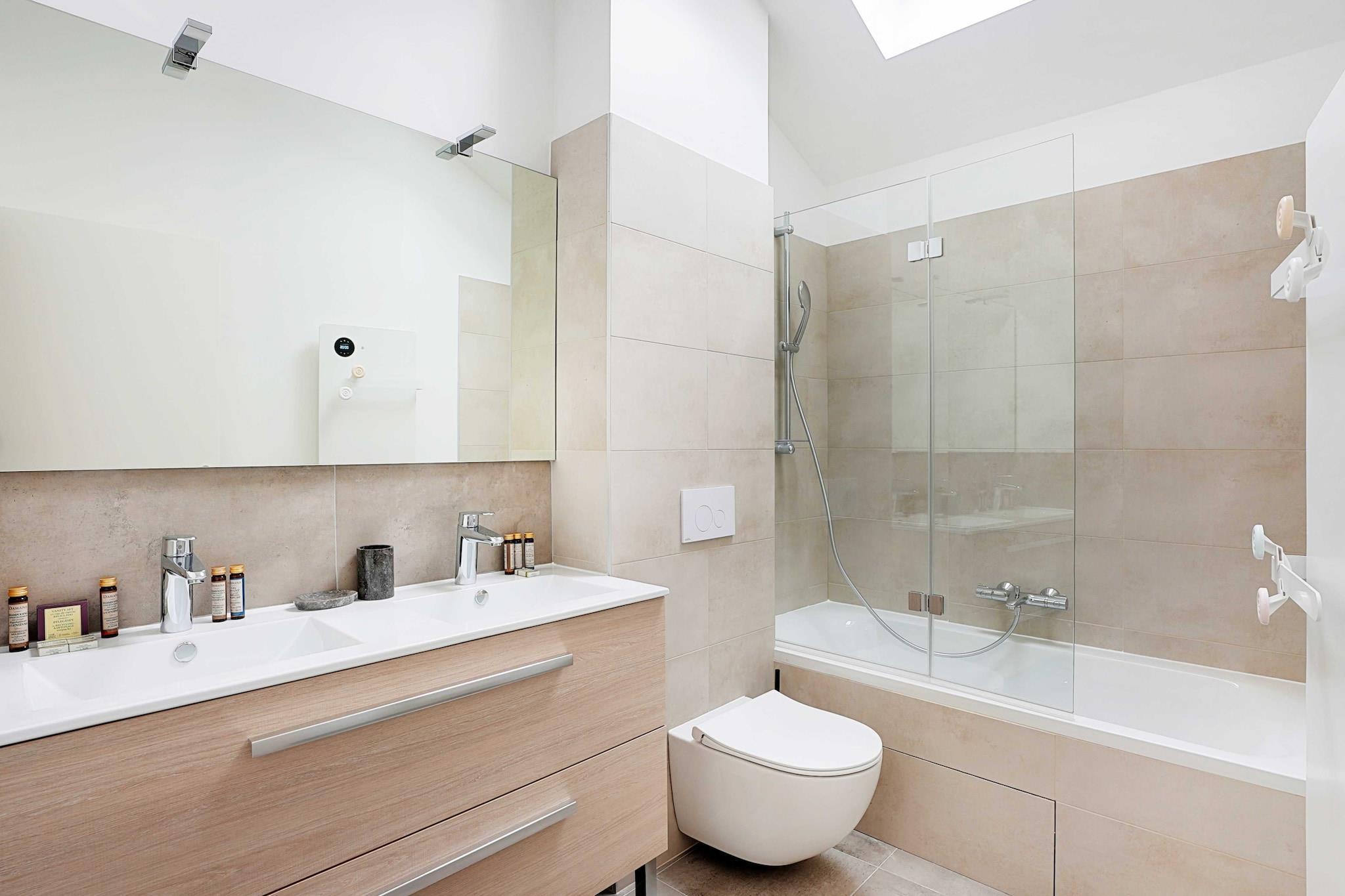 Ground floor: (Living room(TV, dining table, seating area), Kitchen(hob, electric kettle, toaster, hood, coffee machine, oven, microwave, dishwasher, fridge, dishes and cutlery, Cooking basics, Wine glasses), bedroom(Queen Bed), bedroom(Queen Bed), bedroom(Queen Bed), bedroom(single bed), bathroom(Hot Water, bath tub, washbasin, toilet, hairdryer, shampoo, body soap, Essentials), bathroom(shower, washbasin, hairdryer, shampoo, body soap, hot water, Essentials), toilet, toilet) Bed Linen, Internet Access DSL, Wardrobe, tumble dryer, washing machine, heating, iron, Towels/Sheets (Incl.), Carbon monoxide detector, Cleaning Disinfection, Cleaning products, Downtown, Enhanced cleaning practices, High touch surfaces disinfected, Long term stays allowed, Town