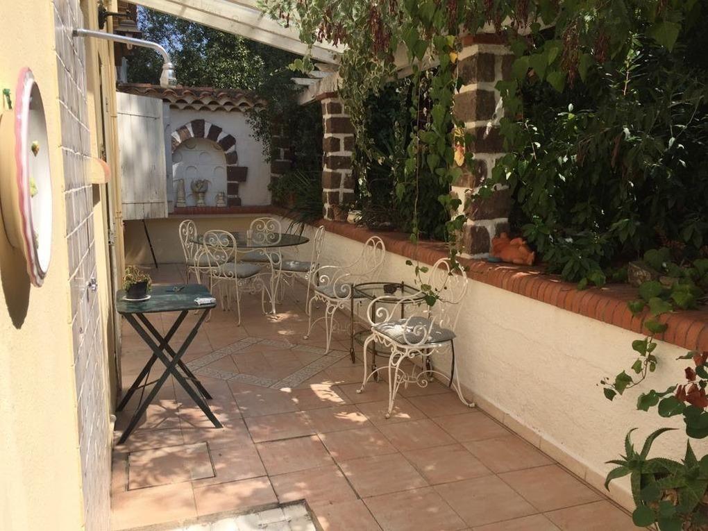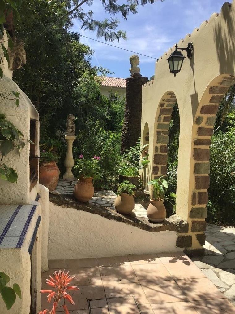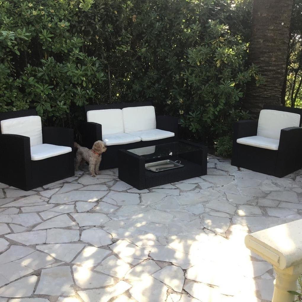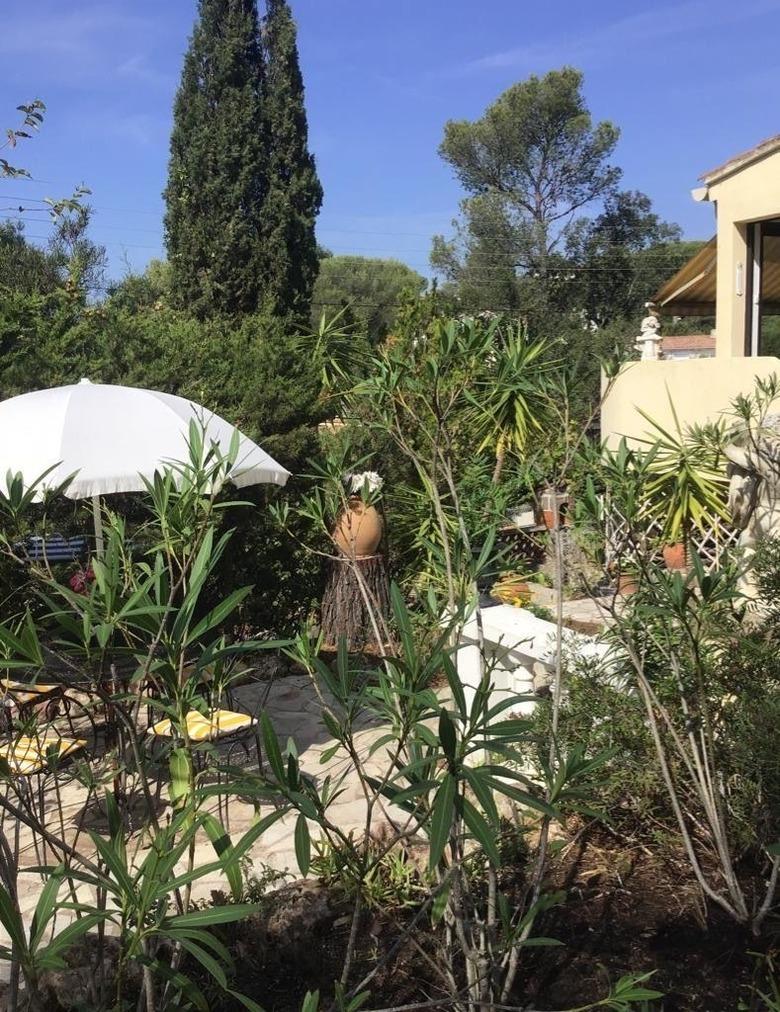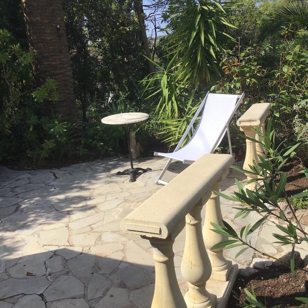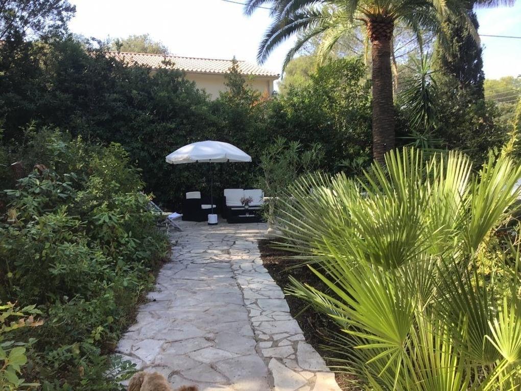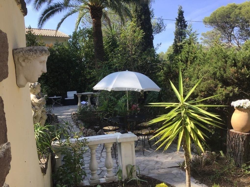 Der große Garten ist terrassenförmig angelegt. Auf der großen Terrasse befinden sich Sitzmöglichkeiten für bis zu 6 Personen, ebenfalls sind Liegestühle vorhanden. Es gibt noch 2 weitere Terrassen mit Tischen und Stühlen, ebenfalls einen überdachten Freisitz. Der Garten ist mediteran, etliche Palmen säumen den Eindruck. Der Garten ist sehr ruhig und nicht einsehbar. Ebenfalls sind ein fester Grill und eine Dusche für Sie nutzbar. Parkmöglichkeit direkt vorm Haus.