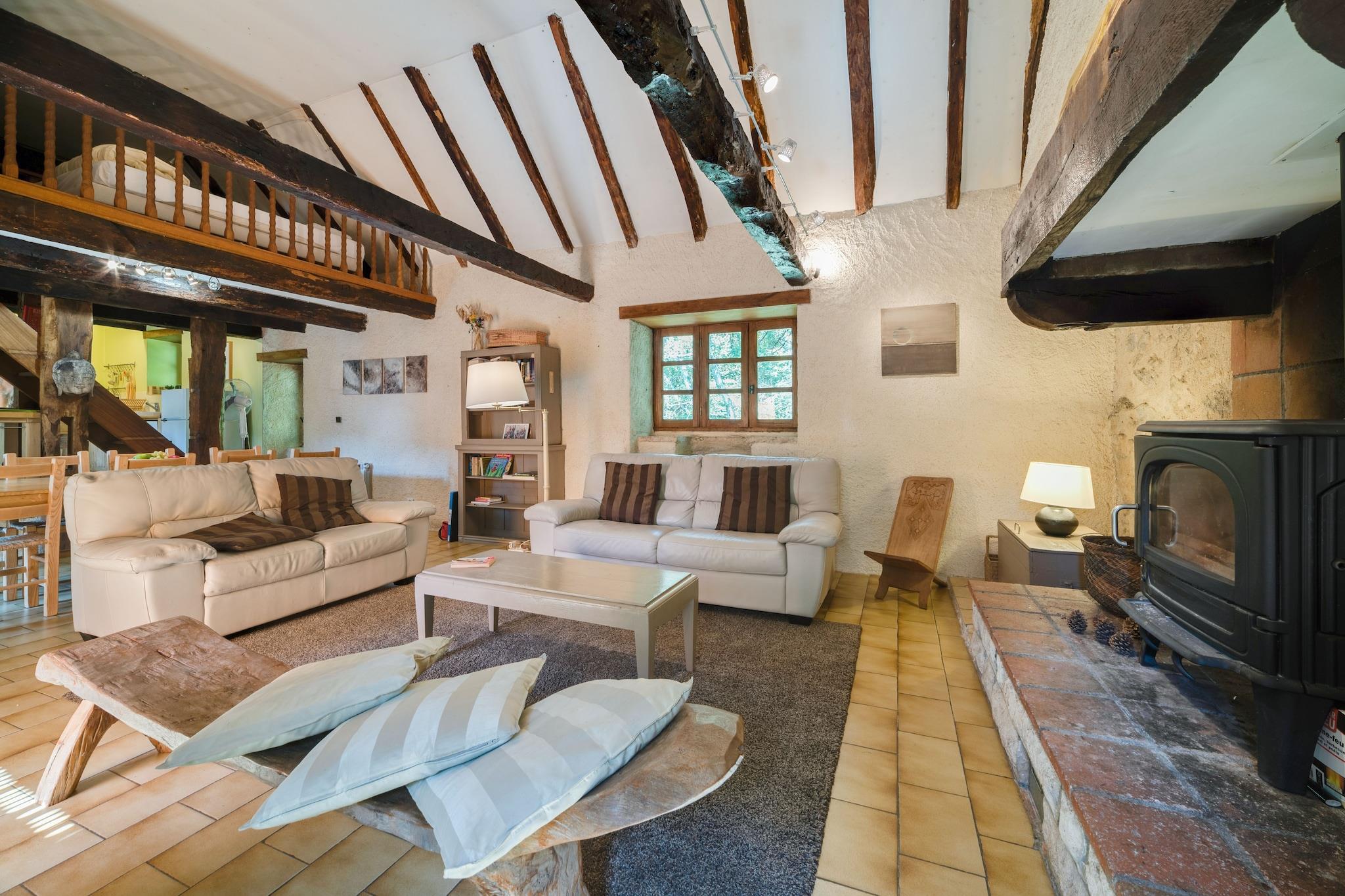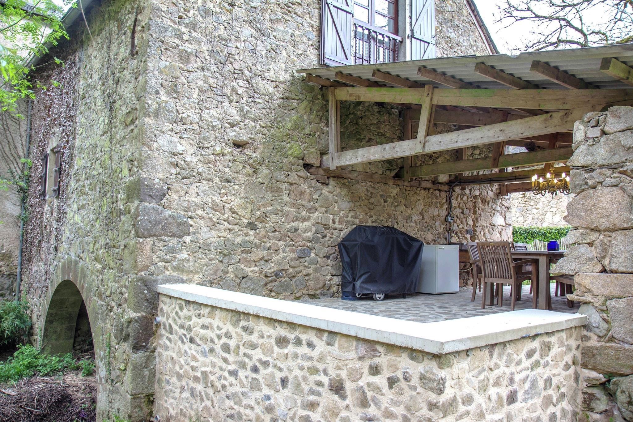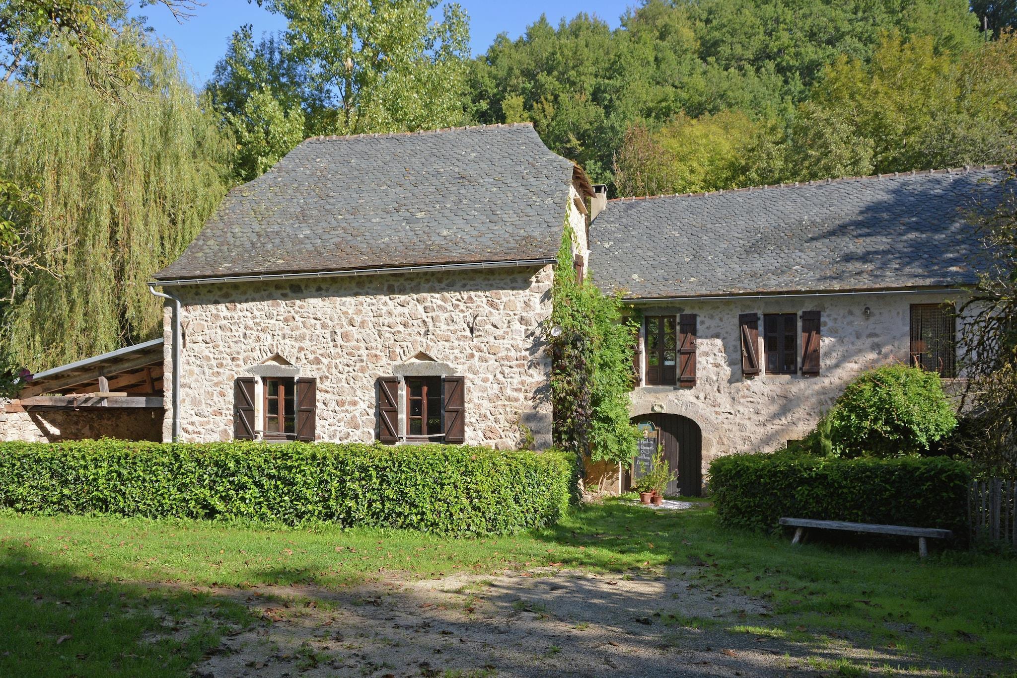 This beautifully restored water mill in Brandonnet offers a serene escape for up to six guests. Nestled in a sunny valley along a gentle river, the mansion blends rustic charm with modern comforts. The property features a heated swimming pool, a covered terrace, and a newly added outdoor kitchen-perfect for warm summer evenings. Inside, the older east wing showcases a cozy living room with a fireplace and exposed oak beams, a kitchen, and a mezzanine. The west wing includes a spacious studio, two bedrooms, a bathroom, and a toilet. A gallery above the living room holds a double bed, adding to the unique layout. Children will love the attic playroom and the secure garden, while adults can enjoy walks to nearby medieval villages and pilgrimage trails. Located in the quiet hamlet of Le Bousquet, the mill is close to Villefranche's weekly market and surrounded by the rolling hills of the Lot and Languedoc. With an original bread oven in the barn and Wi-Fi available (though spotty), this hidden gem is ideal for families seeking peace, nature, and a touch of history.