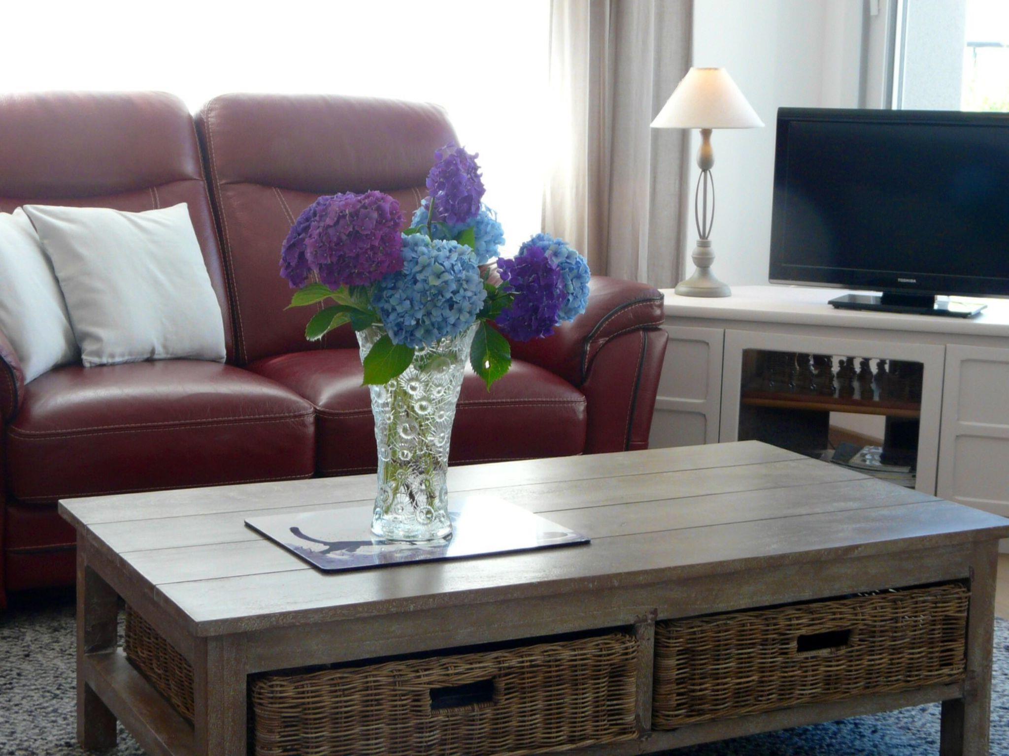 The home's 100 m² interior is surprisingly comfortable and contemporary in design. The ground floor has three bedrooms sleeping six, with two double bedrooms and one twin. A bathroom with bath and walk-in shower and two separate toilets add a touch of luxury, complemented by a functional laundry room. On the upper floor, a bright 35 m² living room with a sitting area featuring leather sofas and a fully equipped open-plan kitchen provides a pleasant living space.