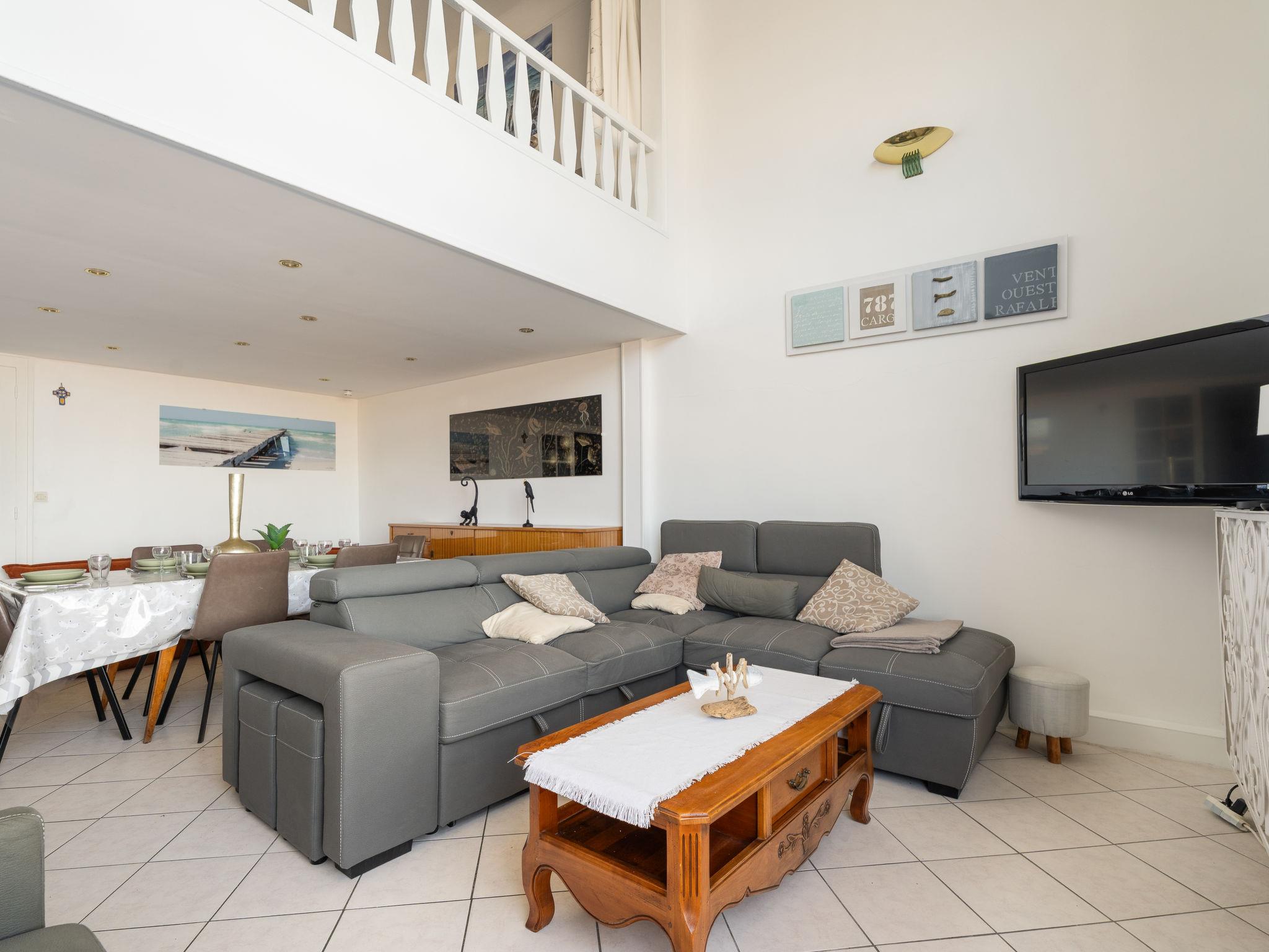 5-room apartment 104 m2 on 2 levels, on the ground floor. Entrance hall. Living/dining room with TV (flat screen). 1 room, window onto the courtyard with 2 beds (90 cm, length 190 cm), shower. Open kitchen (4 hot plates, oven, dishwasher, toaster, kettle, microwave, electric coffee machine, Capsules for coffee machine (Nespresso) extra). Sep. WC. Upper floor: 1 open room with 1 french bed (1 x 180 cm, length 200 cm). 1 open room with 1 french bed (1 x 180 cm, length 200 cm). 1 room, window onto the courtyard with 1 french bed (1 x 180 cm, length 200 cm). Bath/WC. Gas heating. Beautiful view of the sea. Facilities: washing machine. Internet (WiFi). Parking (3 cars). Please note: non-smokers only. Smoke alarm. Please note the mezzanine upstairs bedrooms have a 60 cm high railing.