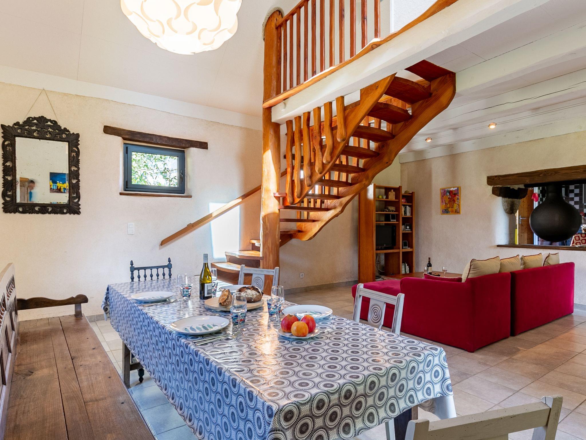 "Les Trois Baudets", 3-room house 125 m2 on 2 levels. Beautiful and cosy furnishings: living/dining room with open-hearth fireplace, dining table, TV and CD-player. Exit to the garden, to the terrace. Open kitchen (oven, dishwasher, 4 ceramic glass hob hotplates, toaster, kettle, microwave, electric coffee machine) with small dining table. Shower, sep. WC. Electric heating. Upper floor: 1 room with sloping ceilings with 2 beds (90 cm, length 200 cm). 1 room with sloping ceilings with 1 french bed (160 cm). Parquet floors. Terrace, south facing position, garden. Terrace furniture, barbecue (portable). Facilities: washing machine, iron, children's high chair, baby cot. Internet (WiFi, free). Please note: non-smoking house. Smoke alarm, fire extinguisher.